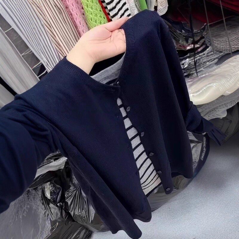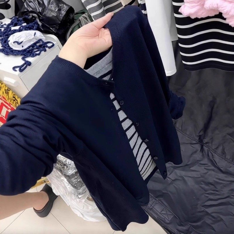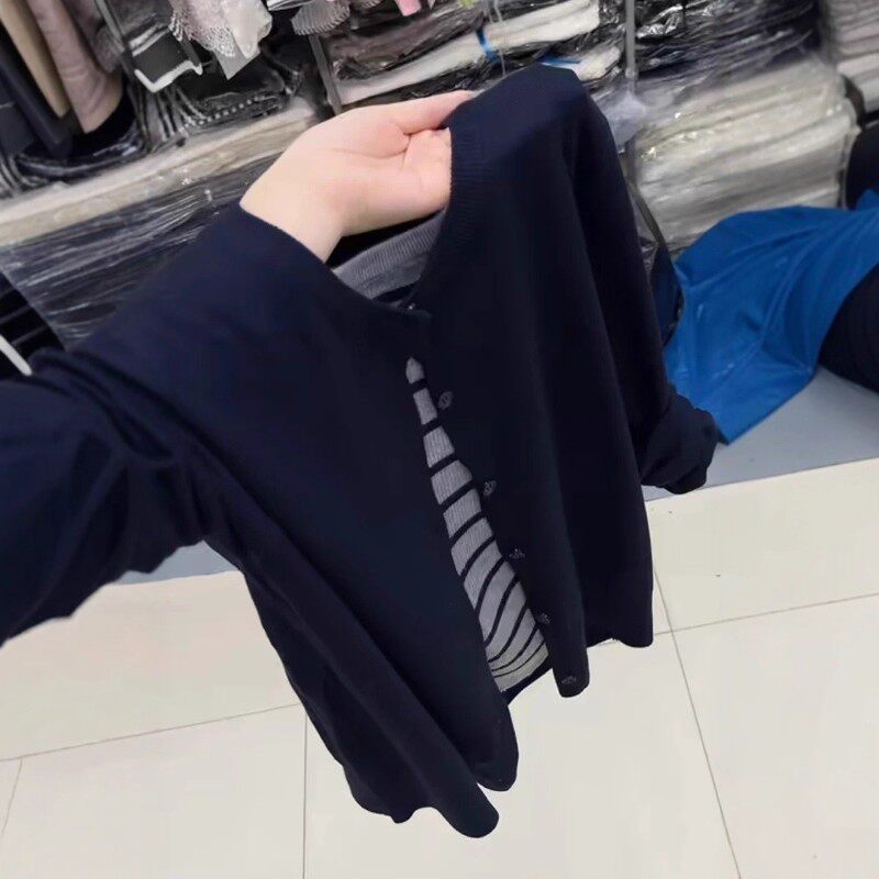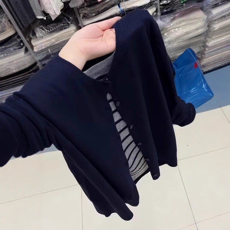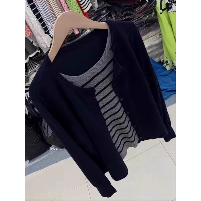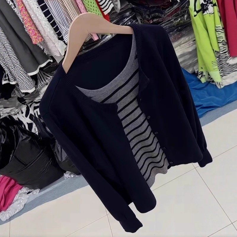 大碼撞色拼接條紋假兩件針織衫女秋季新款胖mm顯瘦超好看開衫上衣