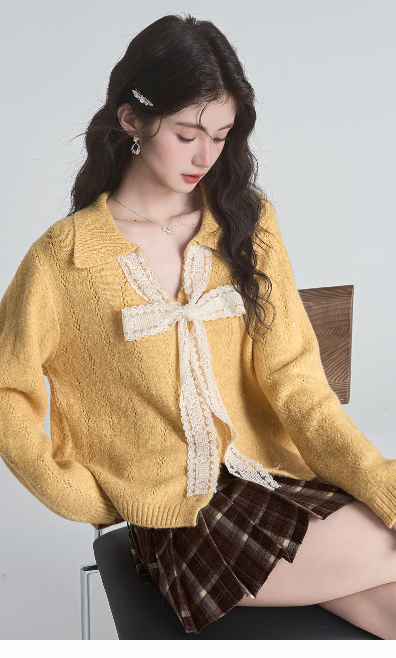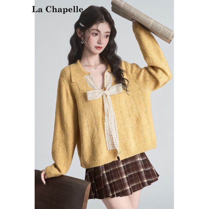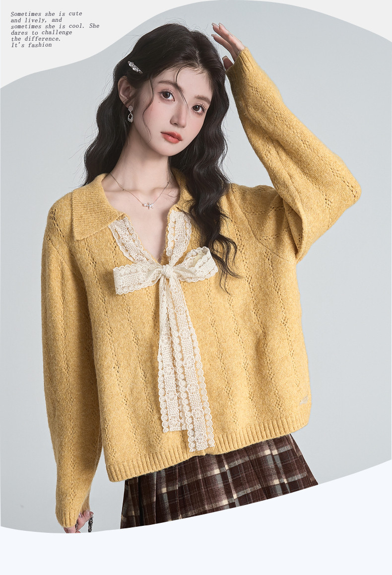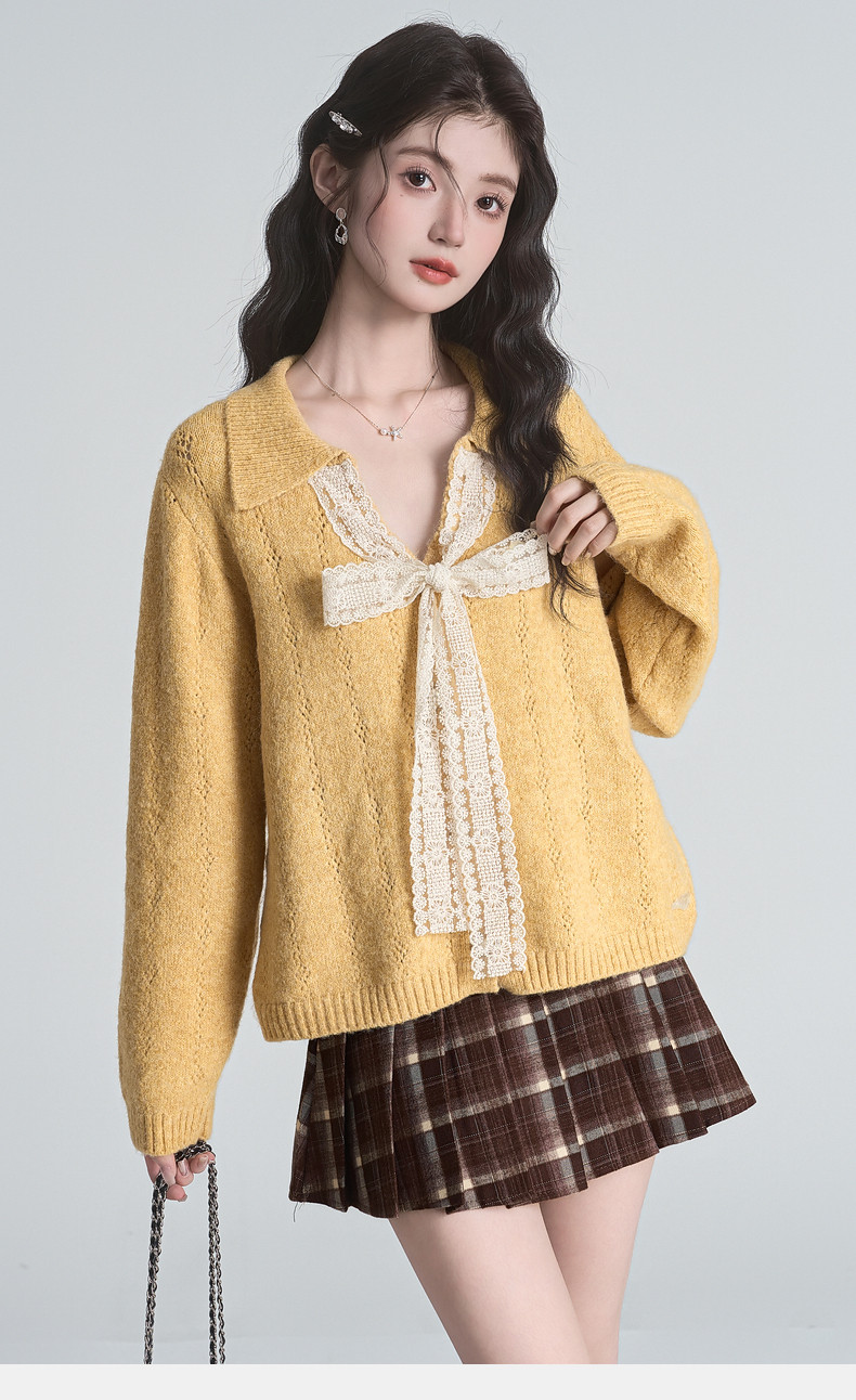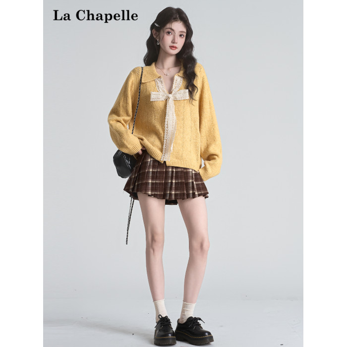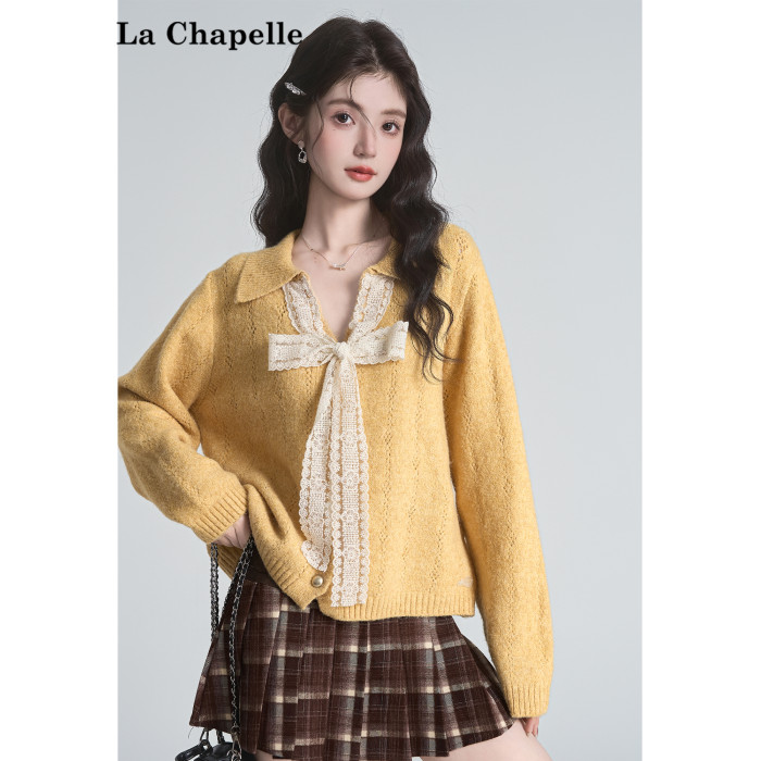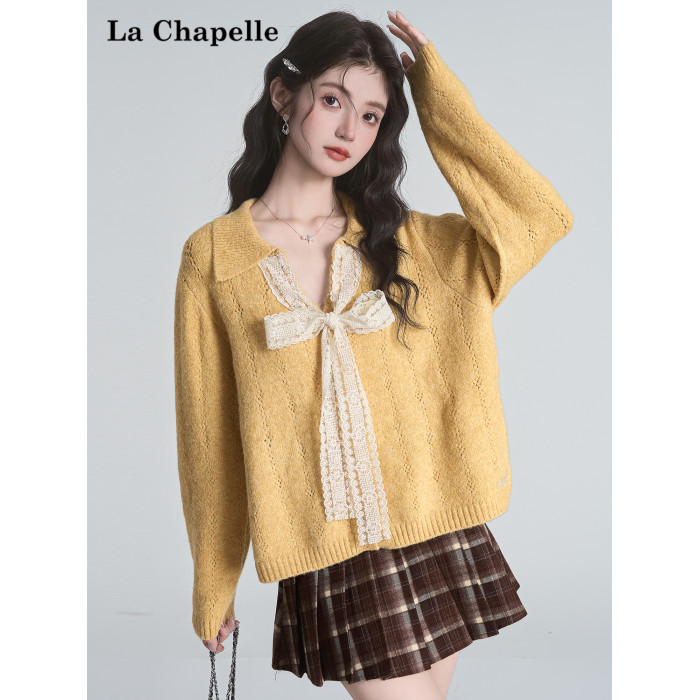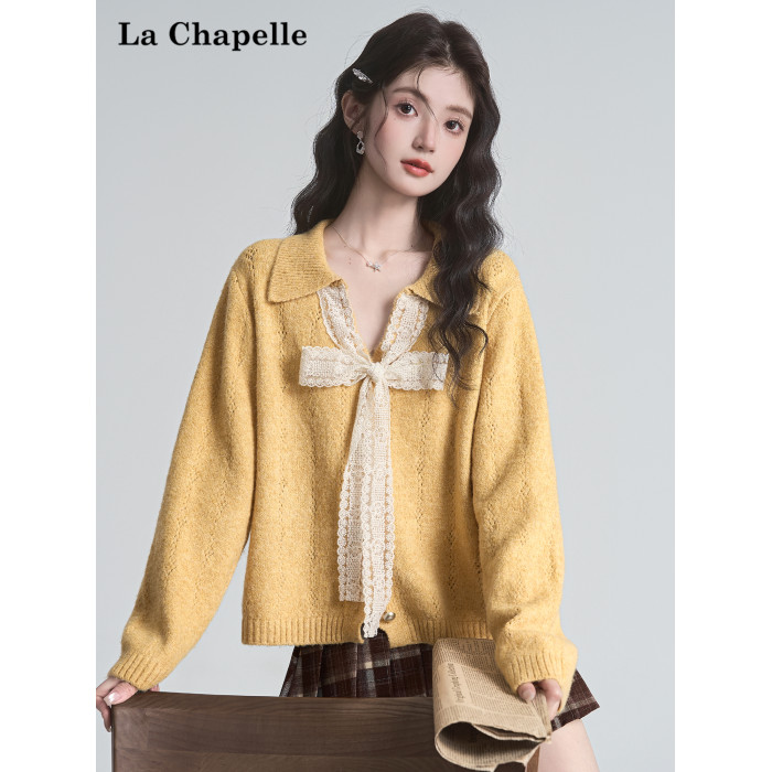 拉夏貝爾溫柔風蝴蝶結系帶黃色v領長袖針織衫女秋季毛衣翻領上衣