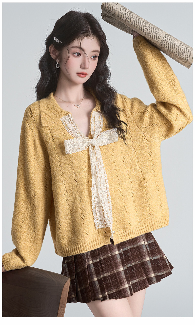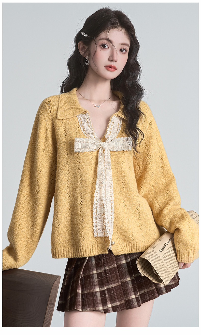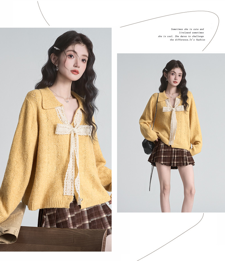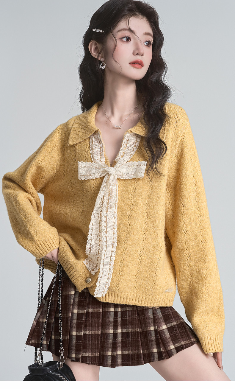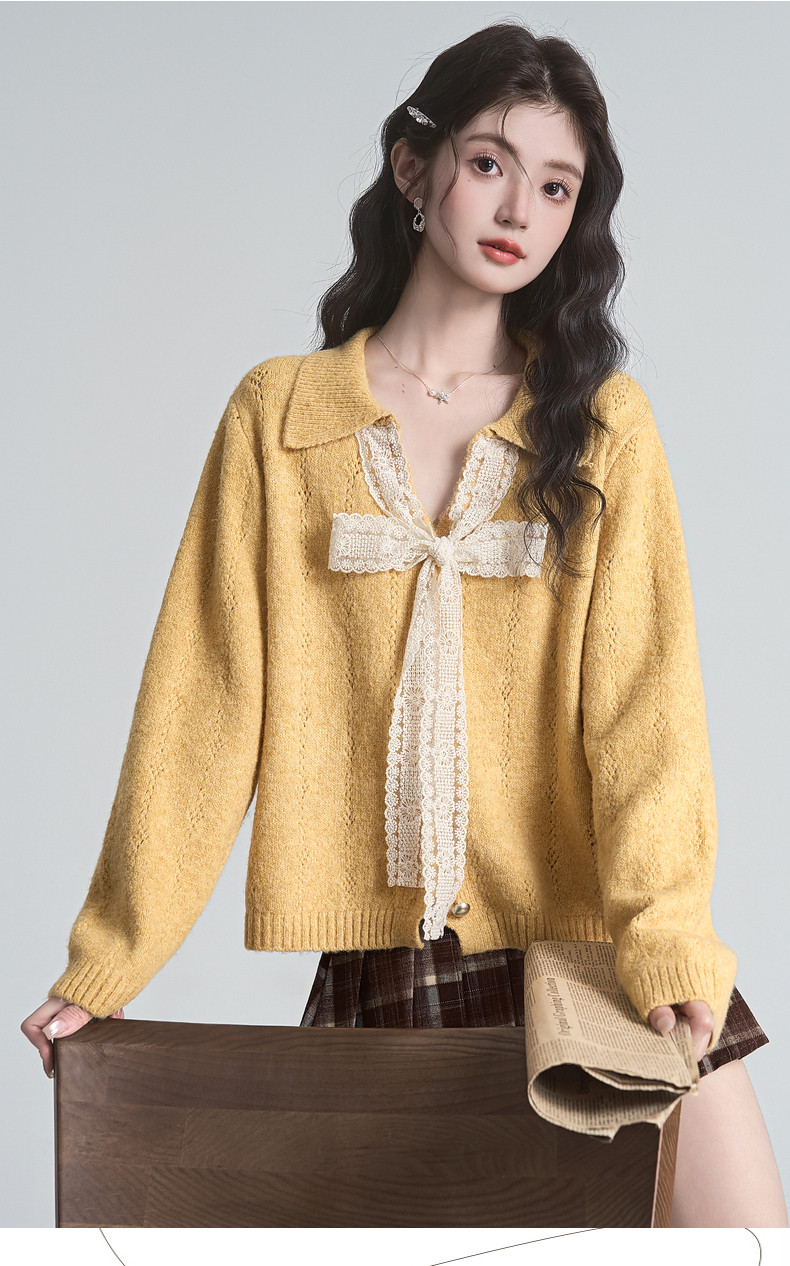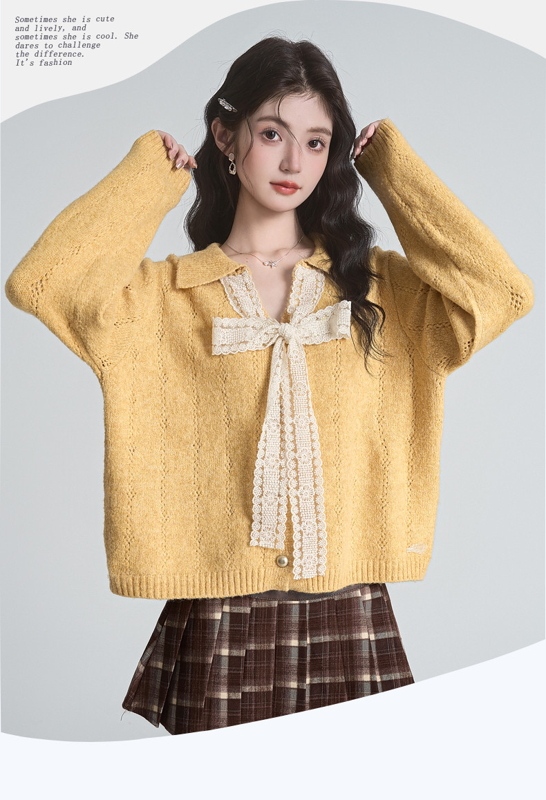 拉夏貝爾溫柔風蝴蝶結系帶黃色v領長袖針織衫女秋季毛衣翻領上衣