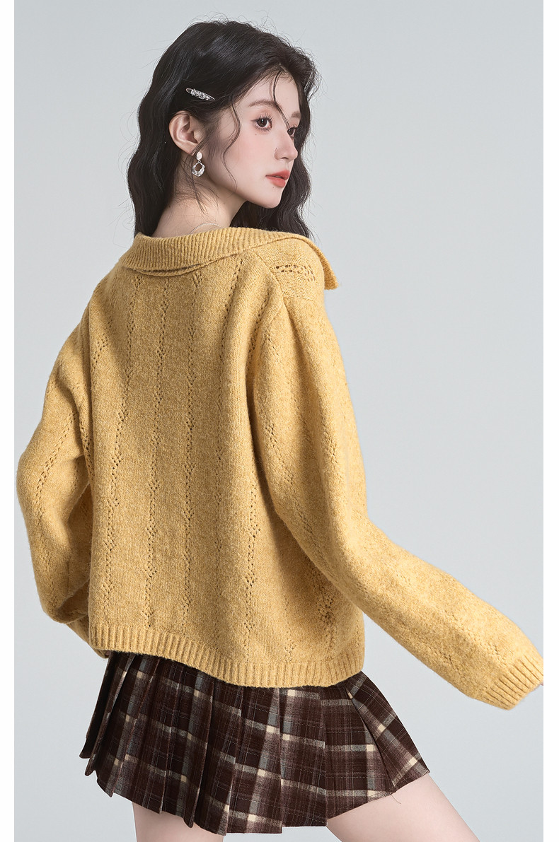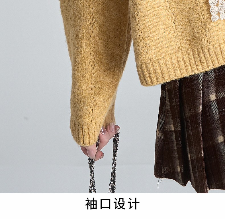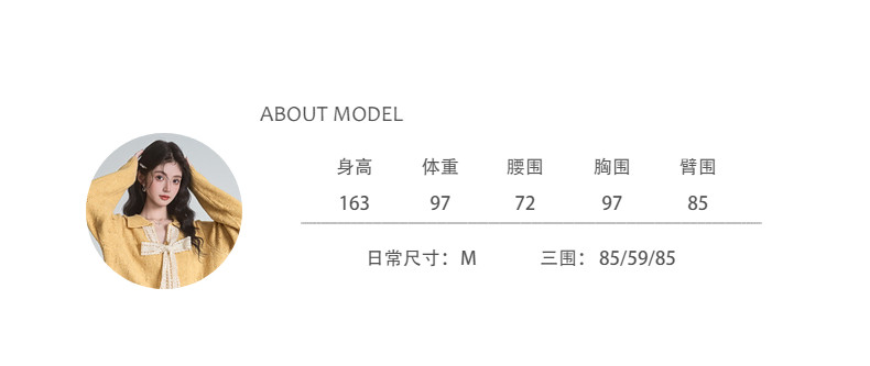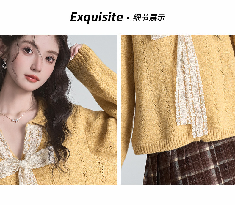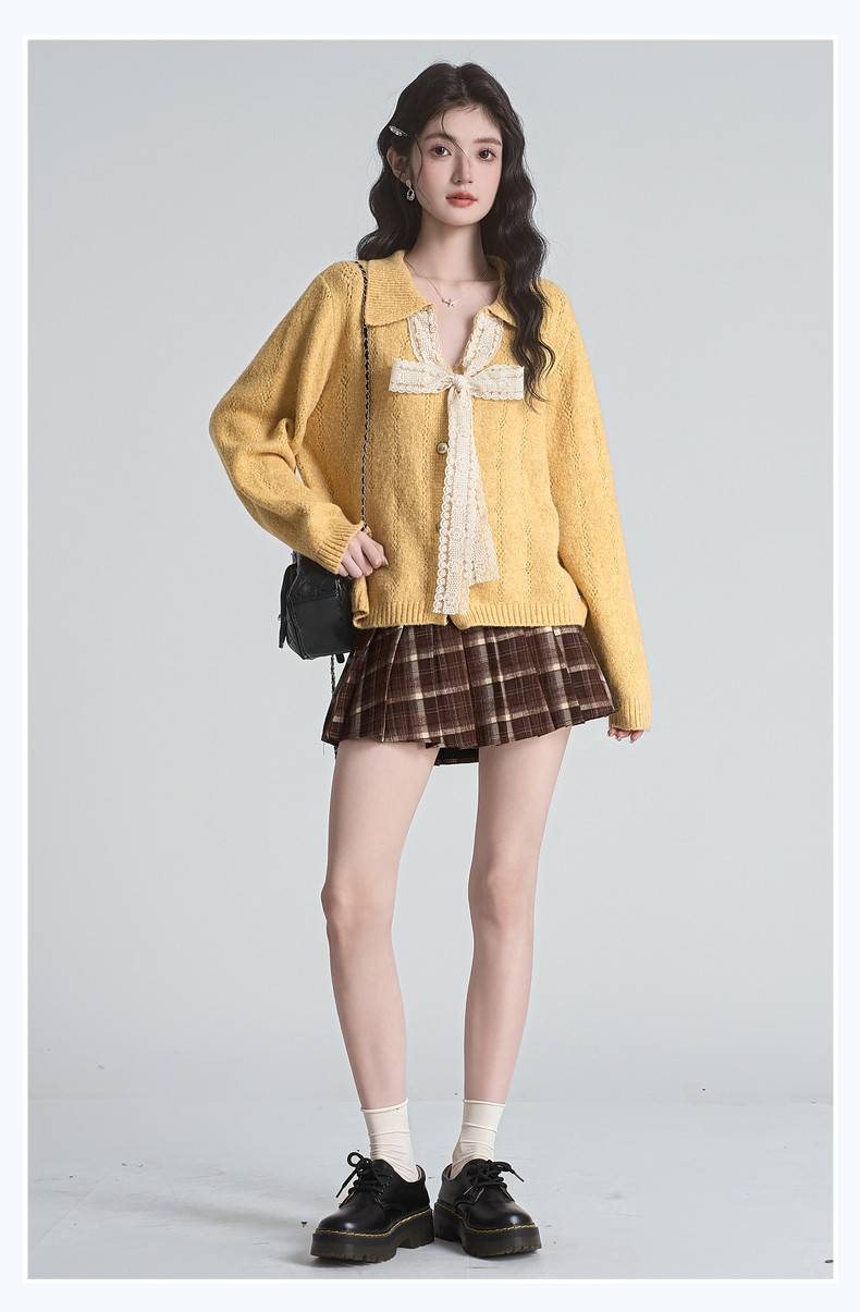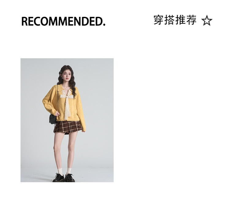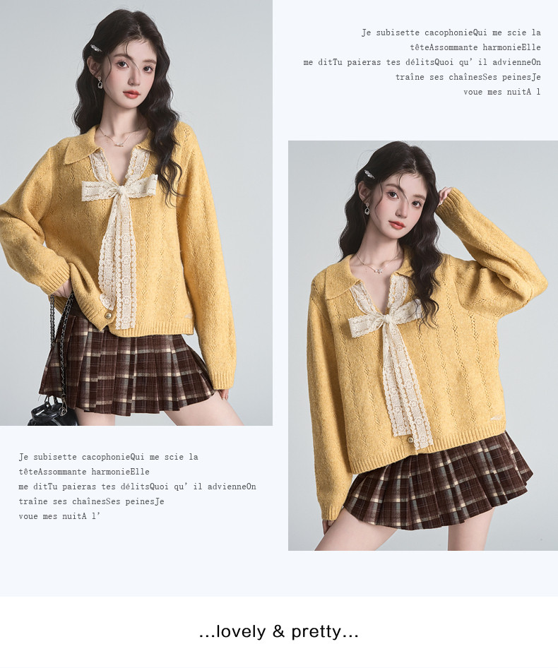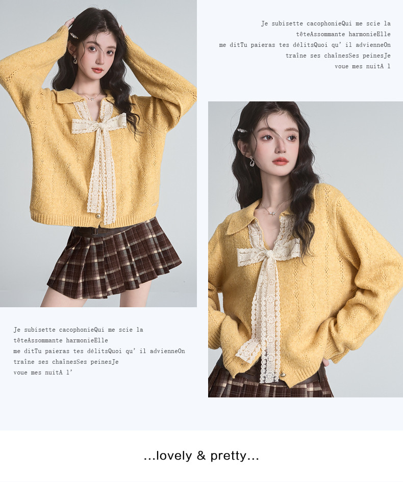 拉夏貝爾溫柔風蝴蝶結系帶黃色v領長袖針織衫女秋季毛衣翻領上衣