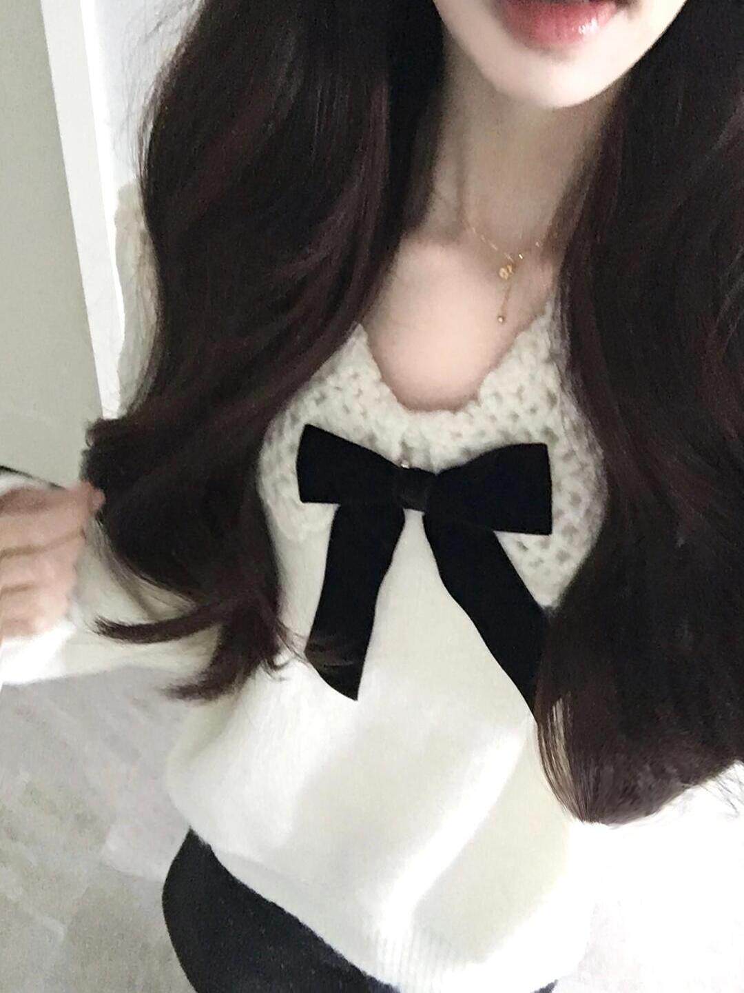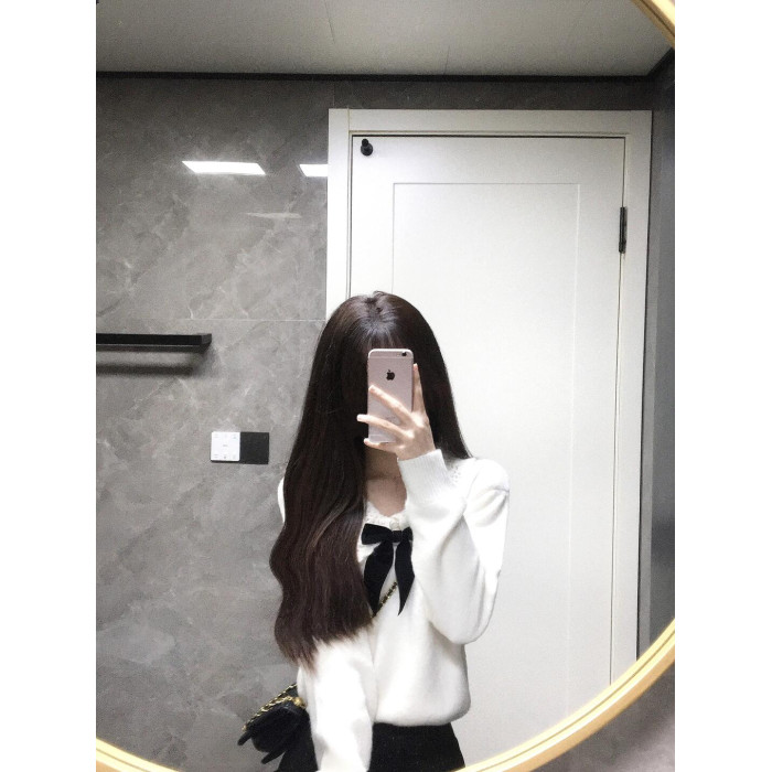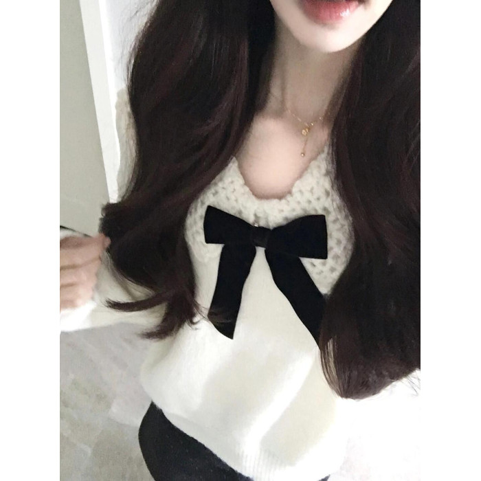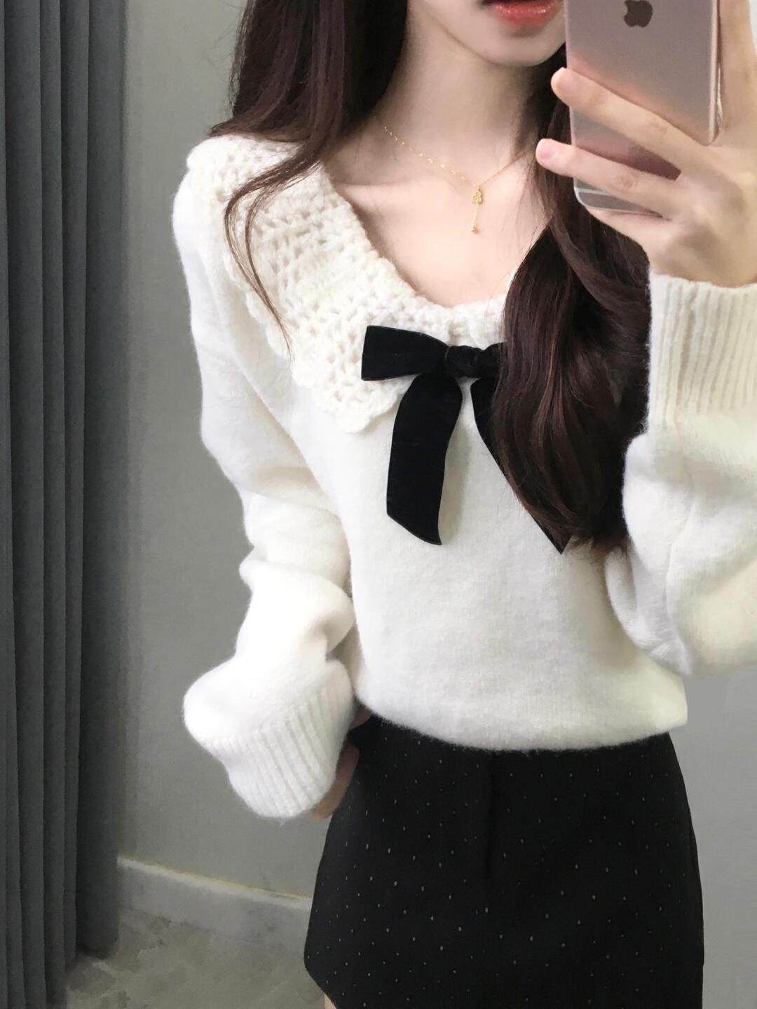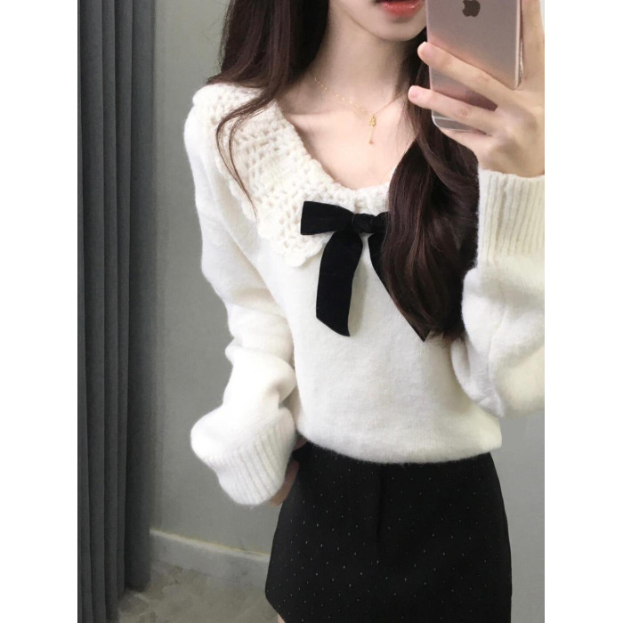白色溫柔蝴蝶結娃娃領針織衫毛衣女秋冬軟糯寬松減齡設計感上衣