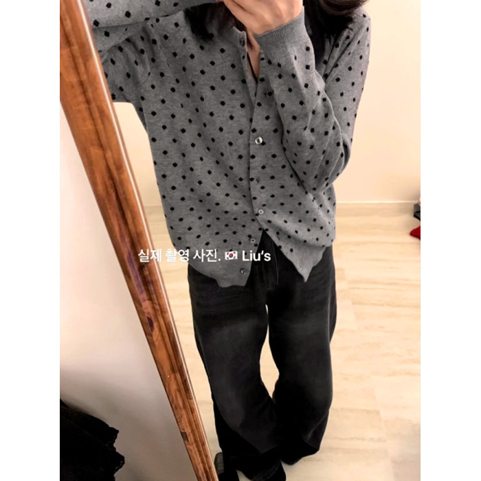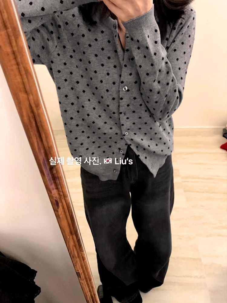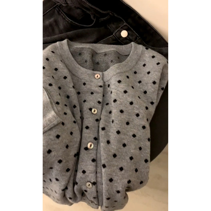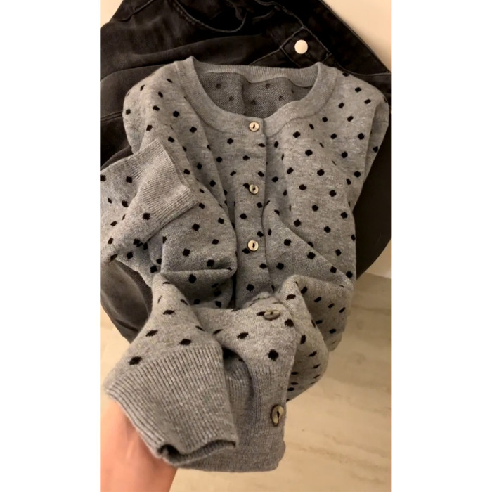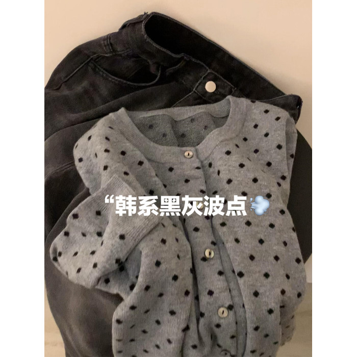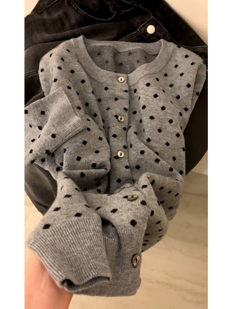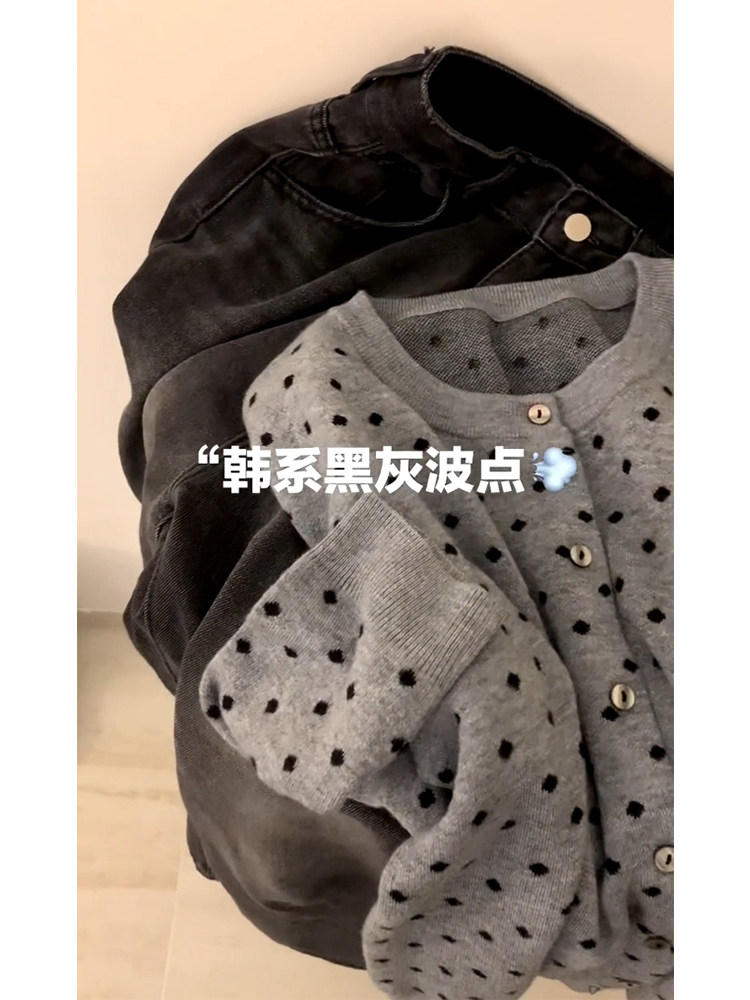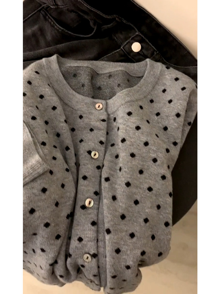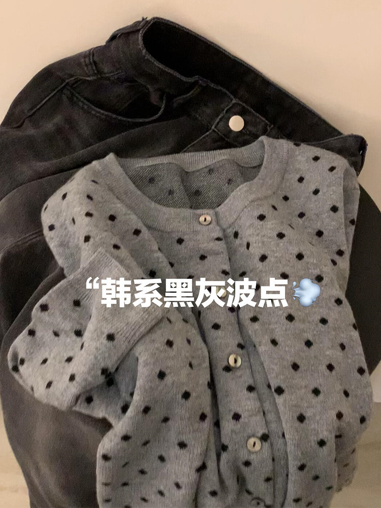 復古灰色波點針織開衫女2025秋外搭薄款毛衣外套韓系短款上衣秋冬