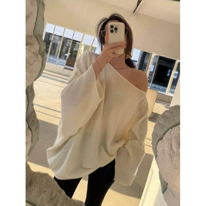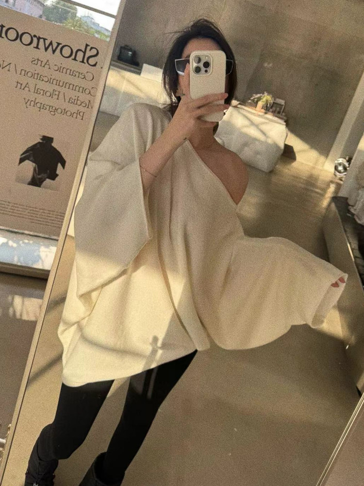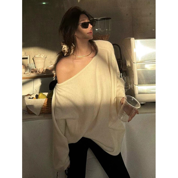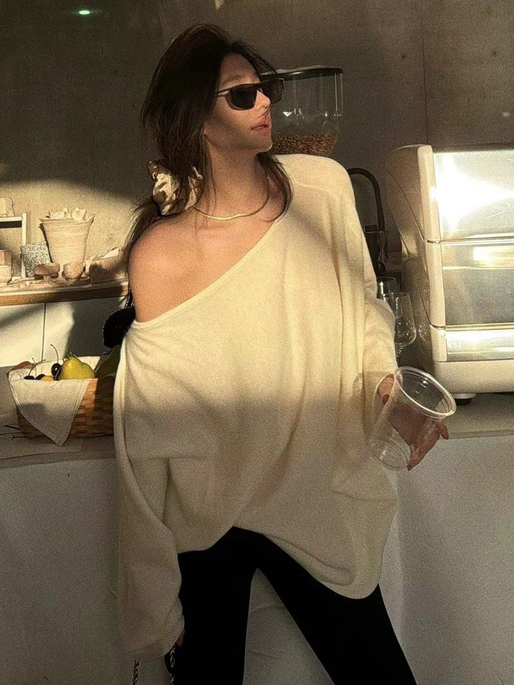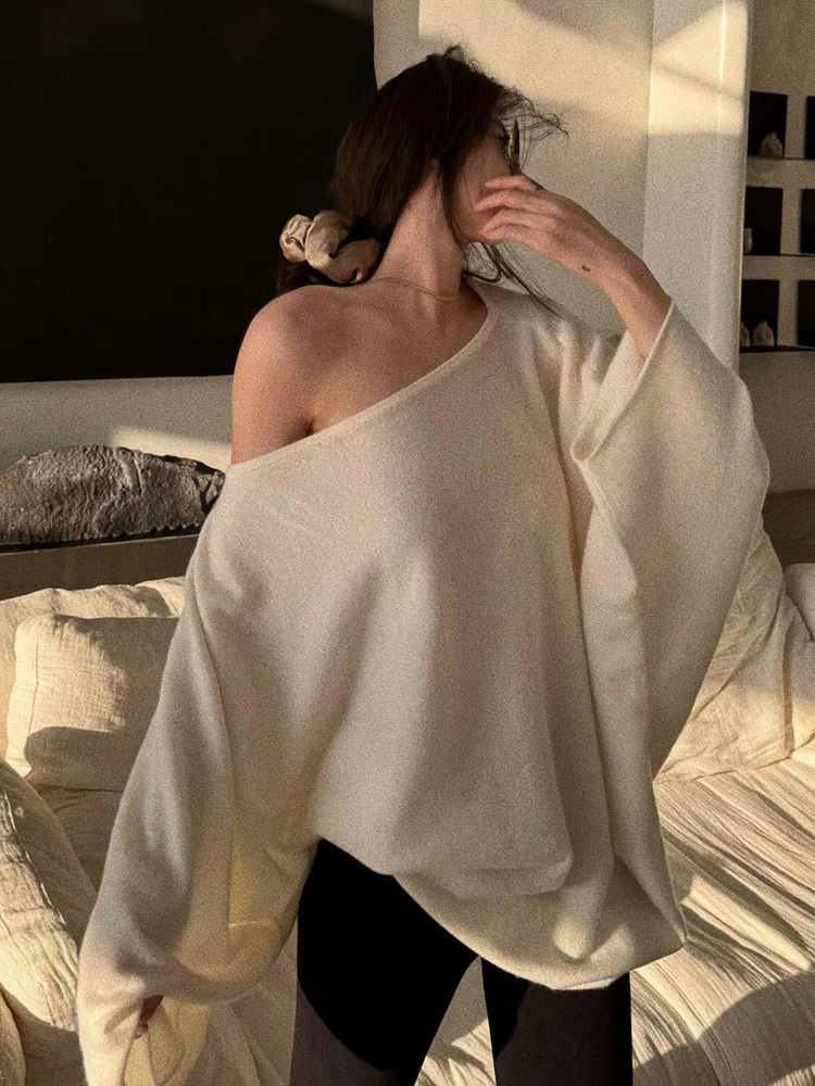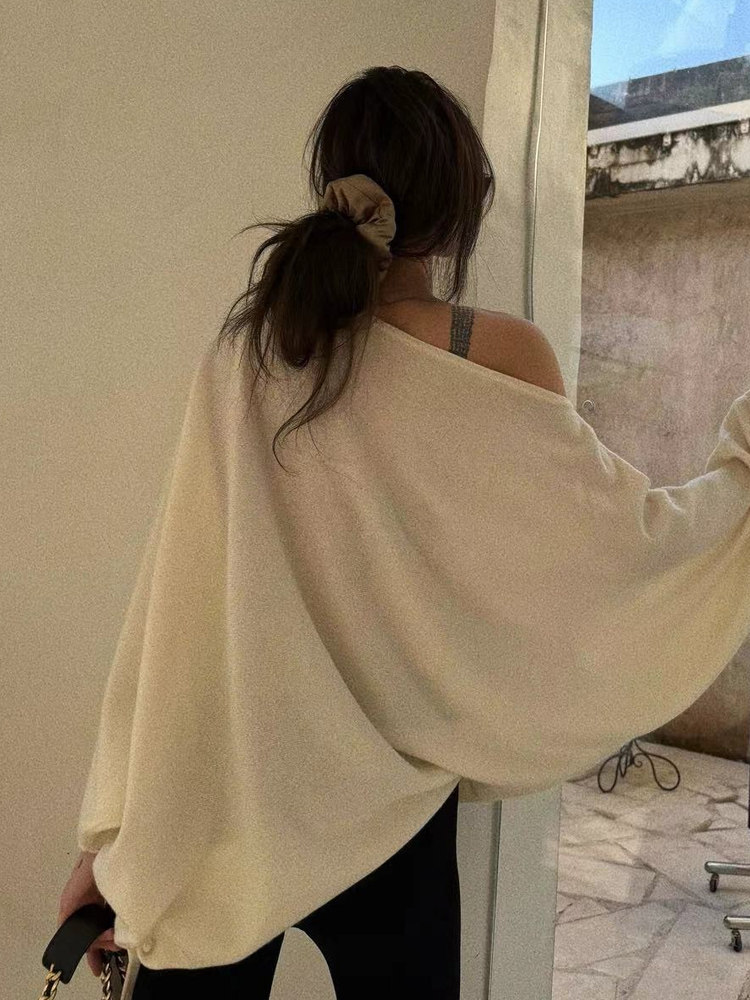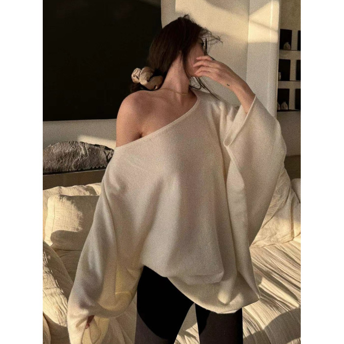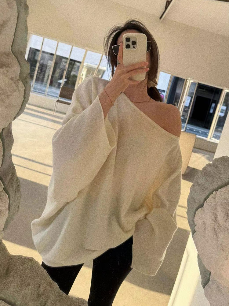 韓版斜領長袖針織衫女春秋薄款寬松慵懶風顯瘦百搭高級感露肩上衣