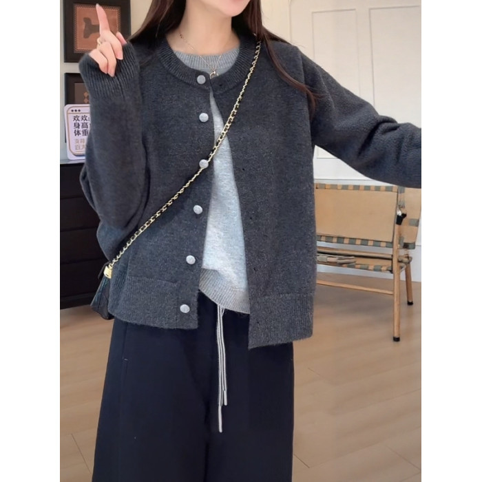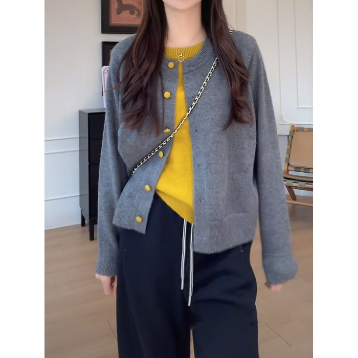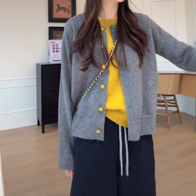 大碼女裝撞色假兩件針織開衫長袖秋季胖mm顯瘦寬松韓版慵懶風上衣