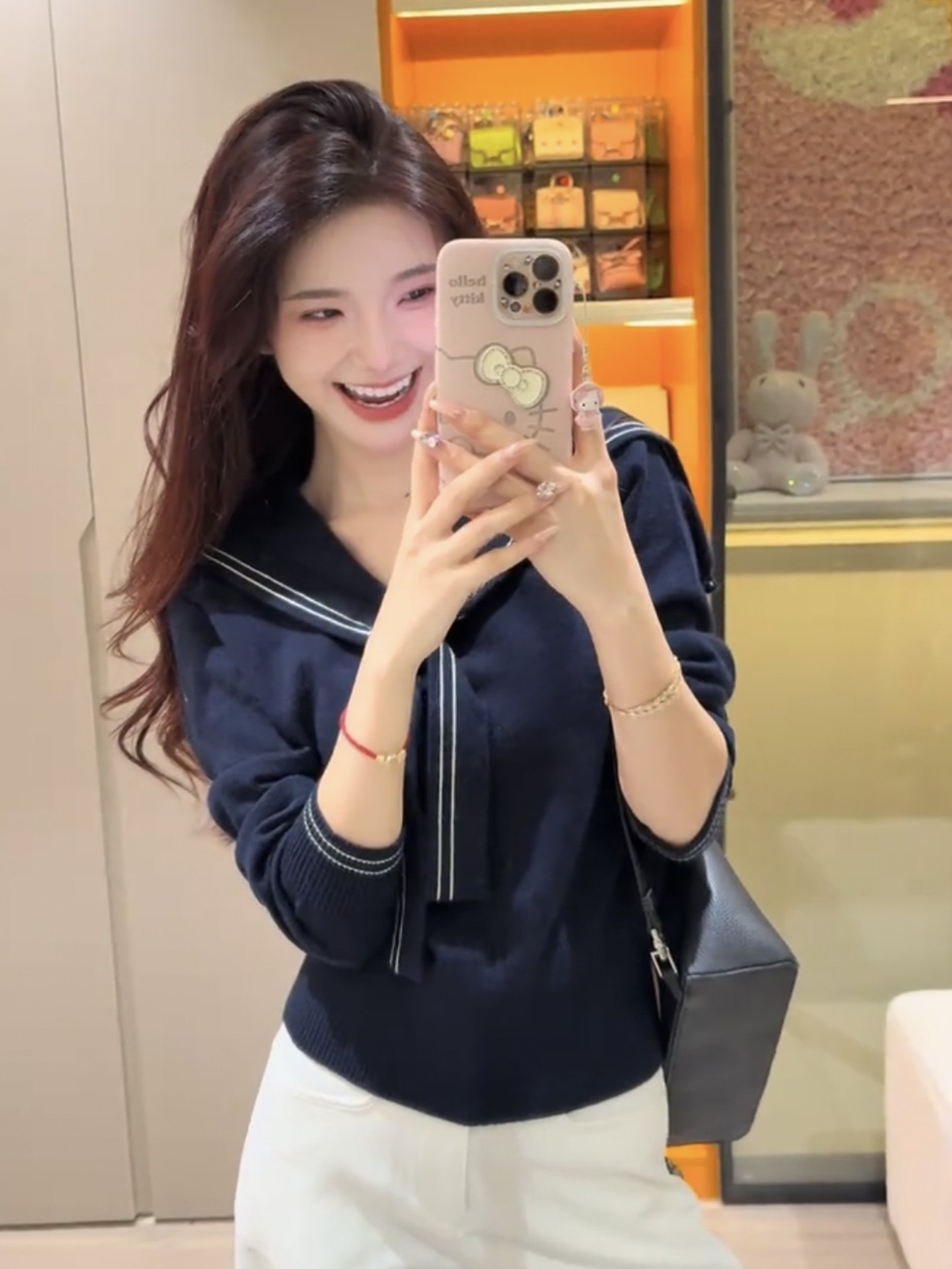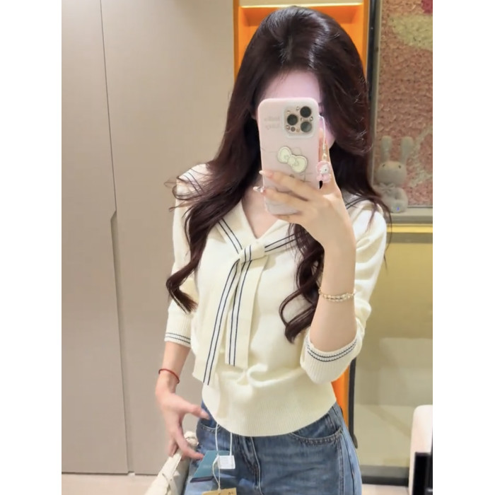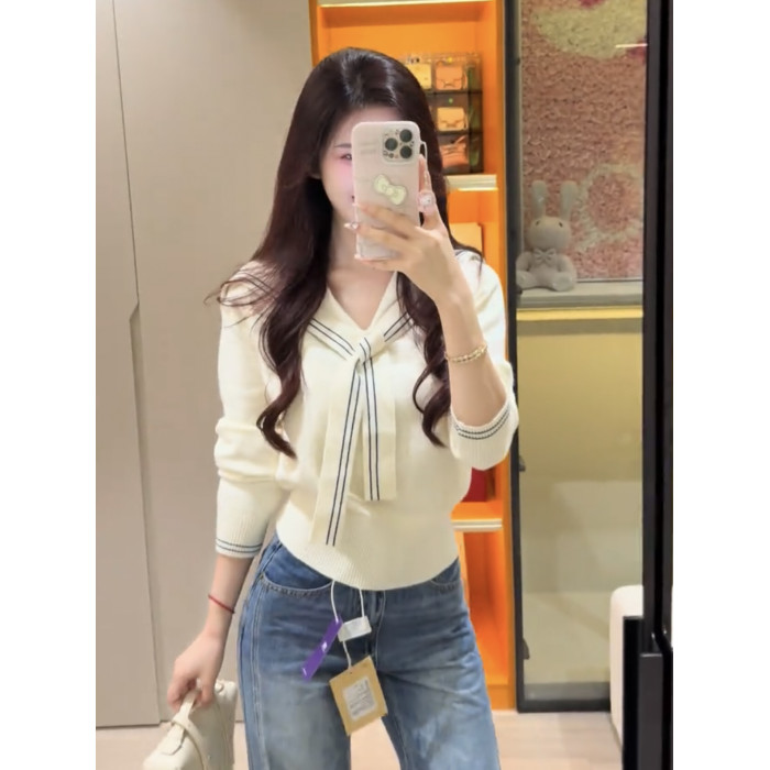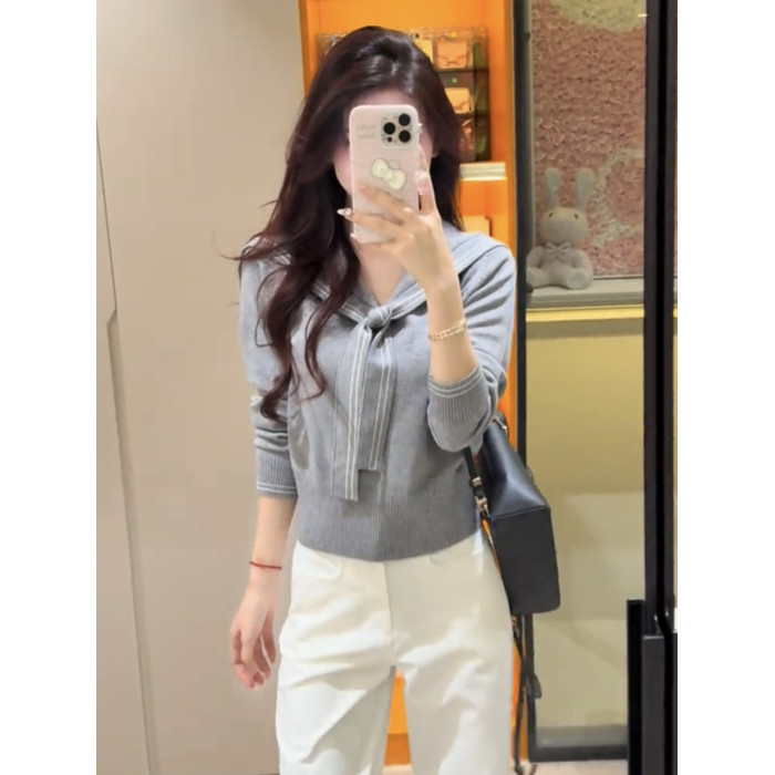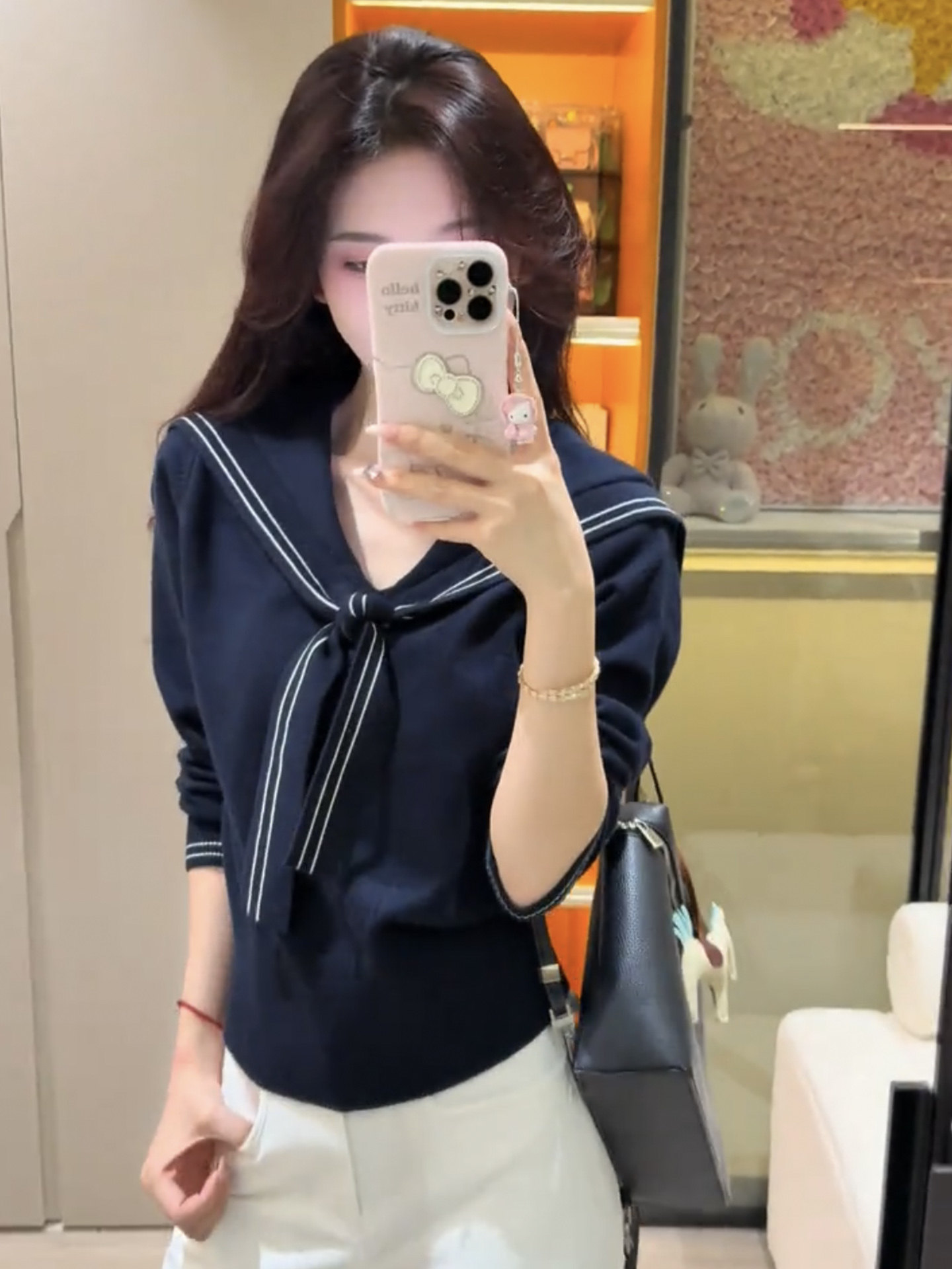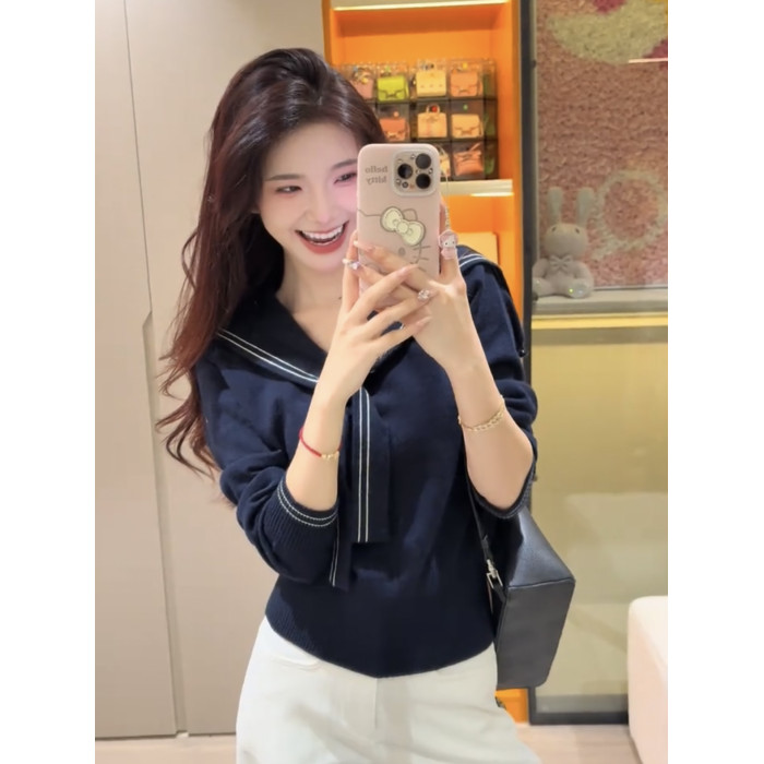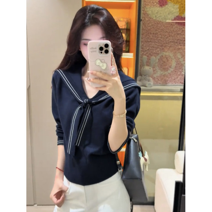 韓系海軍領披肩長袖針織衫女2025秋冬新款高級感內搭顯瘦百搭上衣