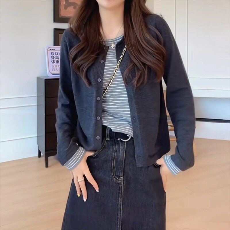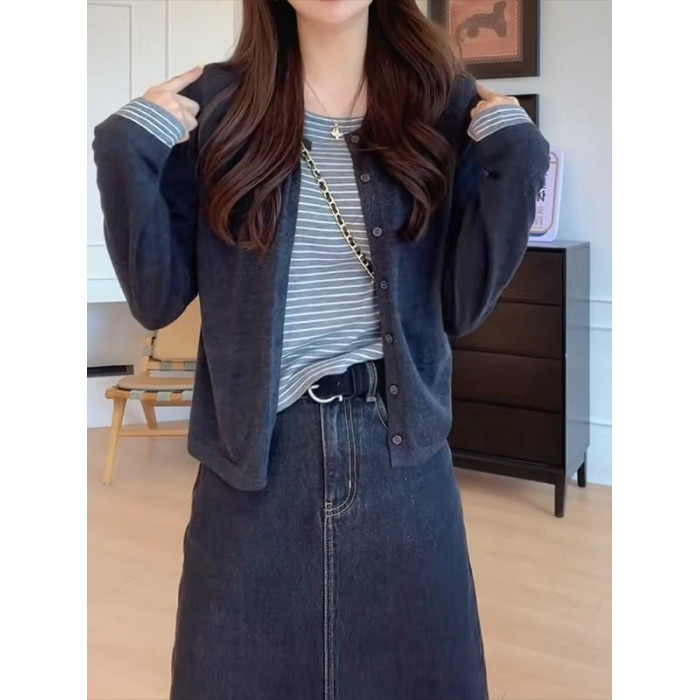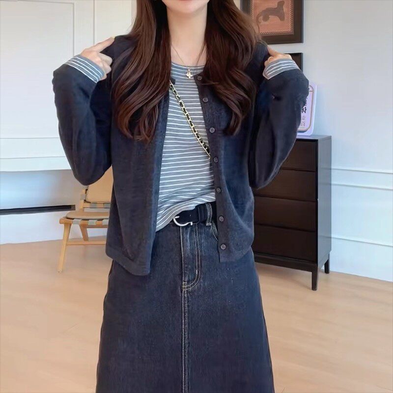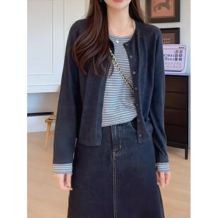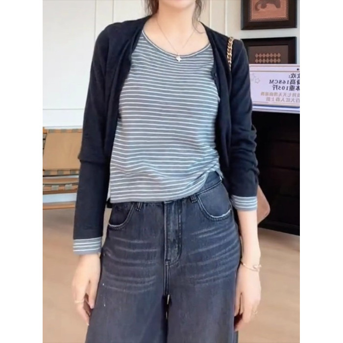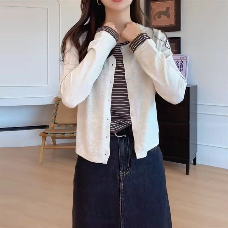 大碼胖mm早秋穿搭假兩件拼接條紋針織衫2025新款顯瘦洋氣開衫上衣