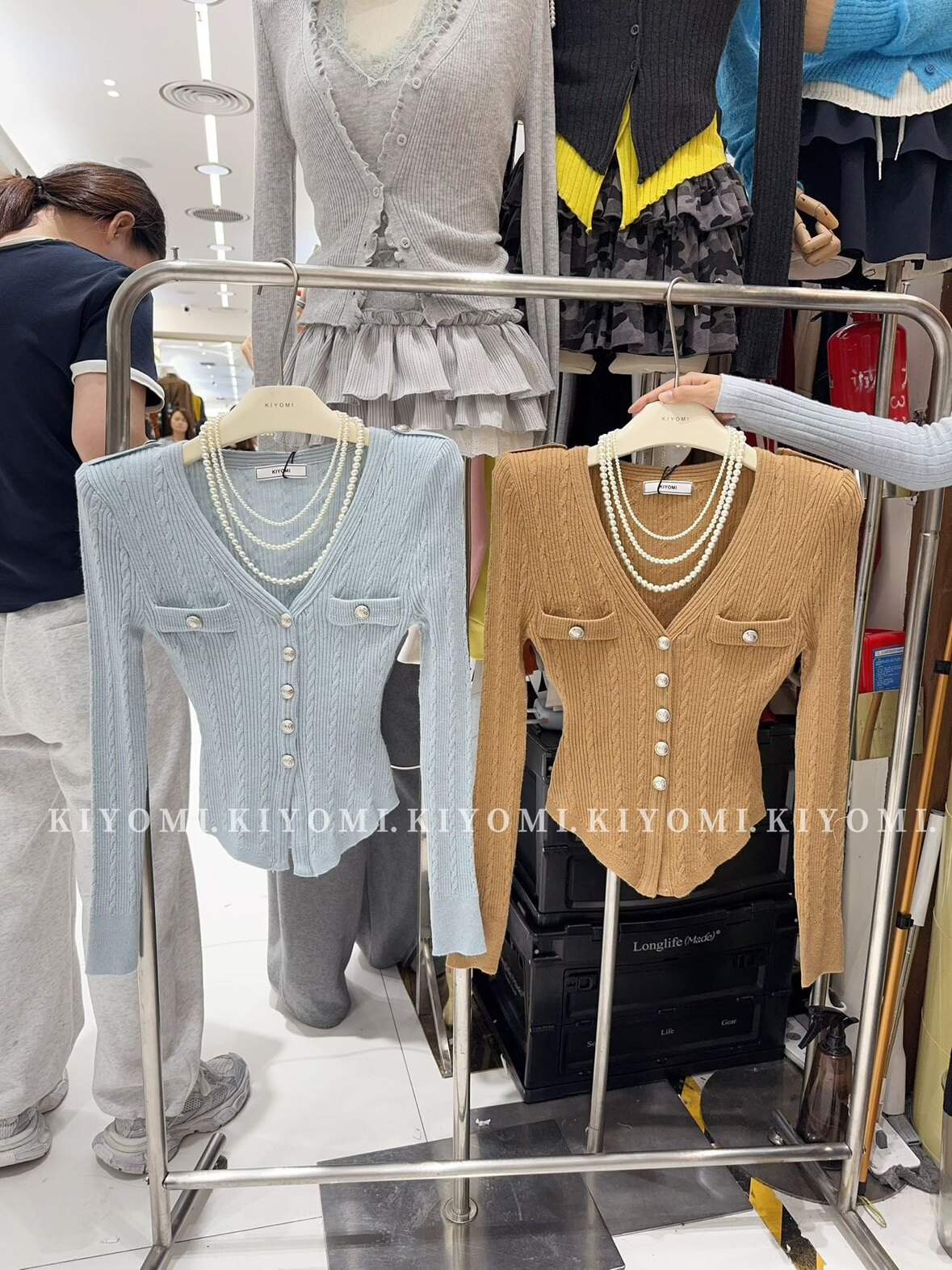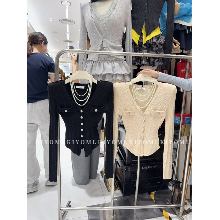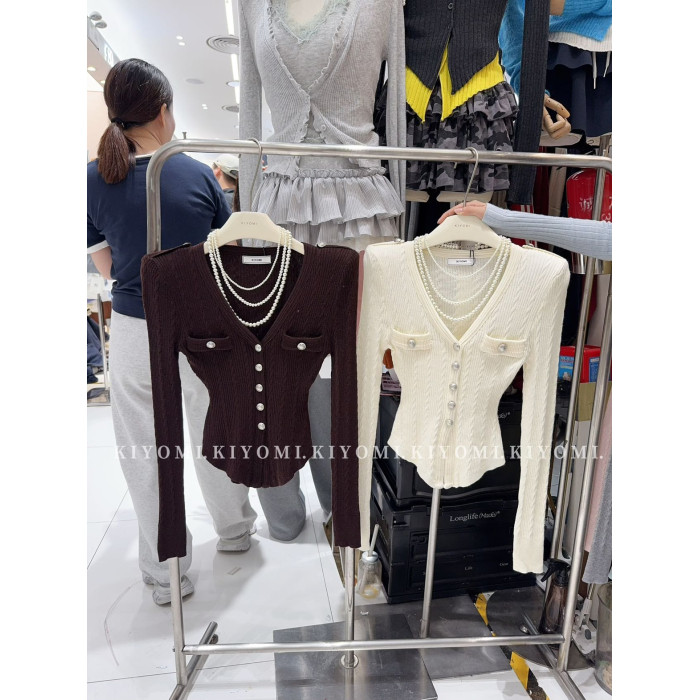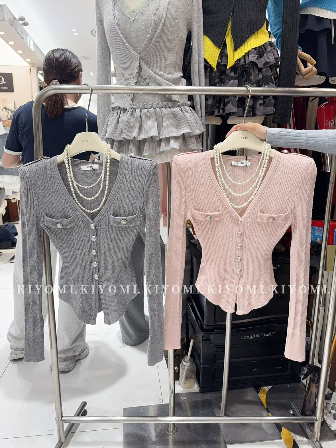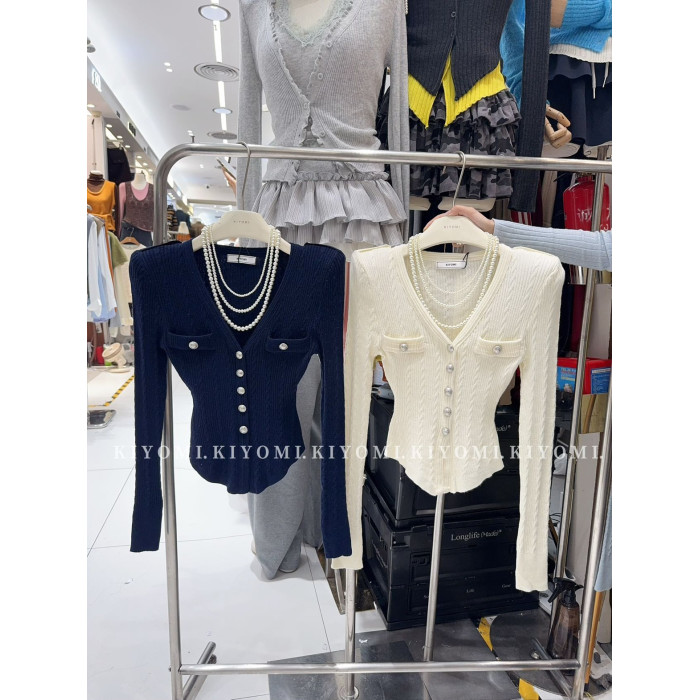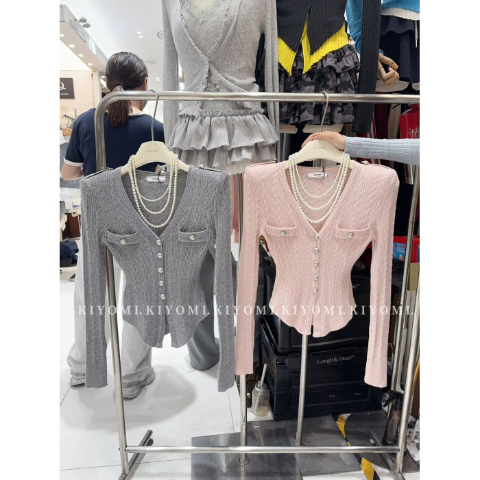 ~KIYOMI實拍韓版純欲辣妹V領巴曼風英倫金屬釦墊肩顯瘦針織衫