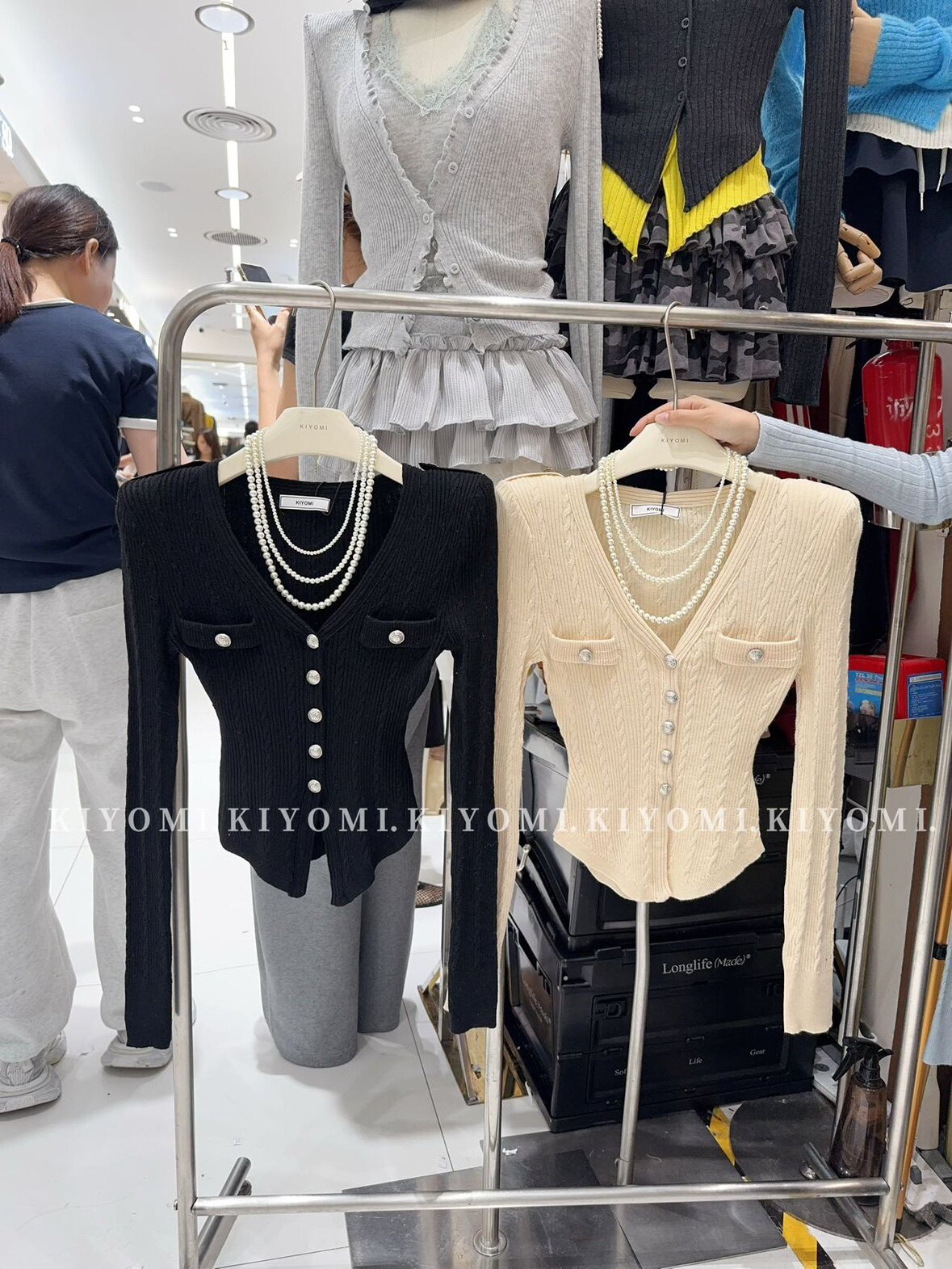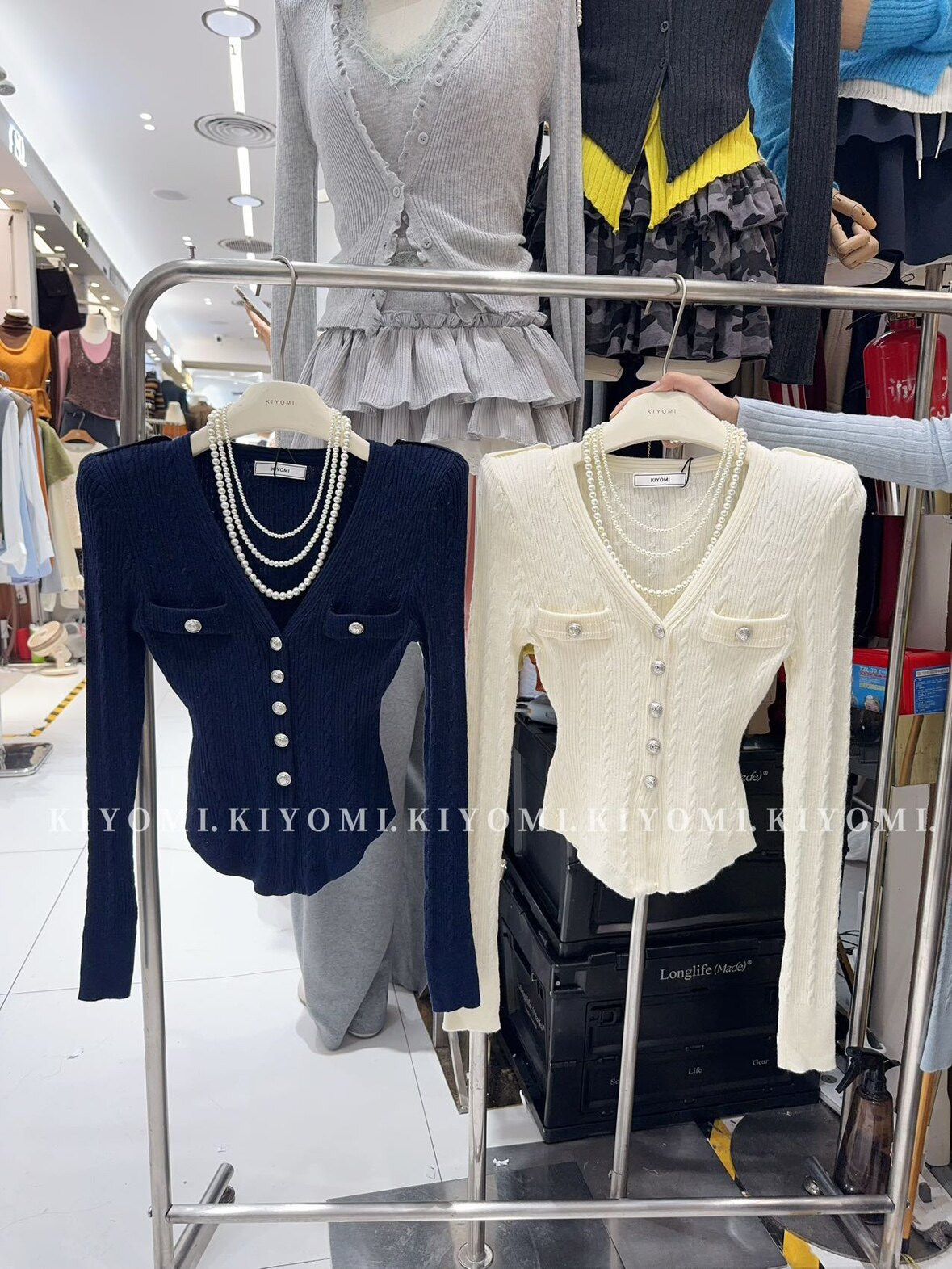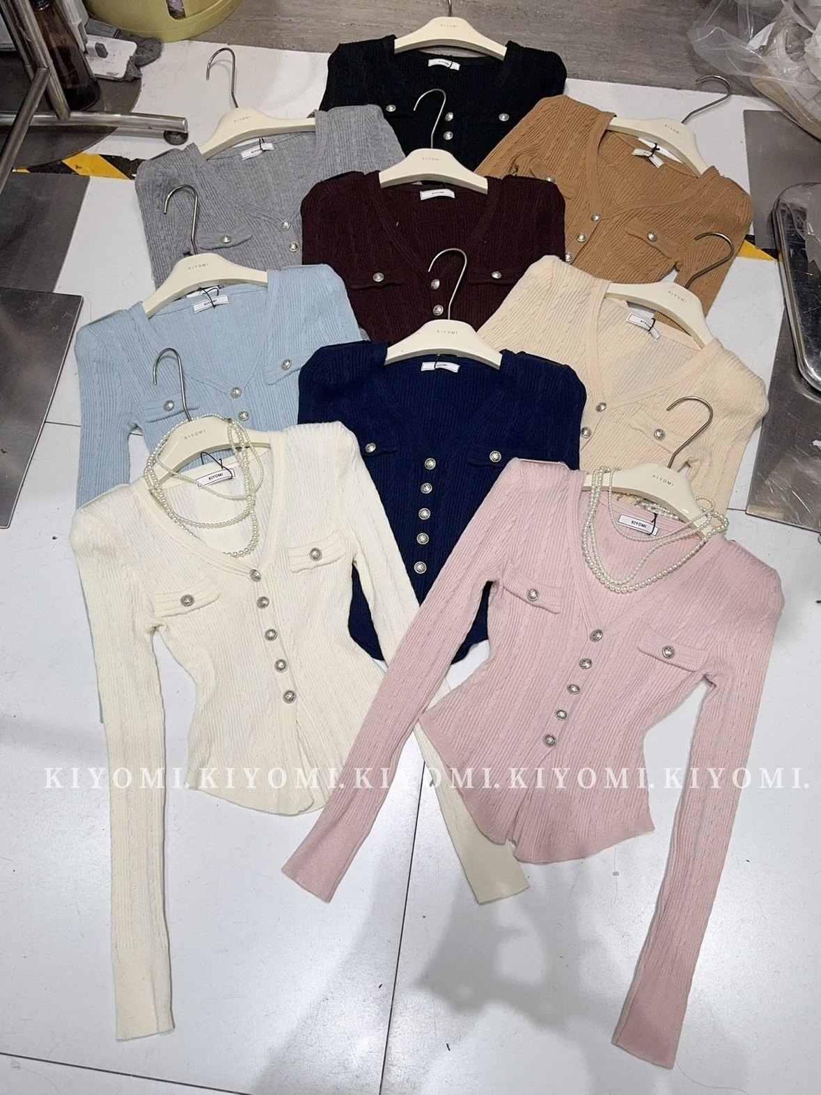 ~KIYOMI實拍韓版純欲辣妹V領巴曼風英倫金屬釦墊肩顯瘦針織衫