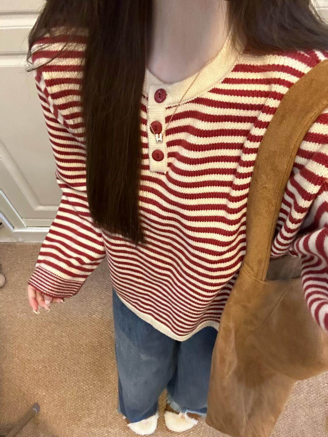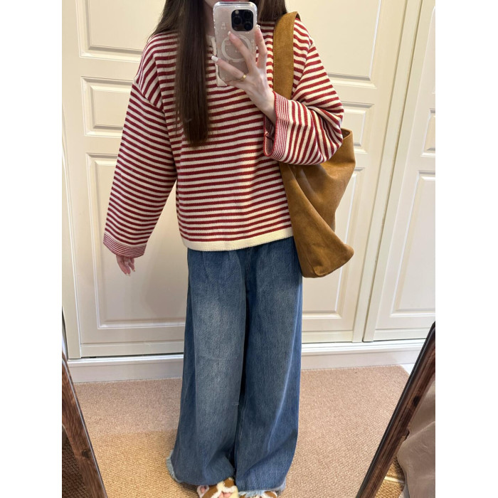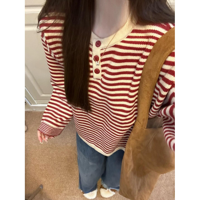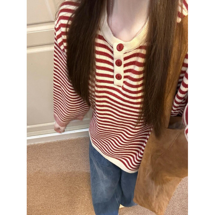 慵嬾感紅色條紋撞色針織上衣秋季穿搭寬鬆毛衣女秋冬2025新款爆款