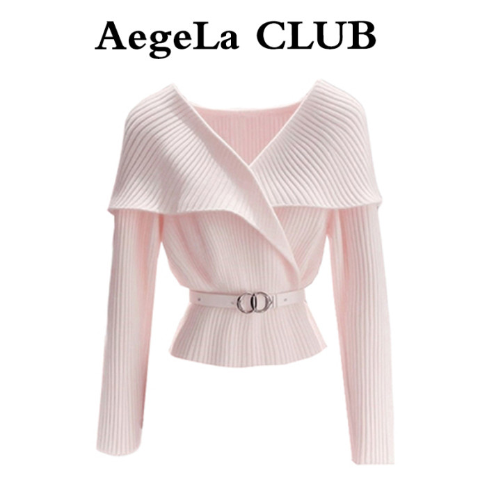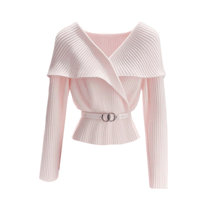 慵懶風春秋設計感粉色短款毛衣女2025新款翻領收腰長袖針織衫上衣
