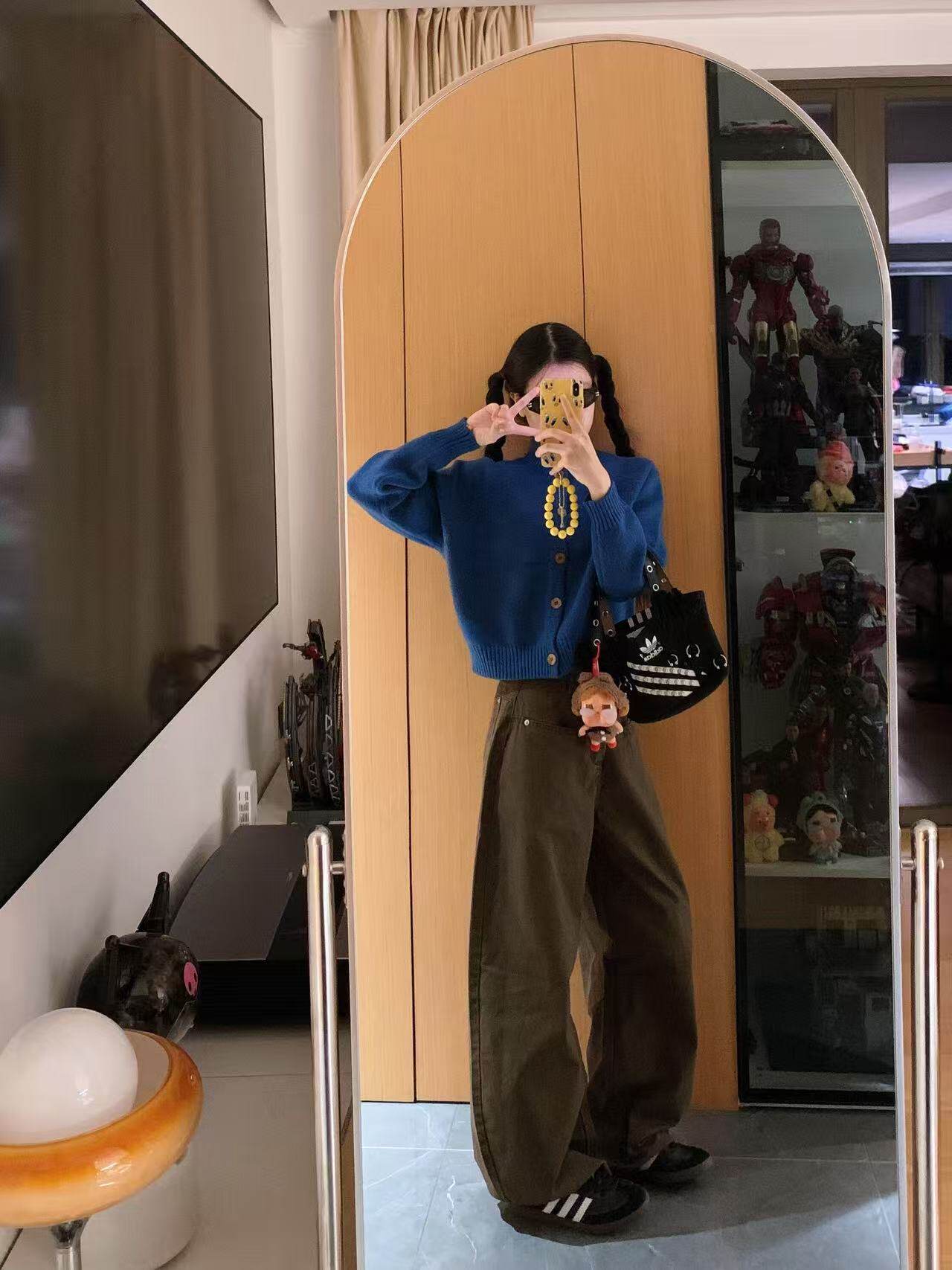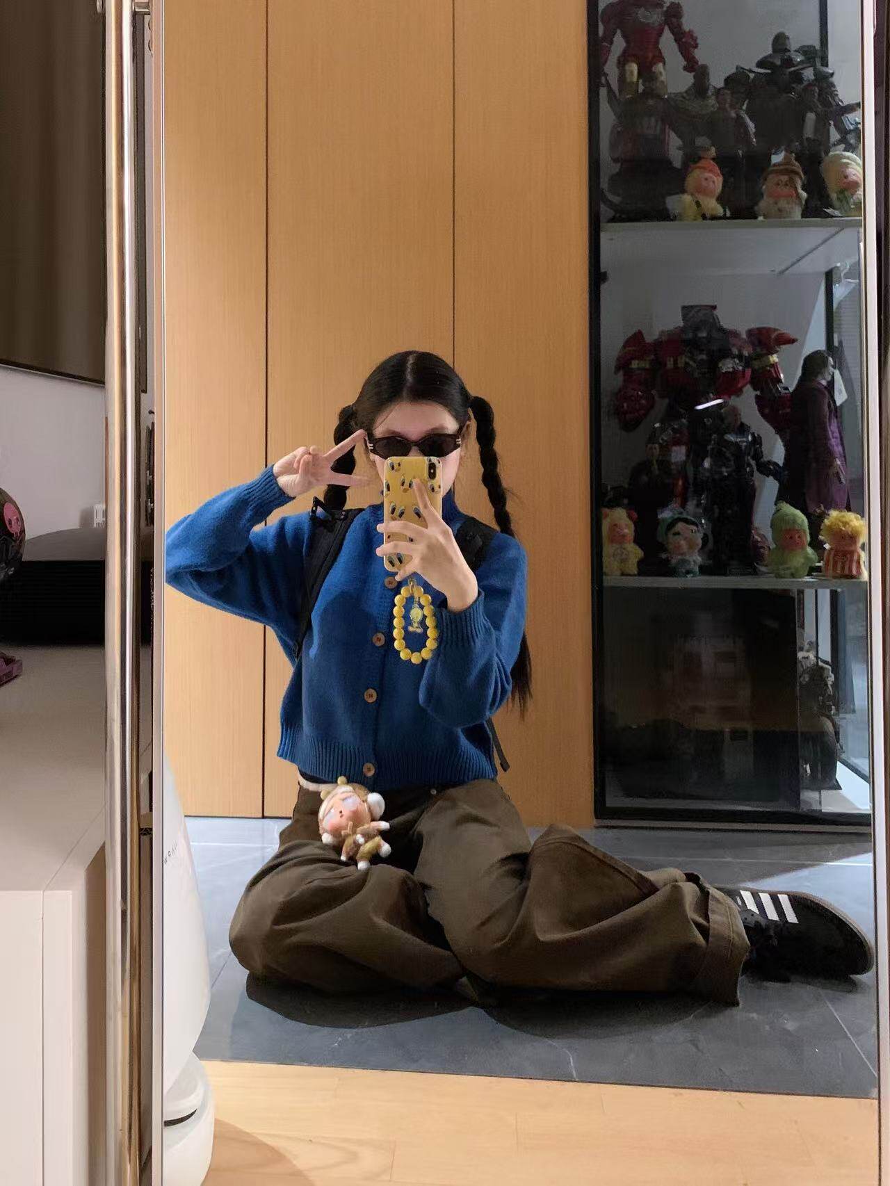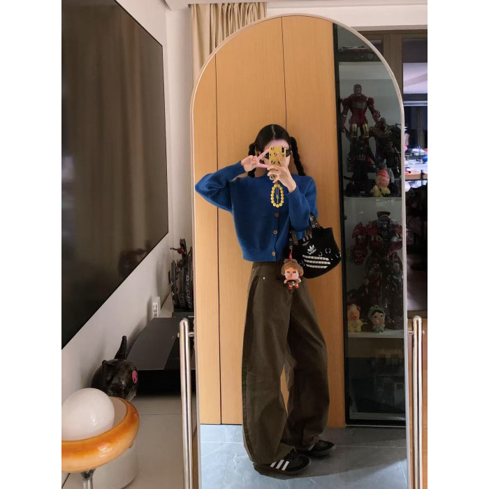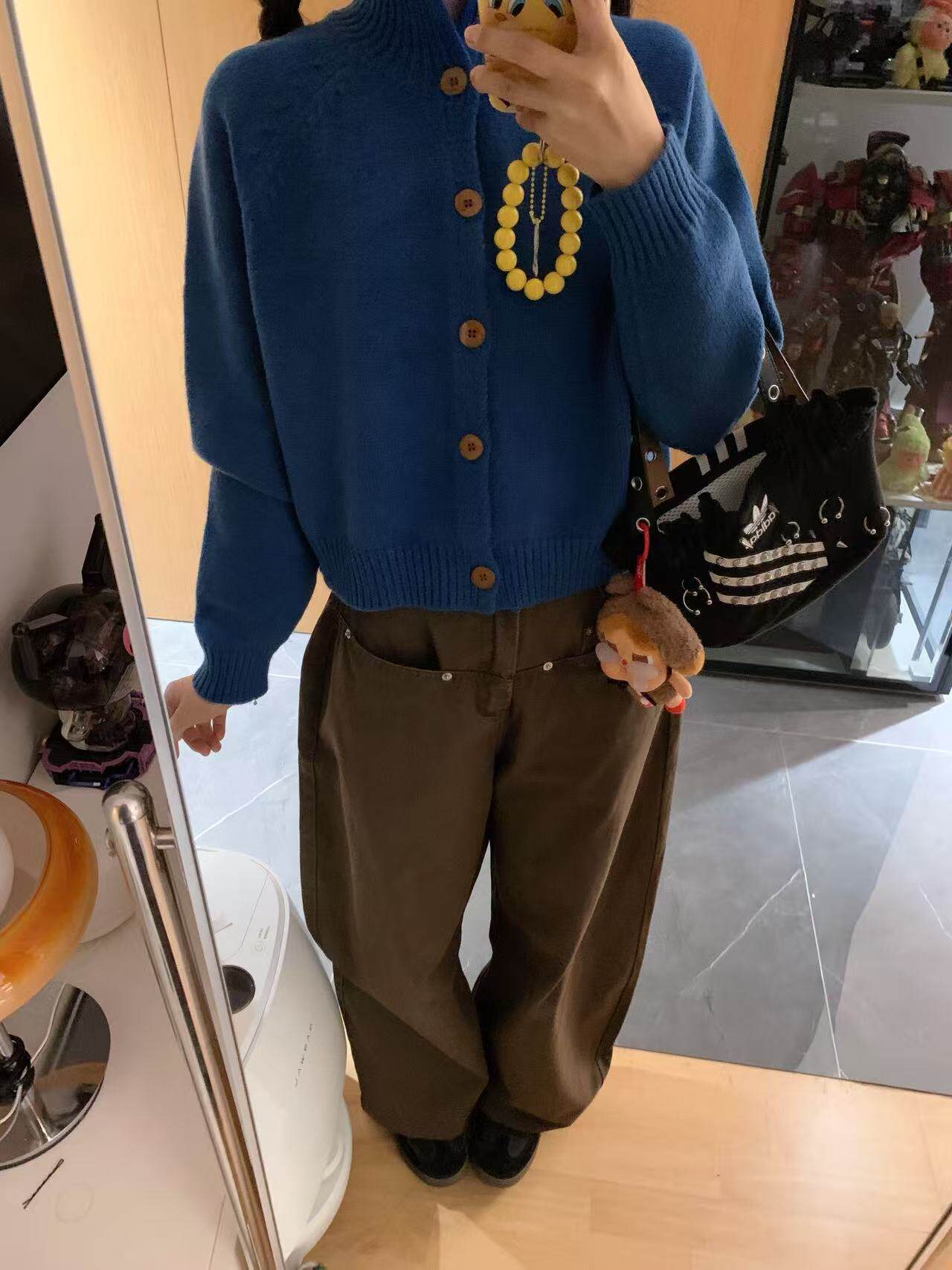 藍色立領開衫女針織衫上衣早秋新款韓系穿搭短款軟糯寬松毛衣外套