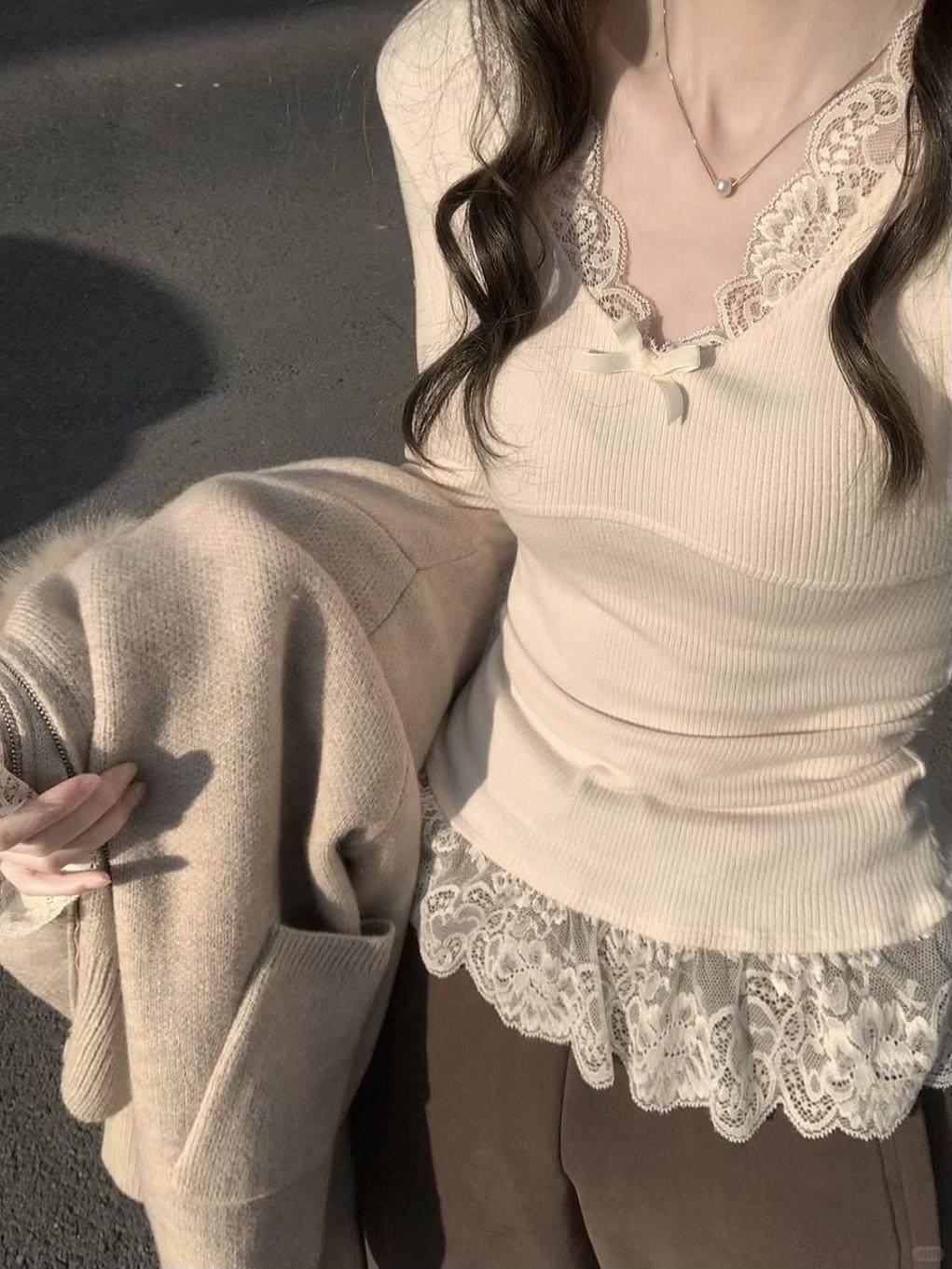 純欲風蝴蝶結設計感長袖t恤女春秋bm風蕾絲花邊修身內搭保暖上衣