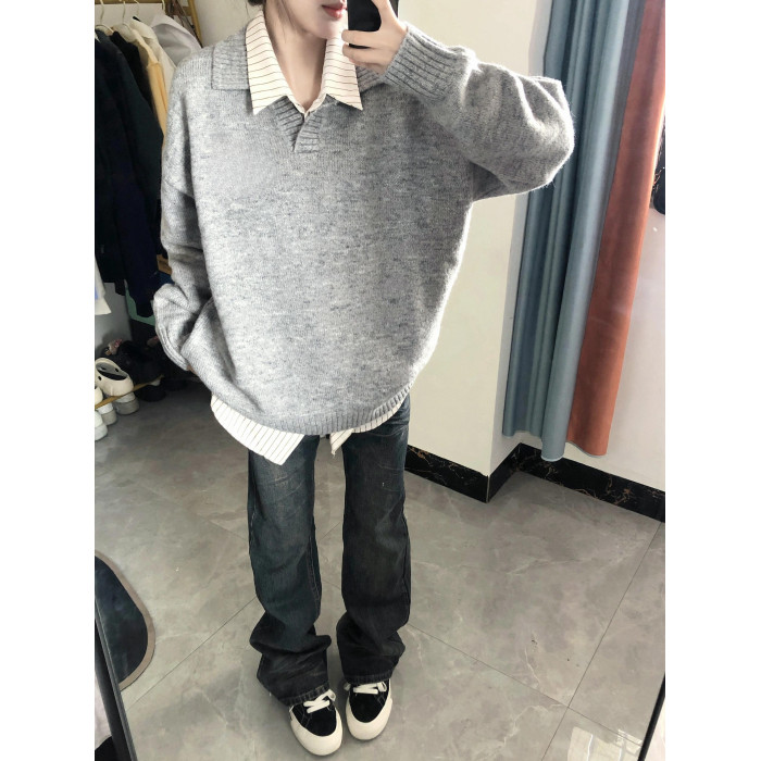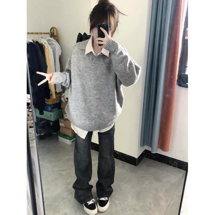 學院風灰色polo領毛衣女寬鬆慵嬾美式復古秋季冬繙領針織衫外套潮