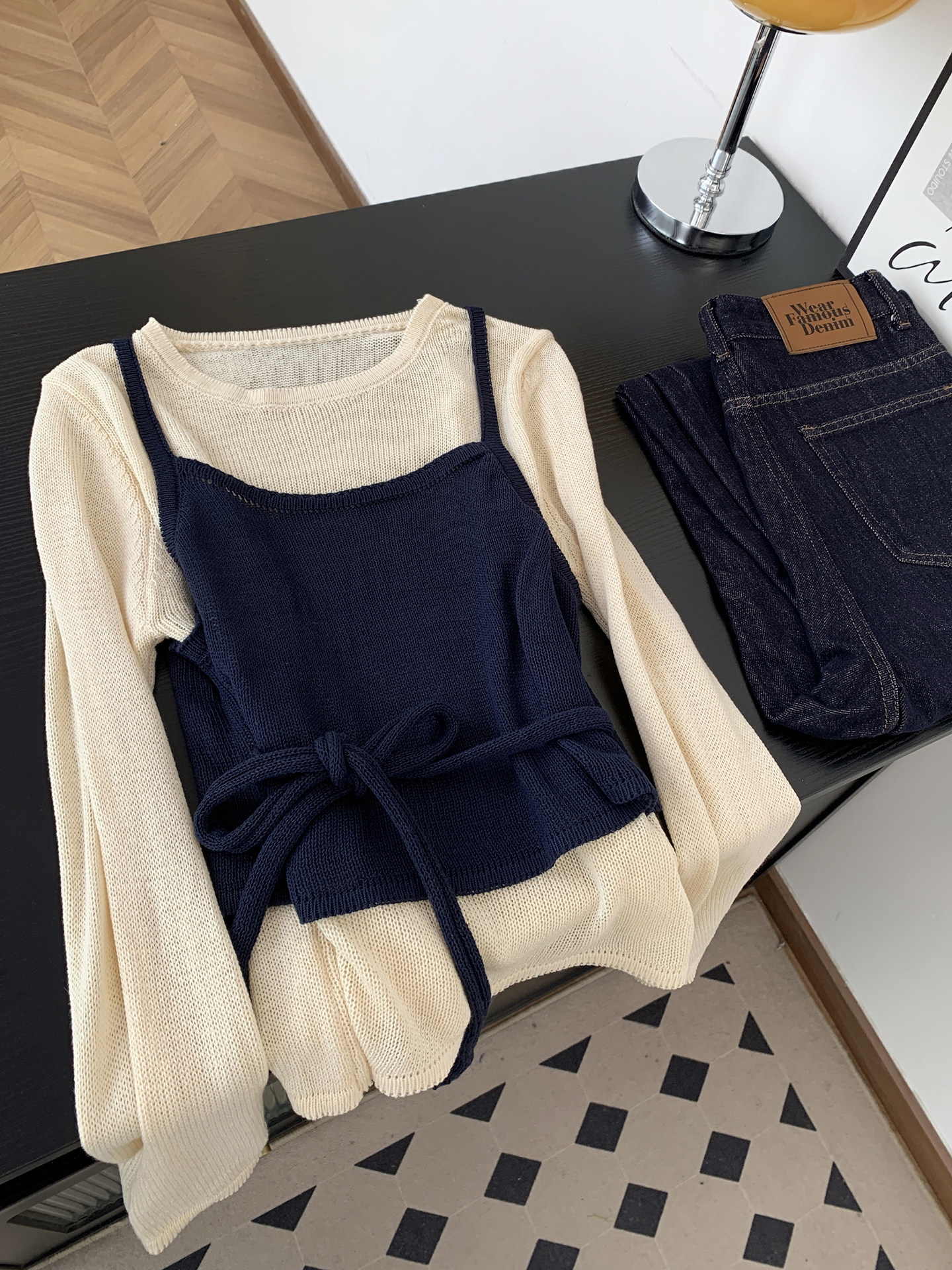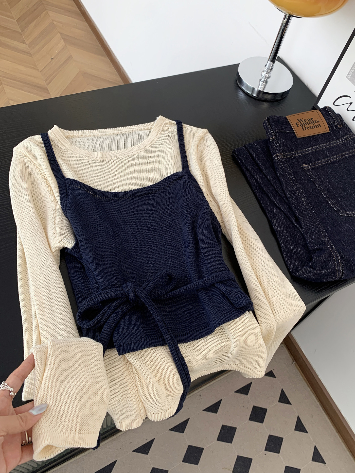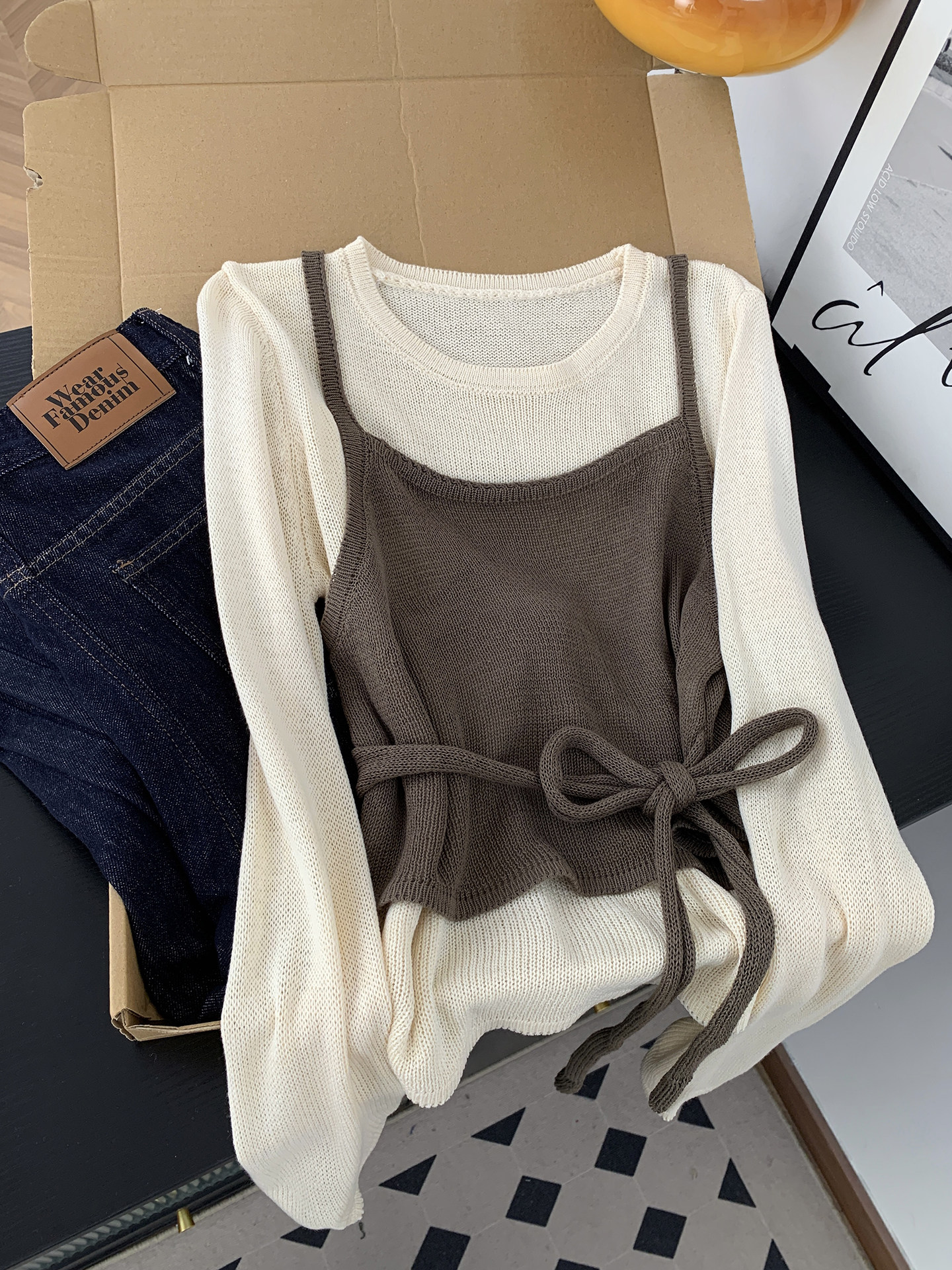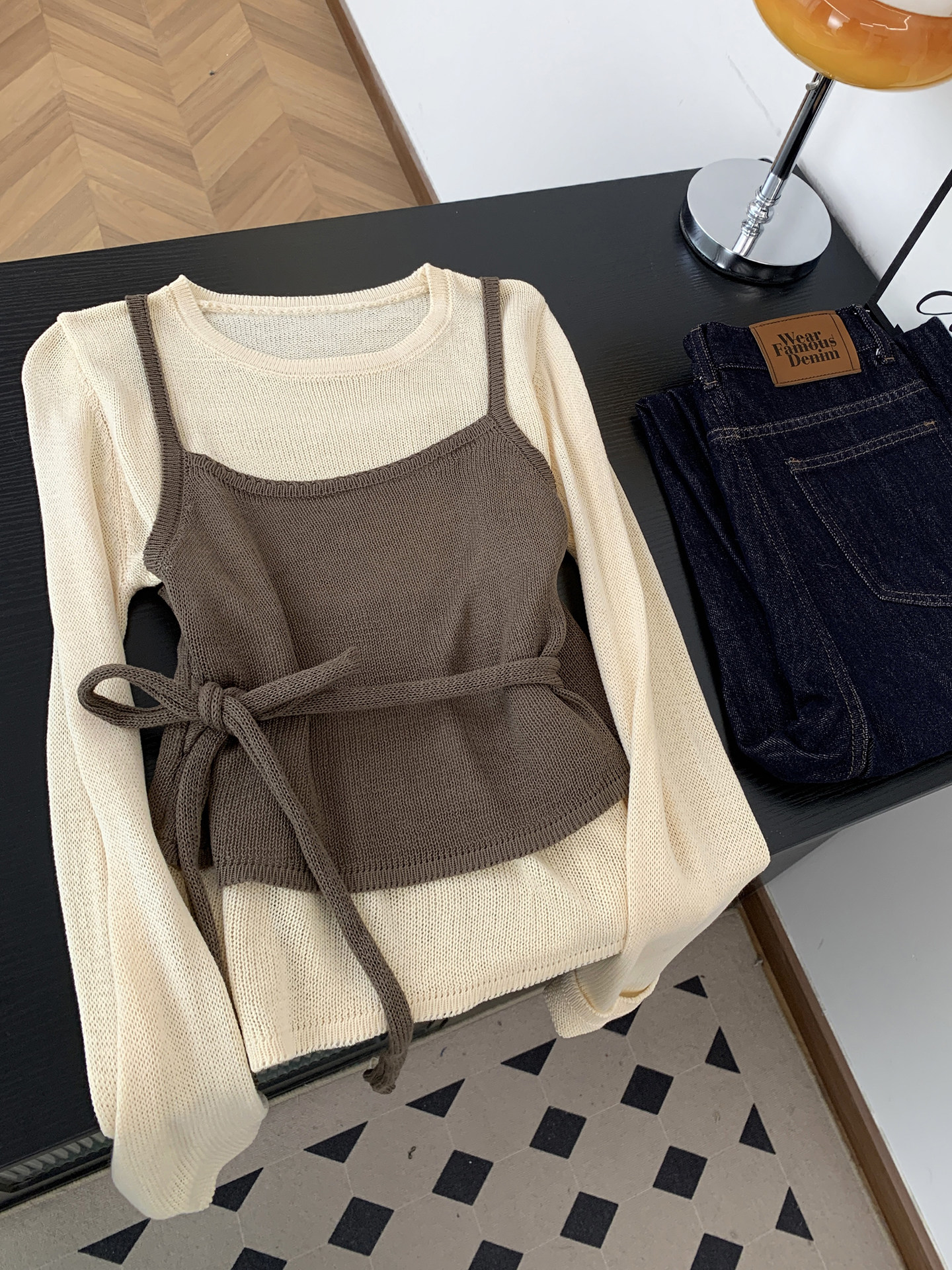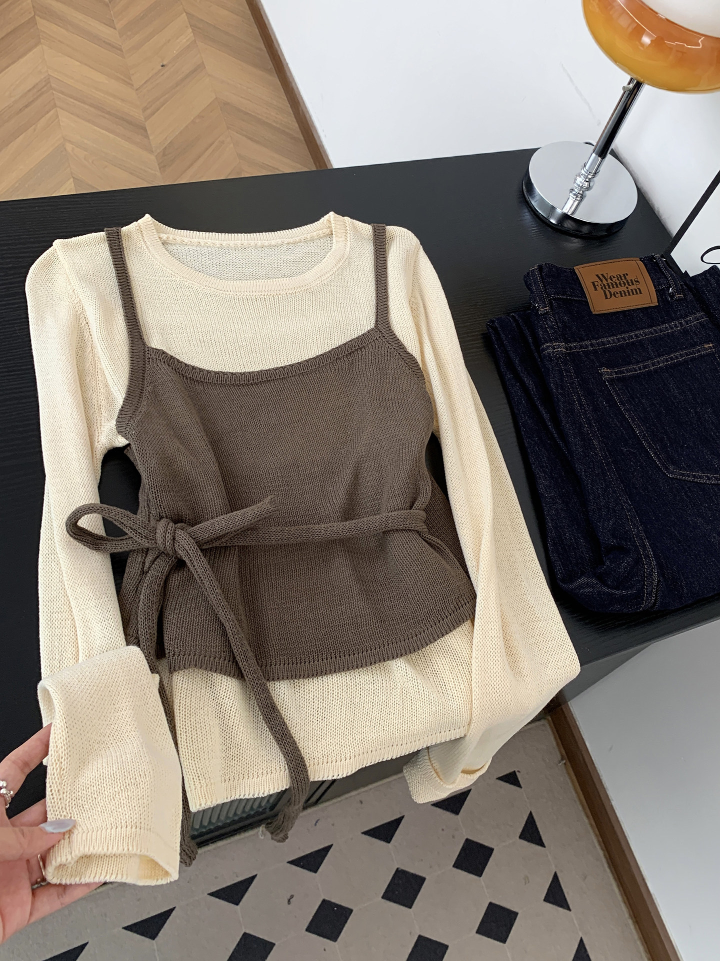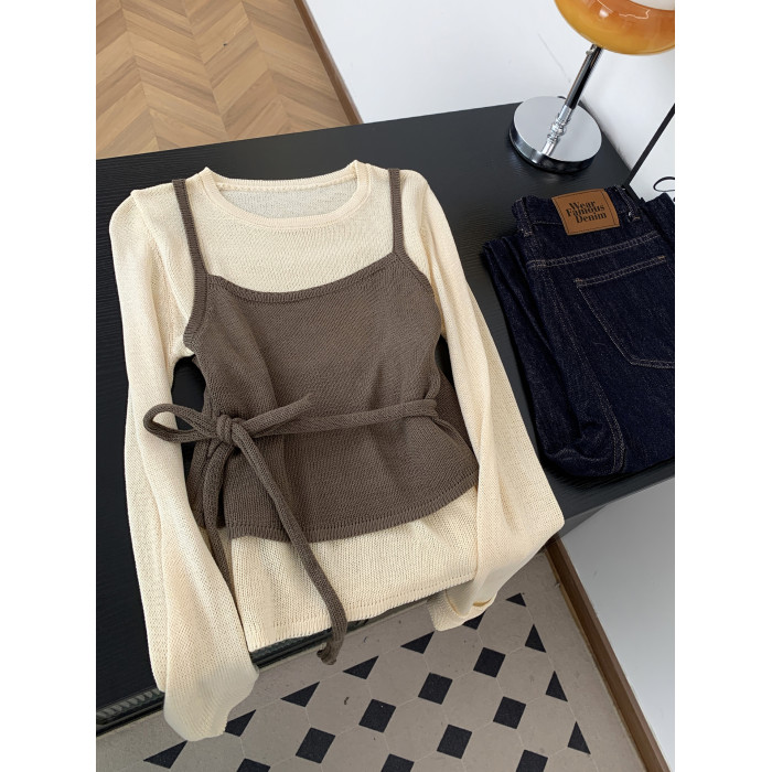 美拉德咖色綁帶收腰針織衫女秋季撞色假兩件吊帶拼接圓領長袖上衣