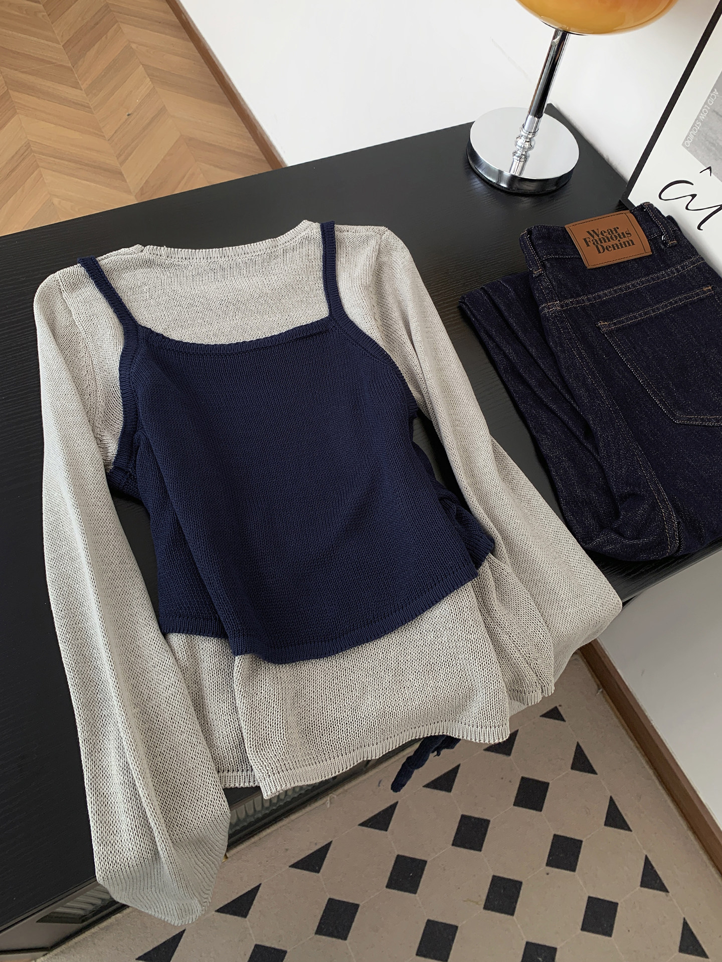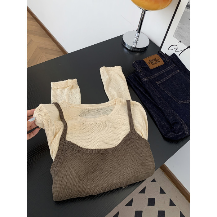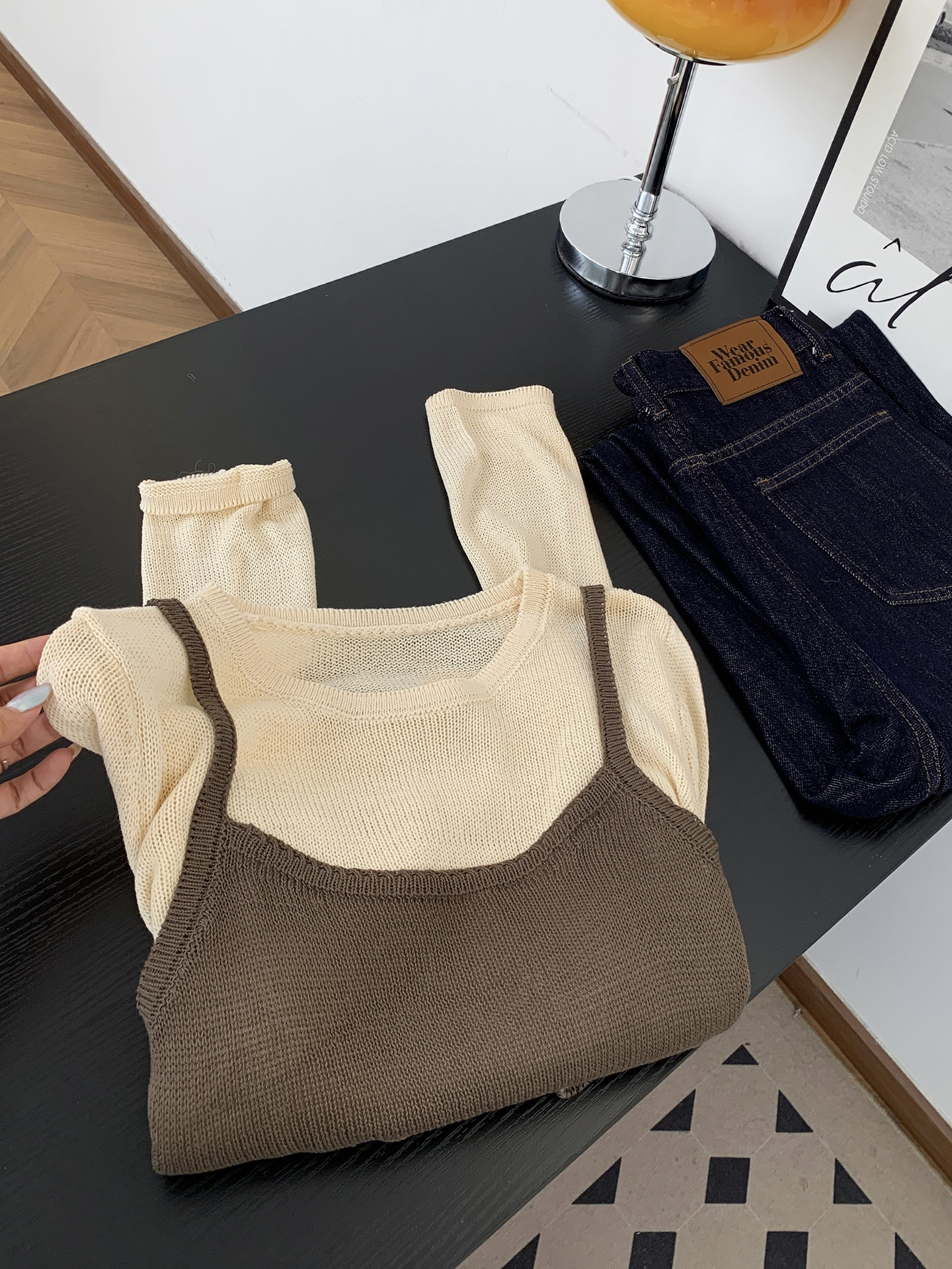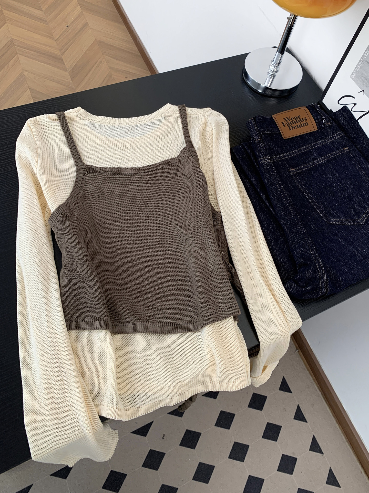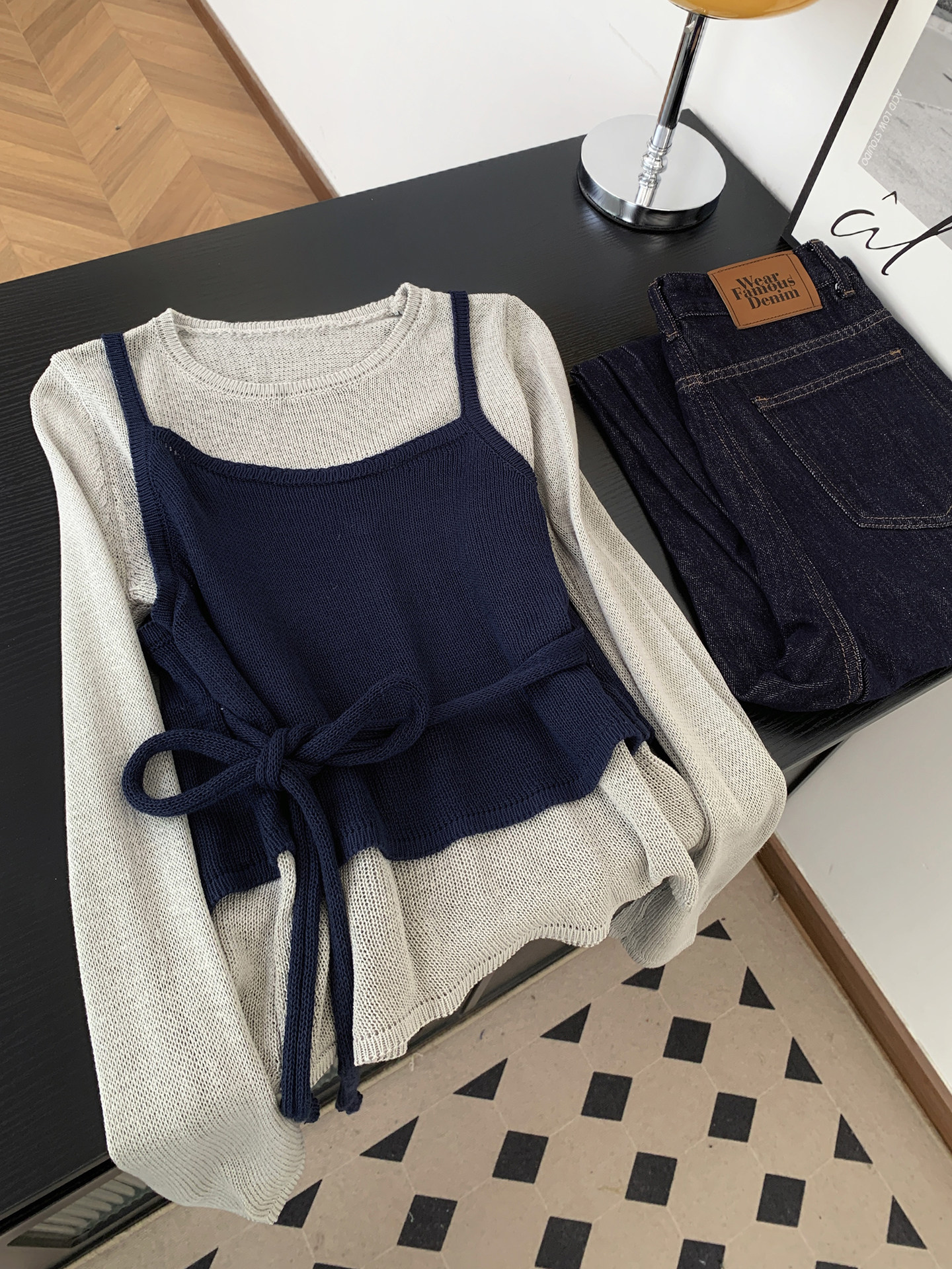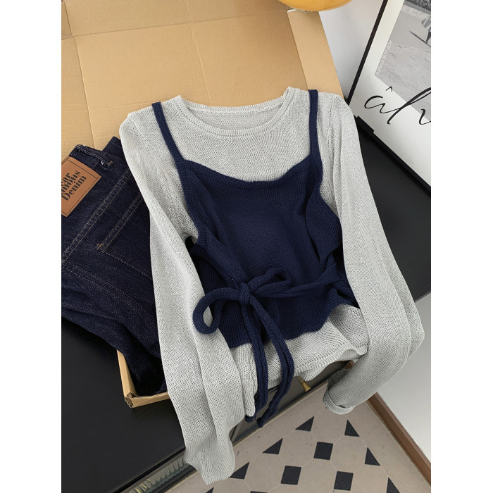 美拉德咖色綁帶收腰針織衫女秋季撞色假兩件吊帶拼接圓領長袖上衣