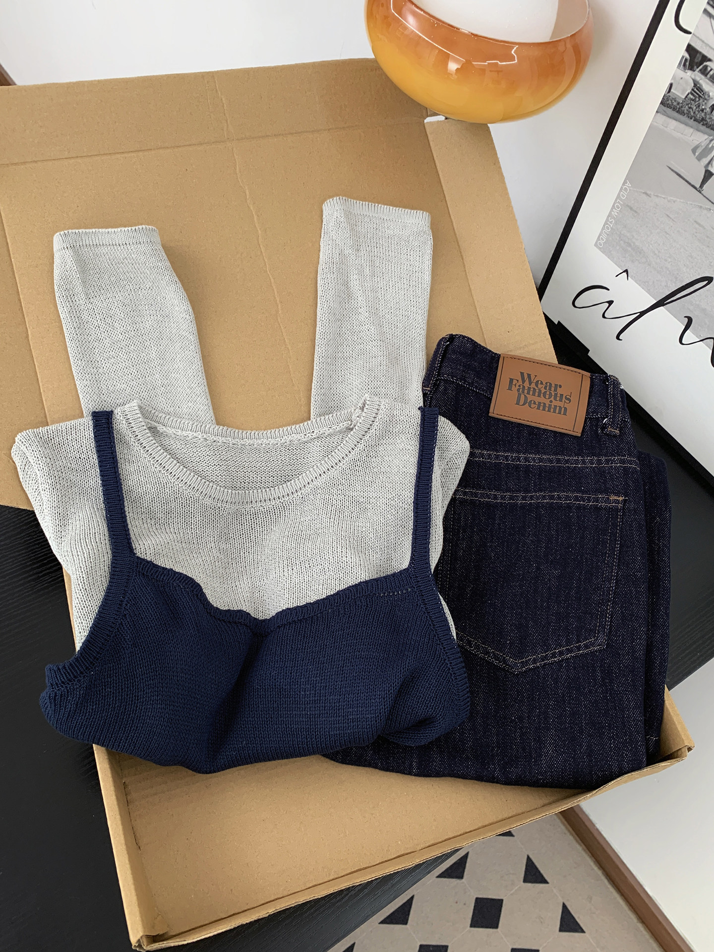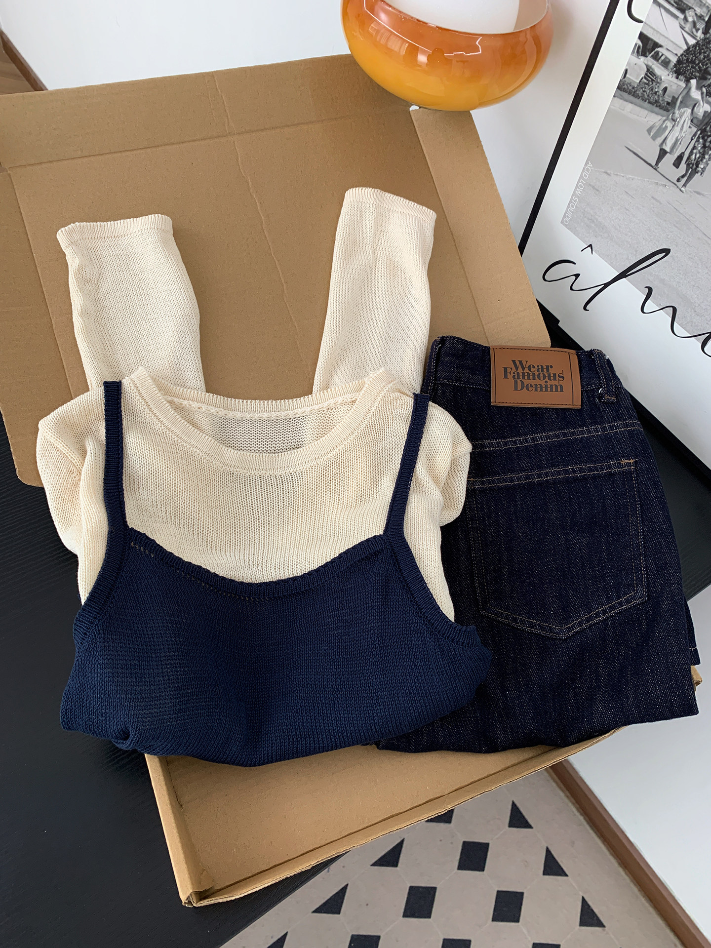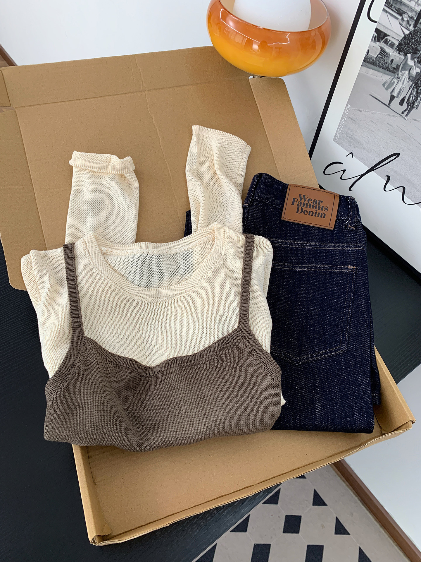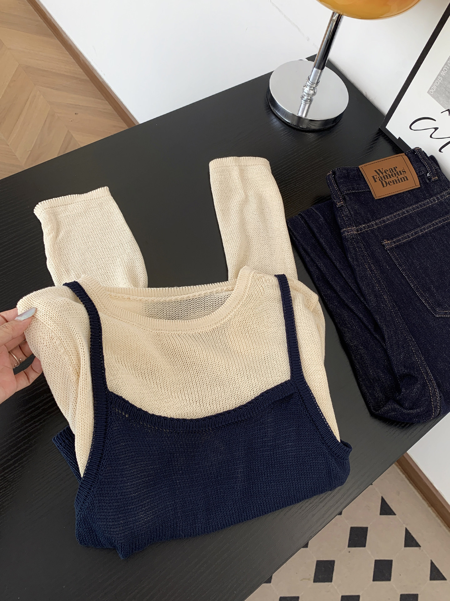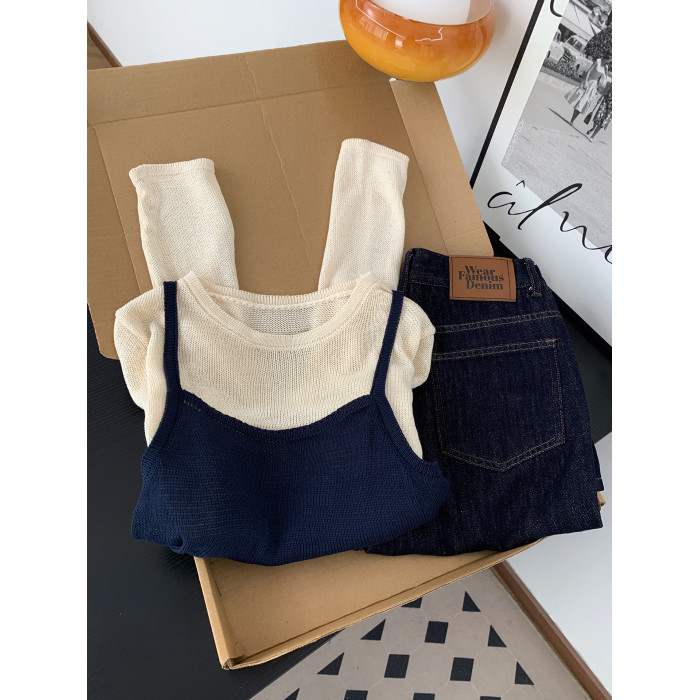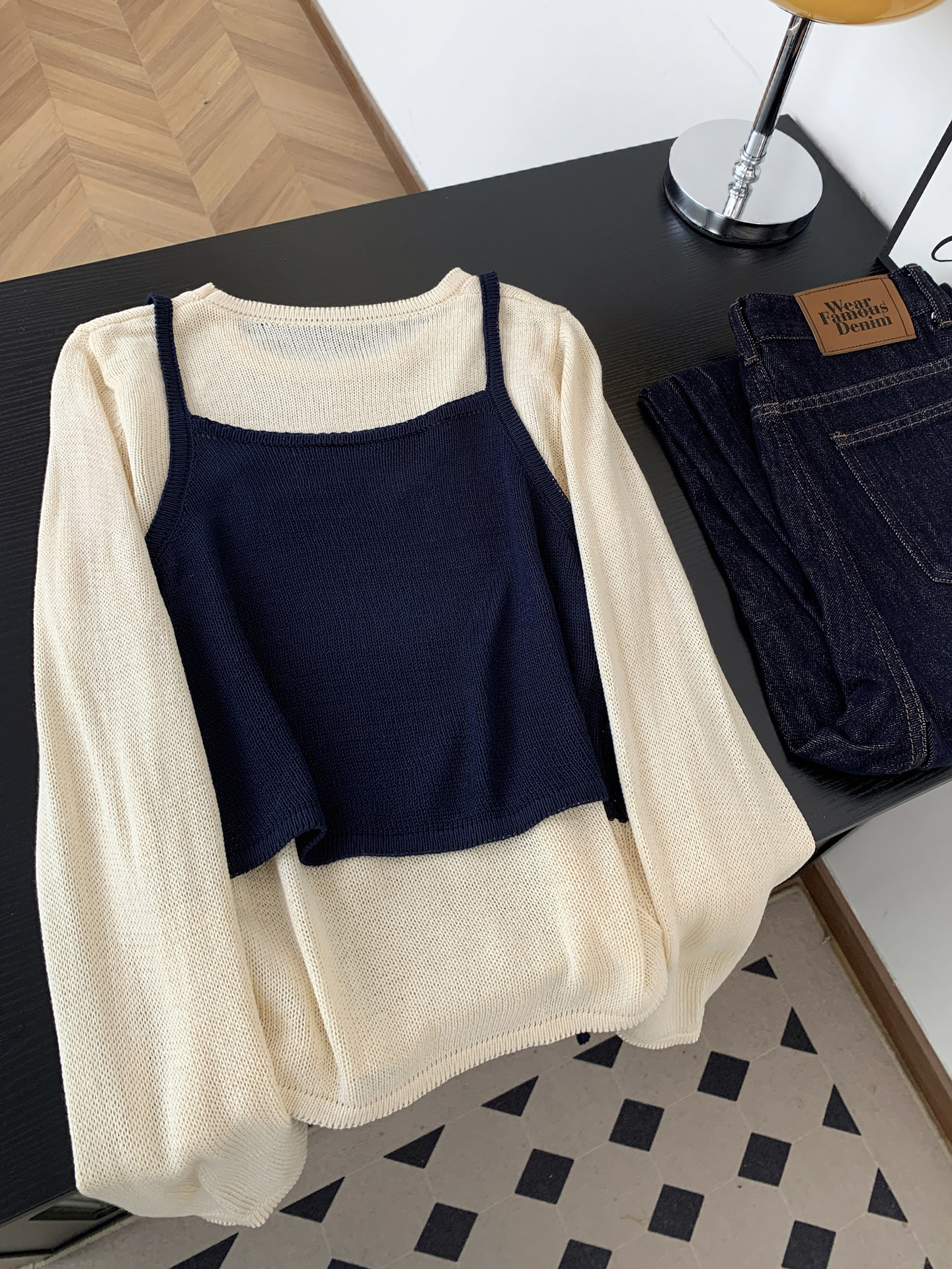 美拉德咖色綁帶收腰針織衫女秋季撞色假兩件吊帶拼接圓領長袖上衣