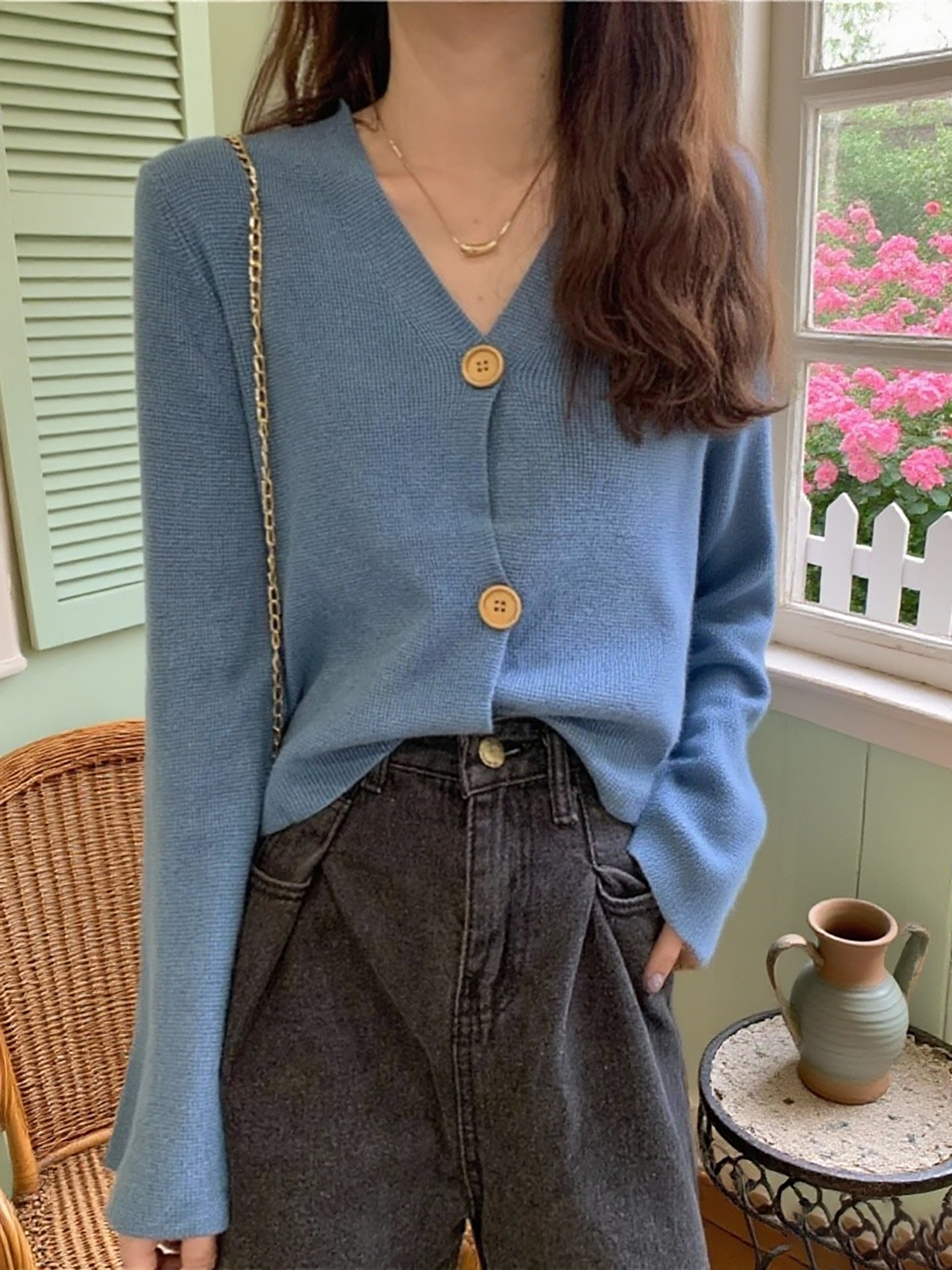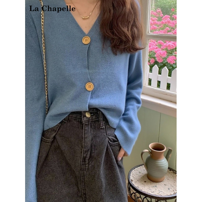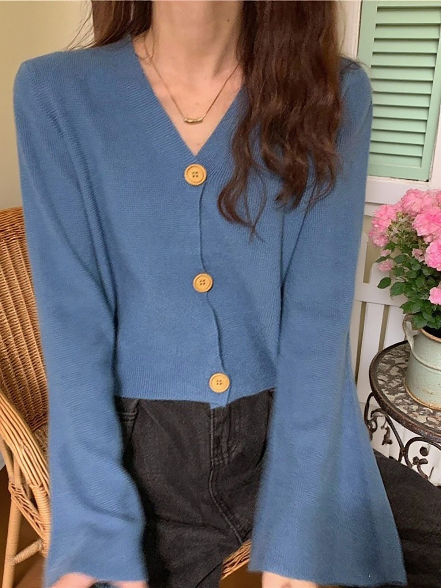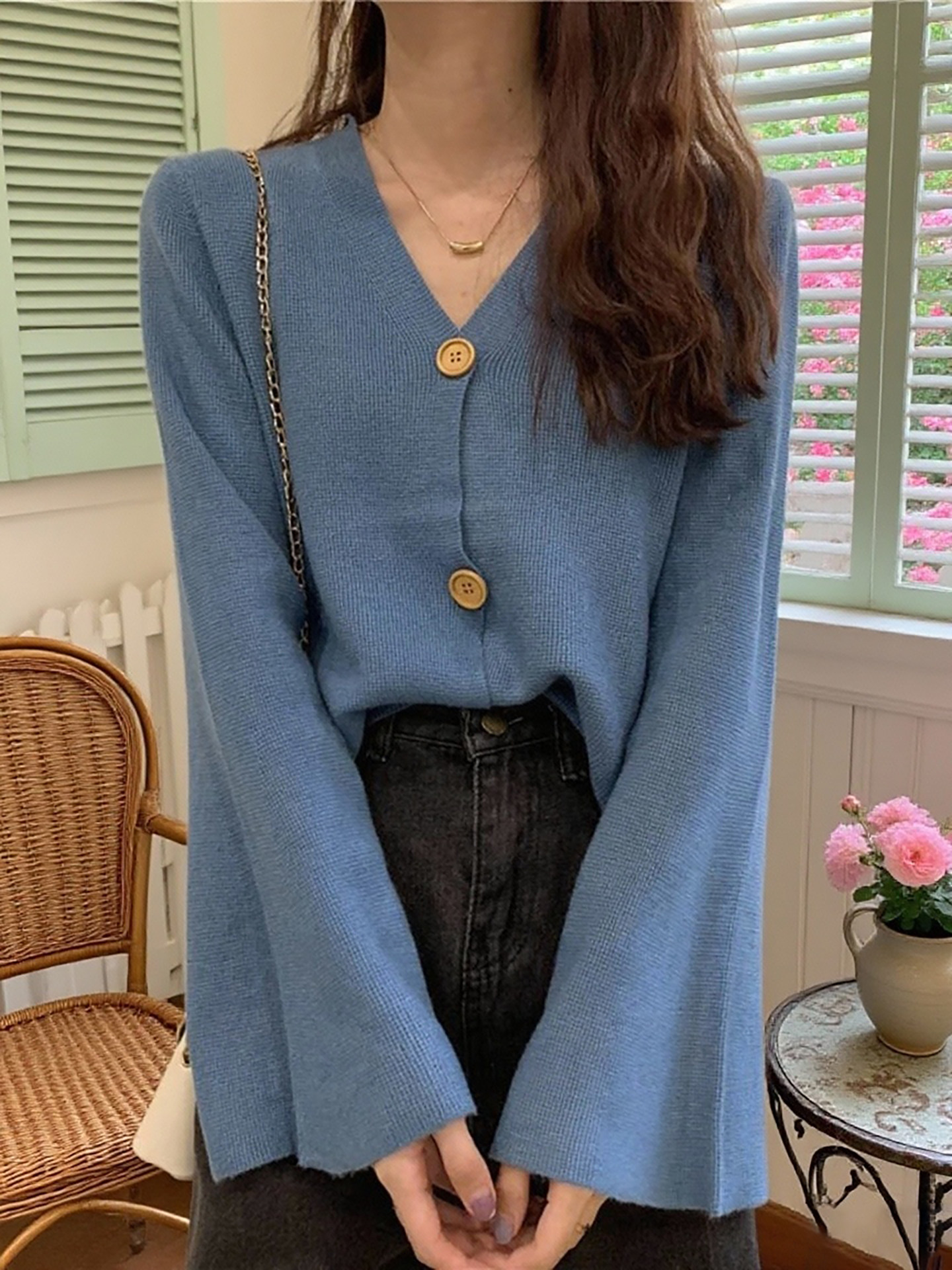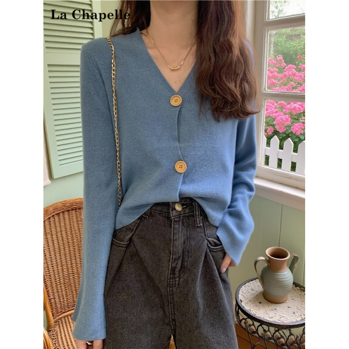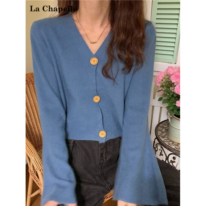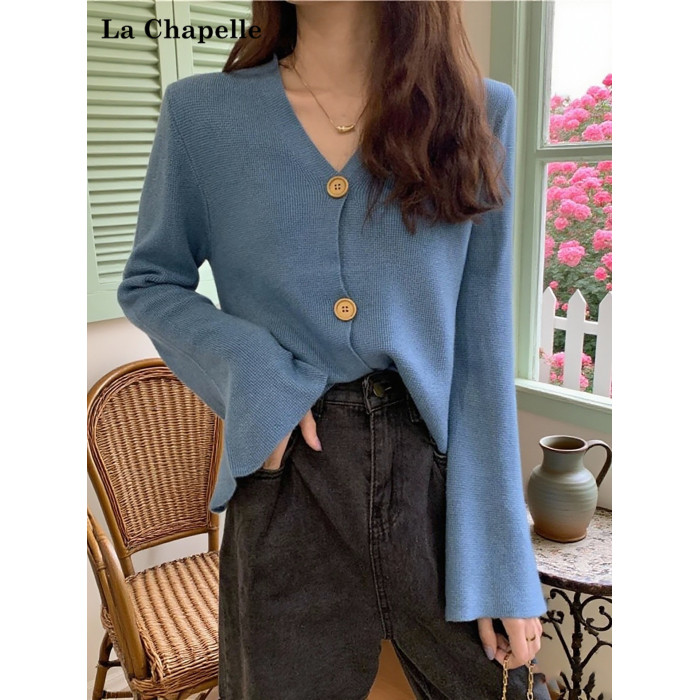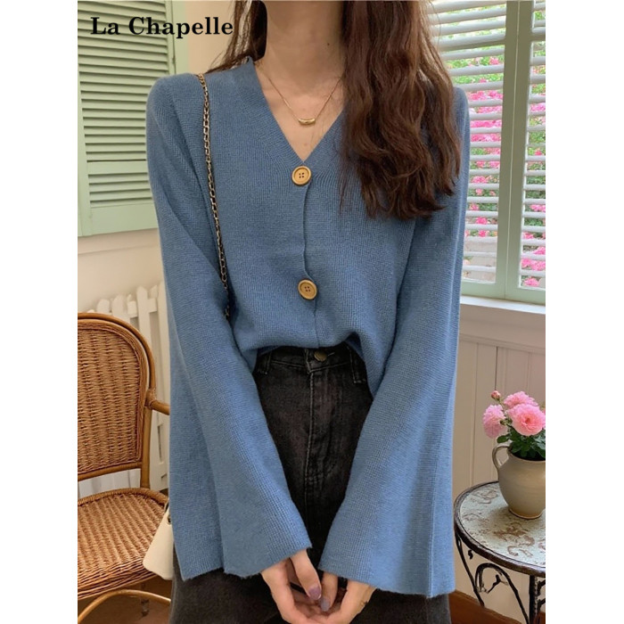 拉夏貝爾藍色V領喇叭袖針織開衫女秋冬新款內搭毛衣外套長袖上衣