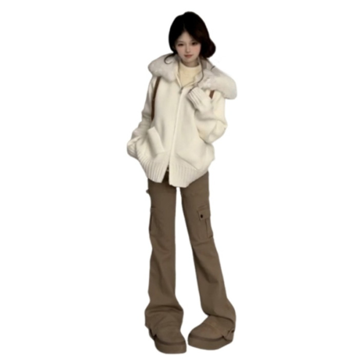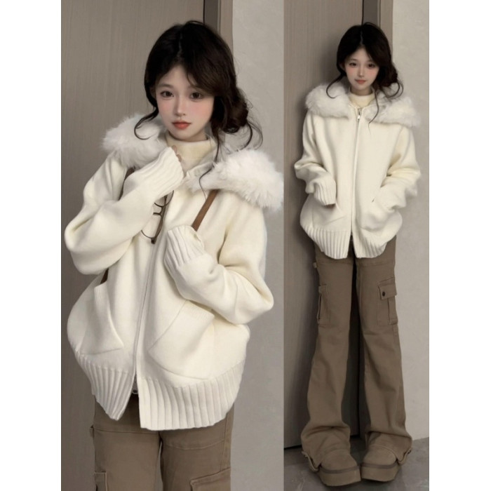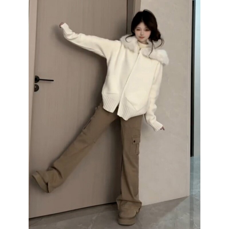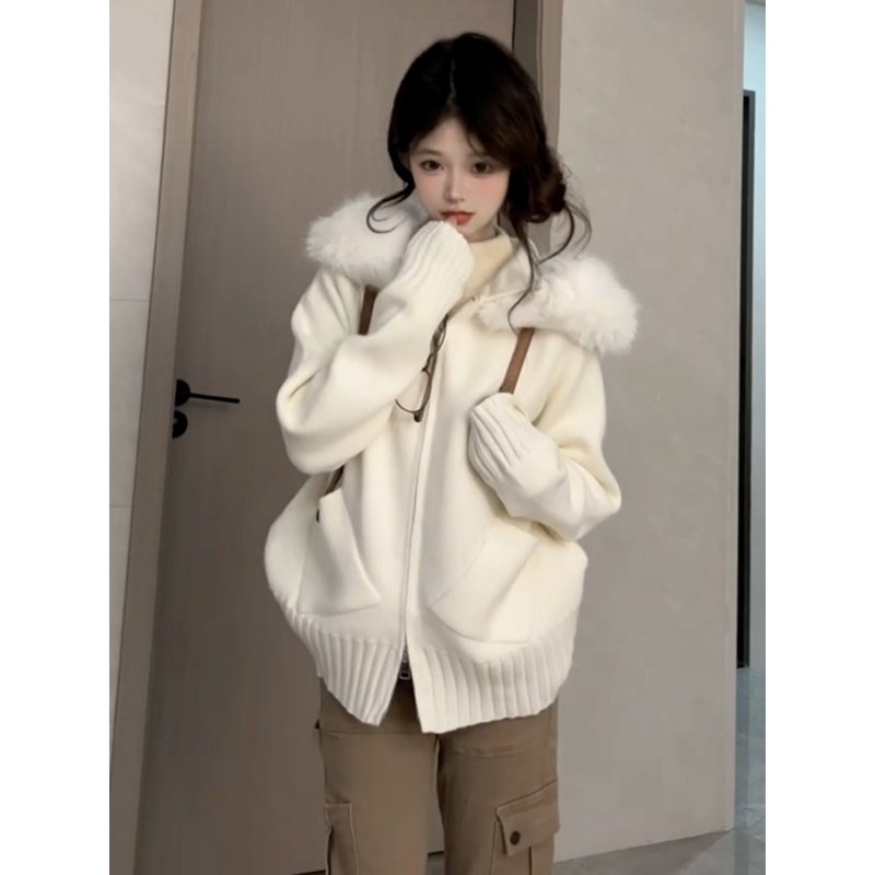 早秋韓系白色連帽衛衣毛衣外套女秋季2025新款慵嬾風針織開衫上衣
