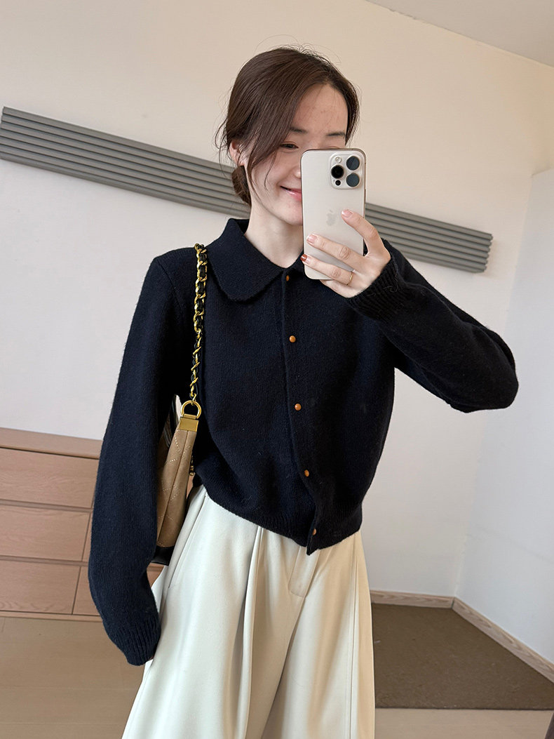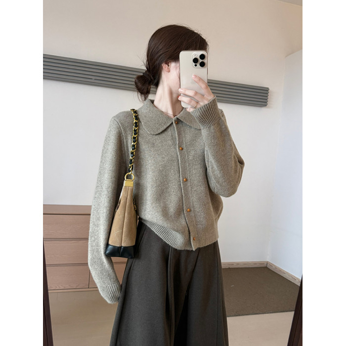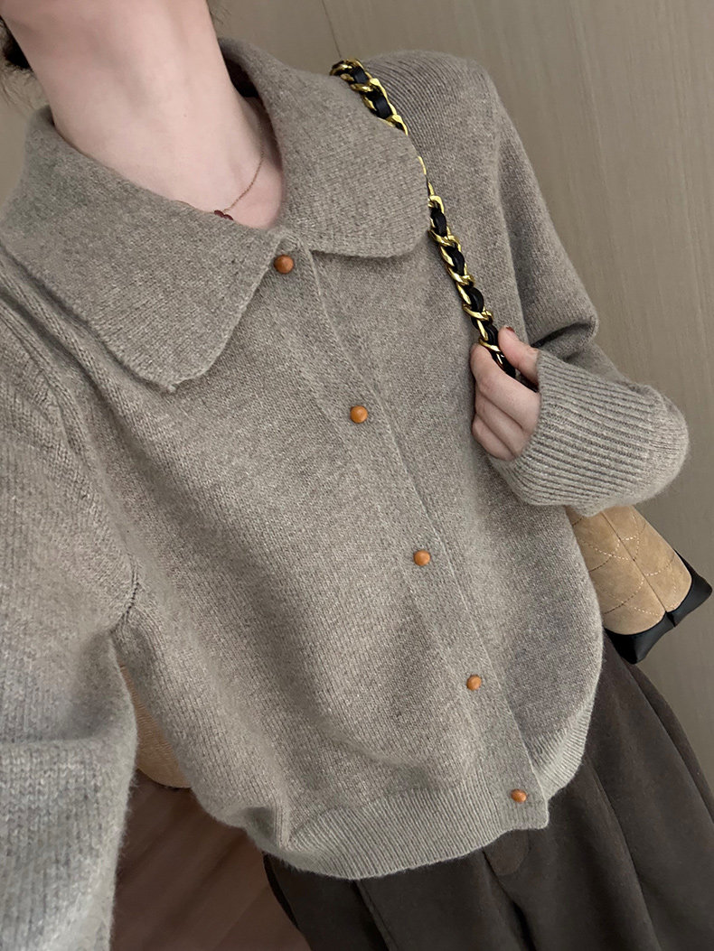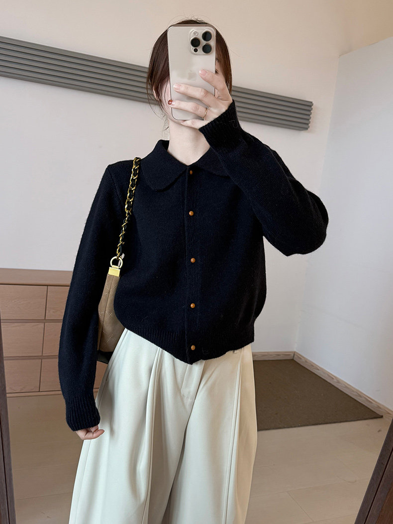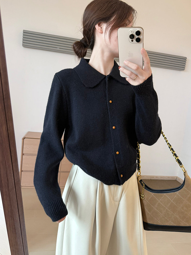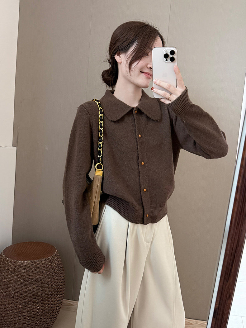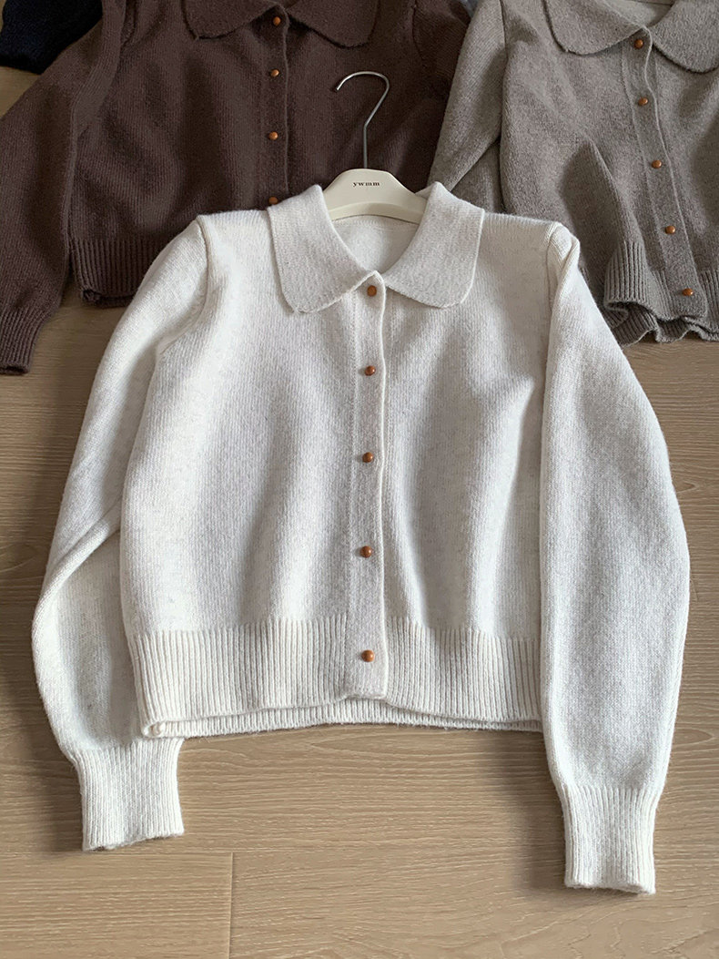 話裡簡約風娃娃領浣熊開衫2025秋季新款韓版繙領顯瘦上衣針織衫女