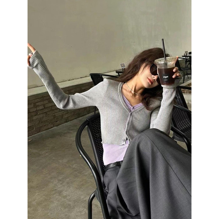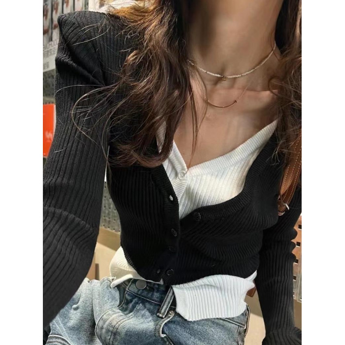 韓系玫紅色v領修身假兩件針織開衫秋季新款純欲風辣妹長袖上衣女