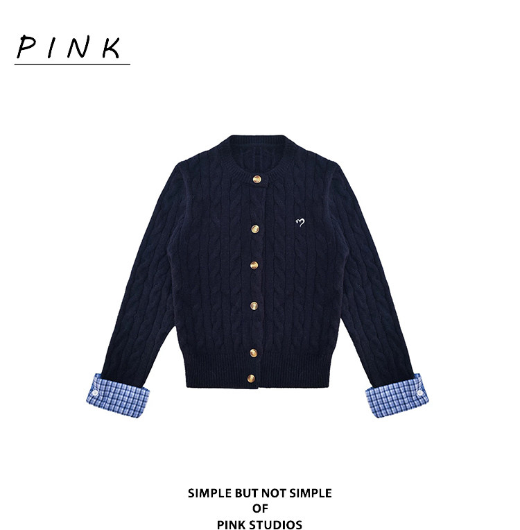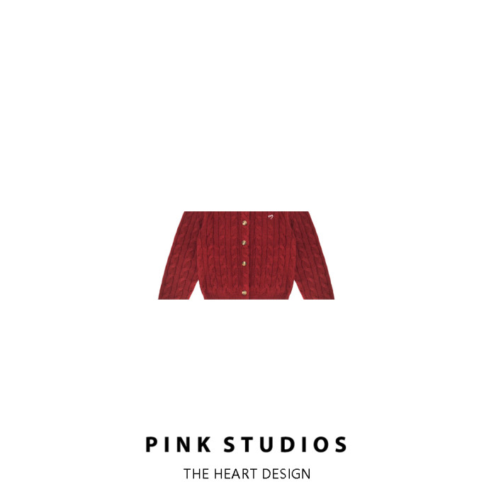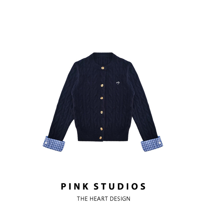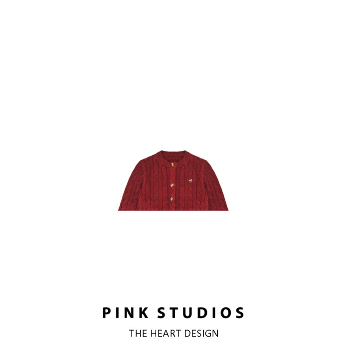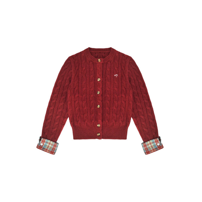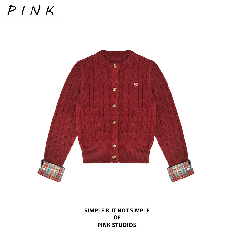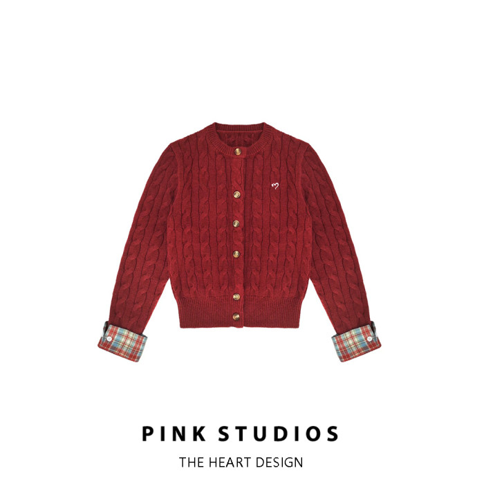 聖誕紅色圓領毛衣外套女秋冬復古學院風刺綉格紋拼接麻花針織開衫
