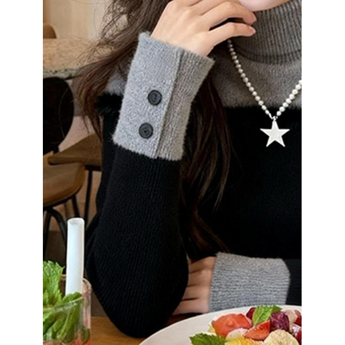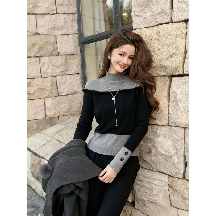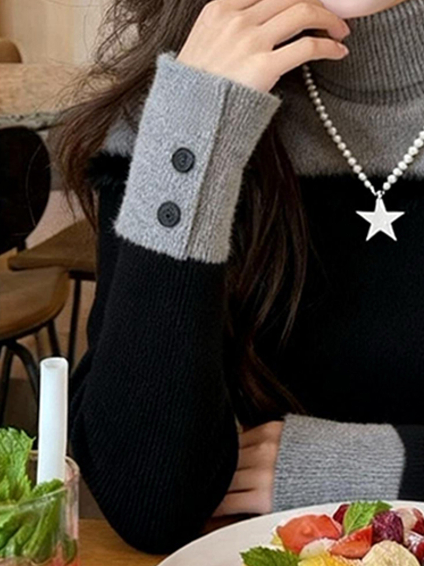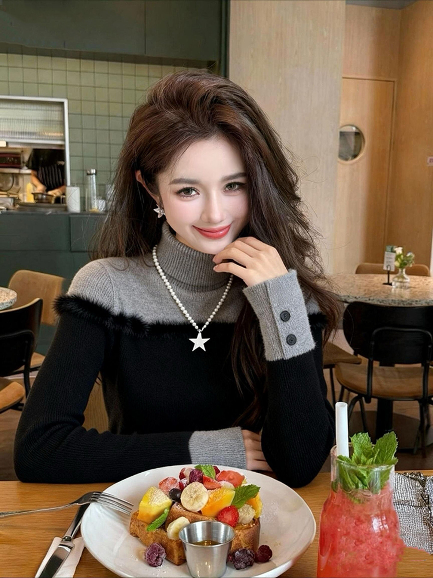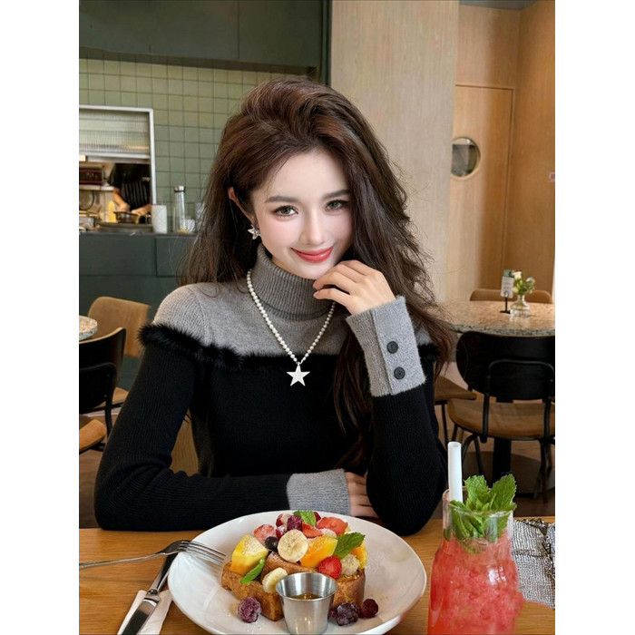 秋冬法式輕熟假兩件長袖毛衣針織打底衫女內搭設計感撞色高領上衣