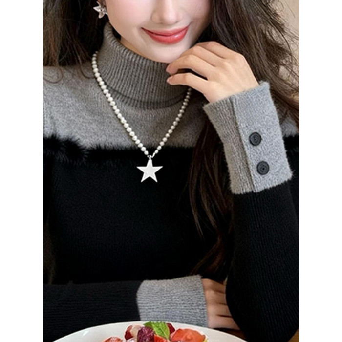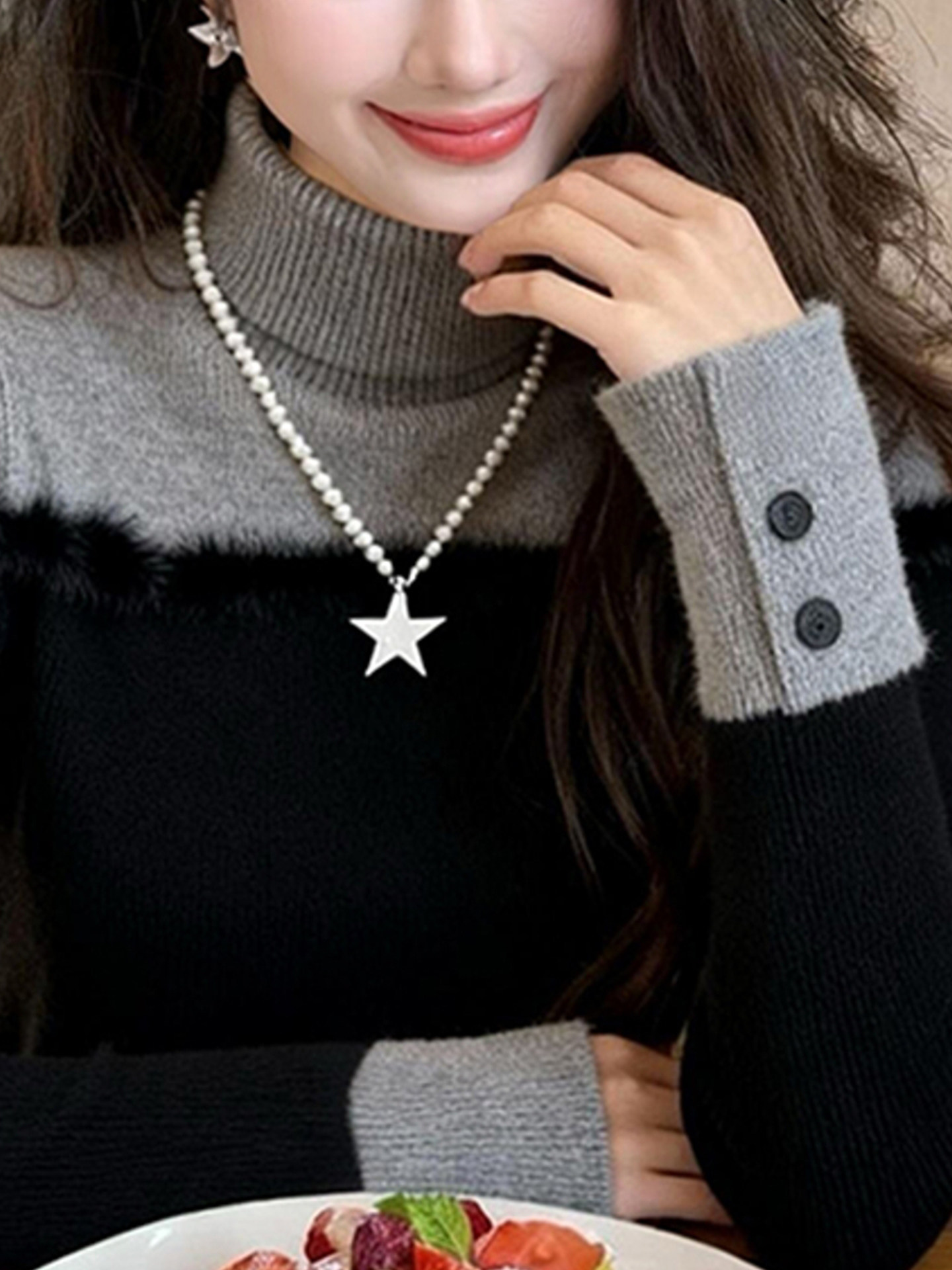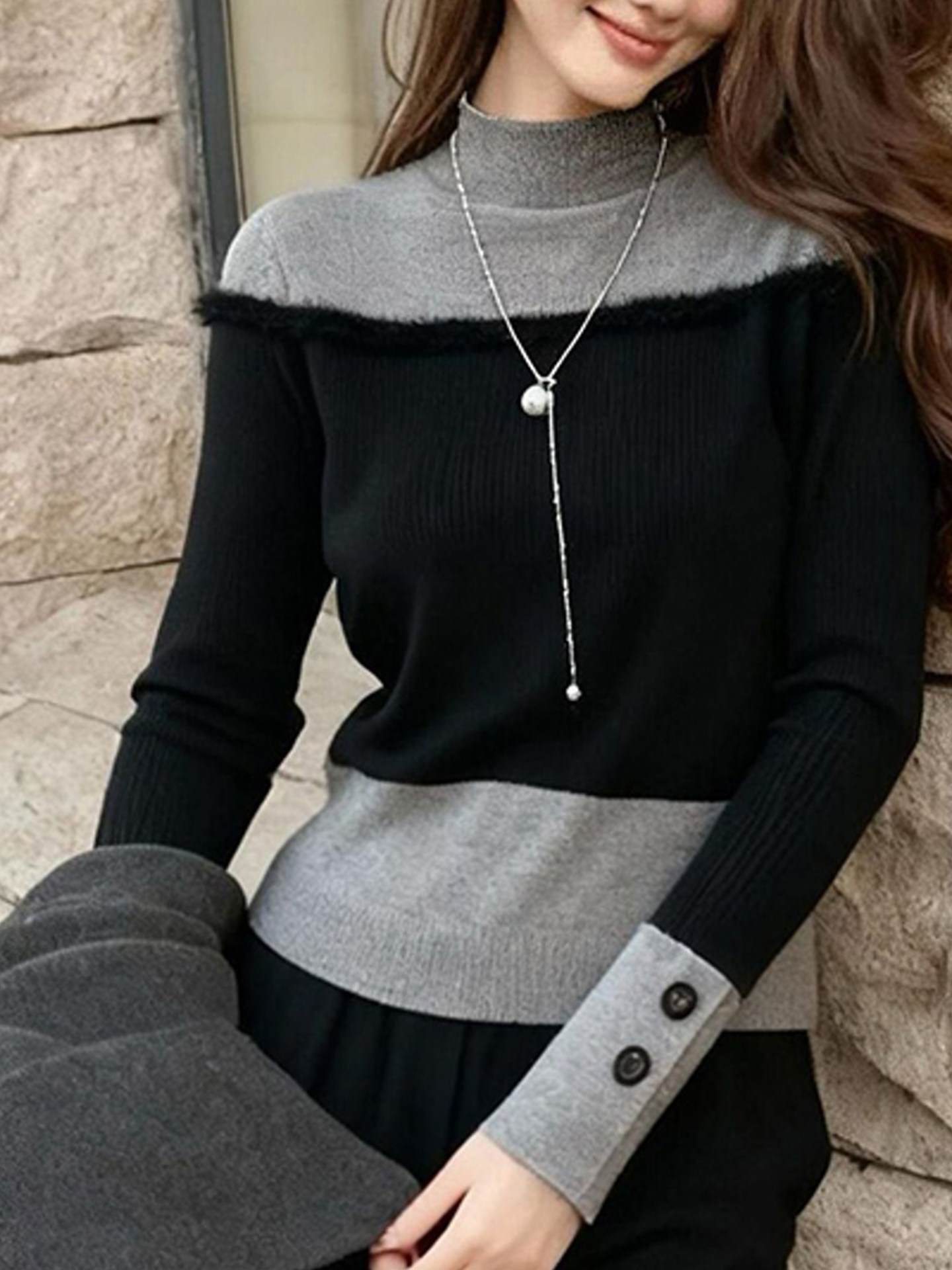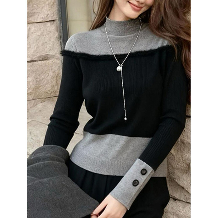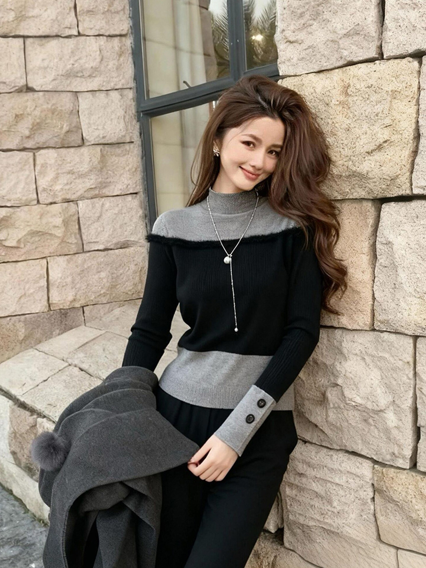秋冬法式輕熟假兩件長袖毛衣針織打底衫女內搭設計感撞色高領上衣