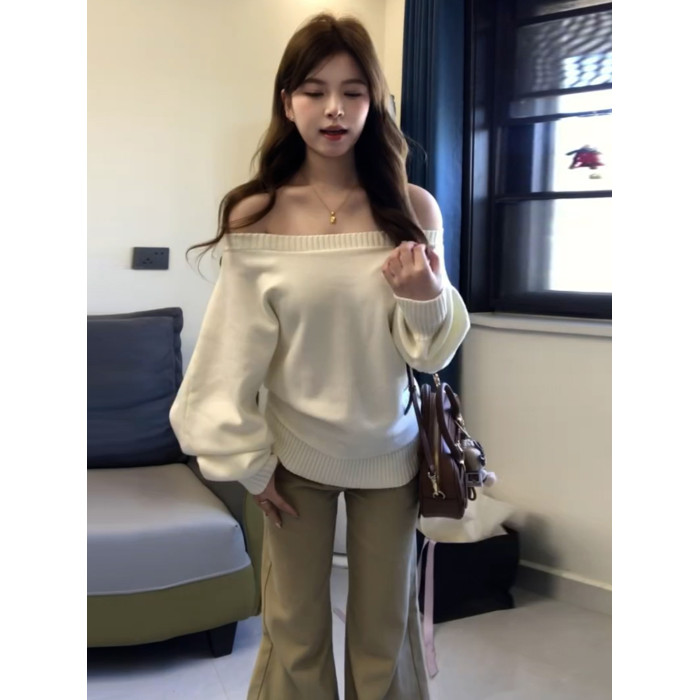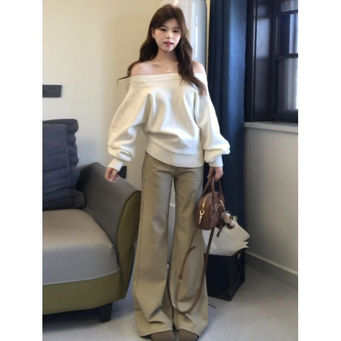 韓系白色軟糯寬鬆一字肩毛衣女秋冬慵嬾高級感2025新款針織衫上衣
