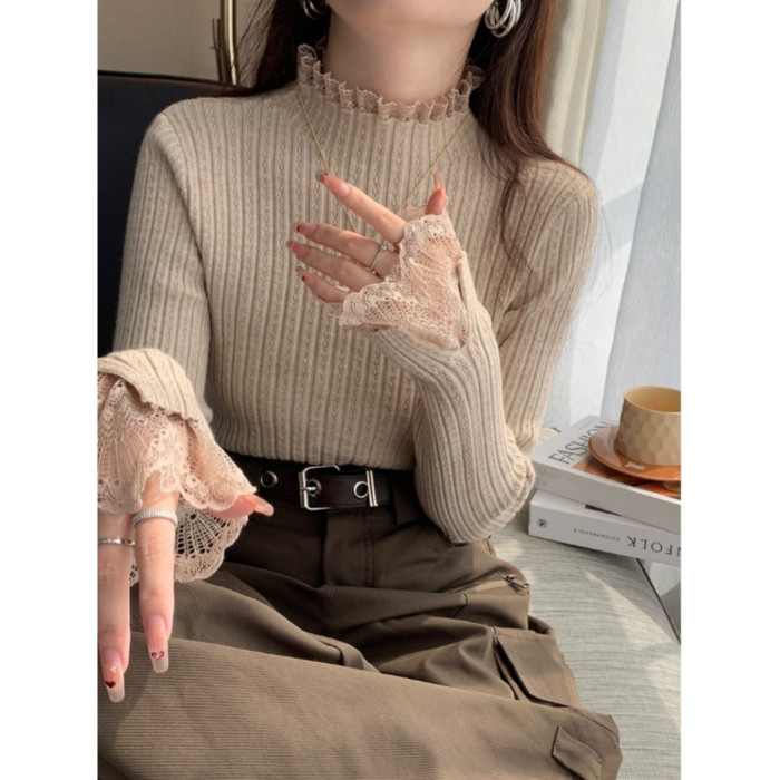 小香風蕾絲內搭針織打底衫女2025新款春秋冬季白色半高領毛衣上衣