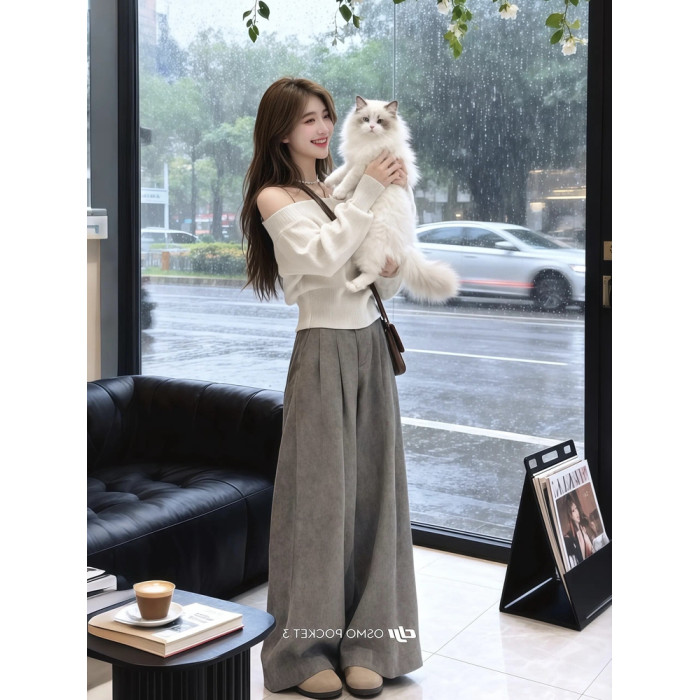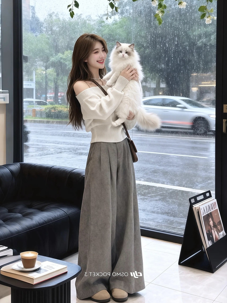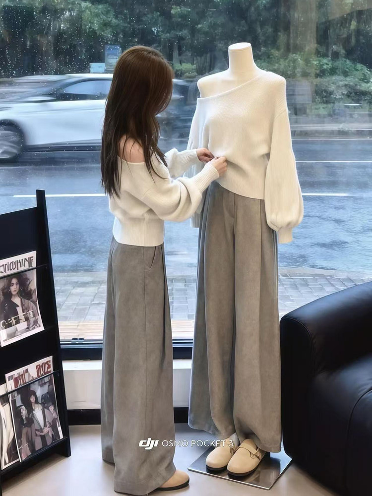 韓系長袖斜肩毛衣女秋冬季寬松慵懶風高級感針織衫露肩一字肩上衣