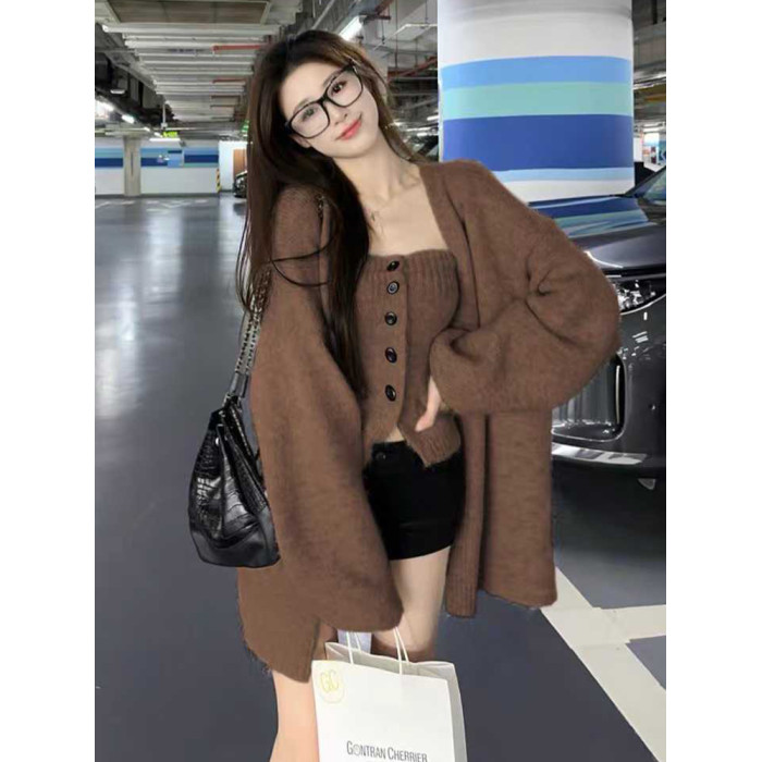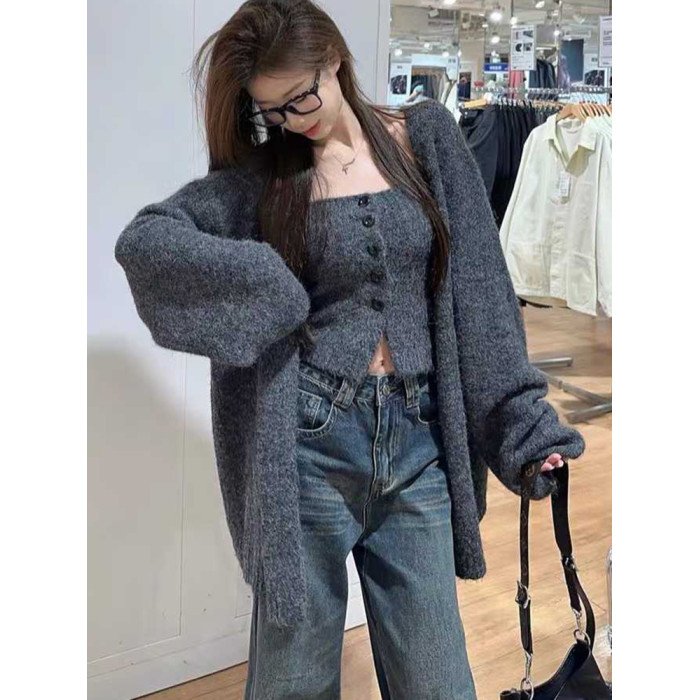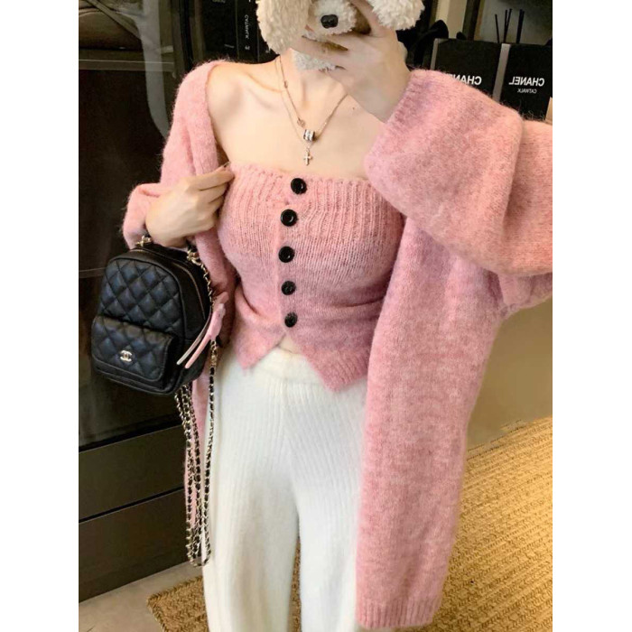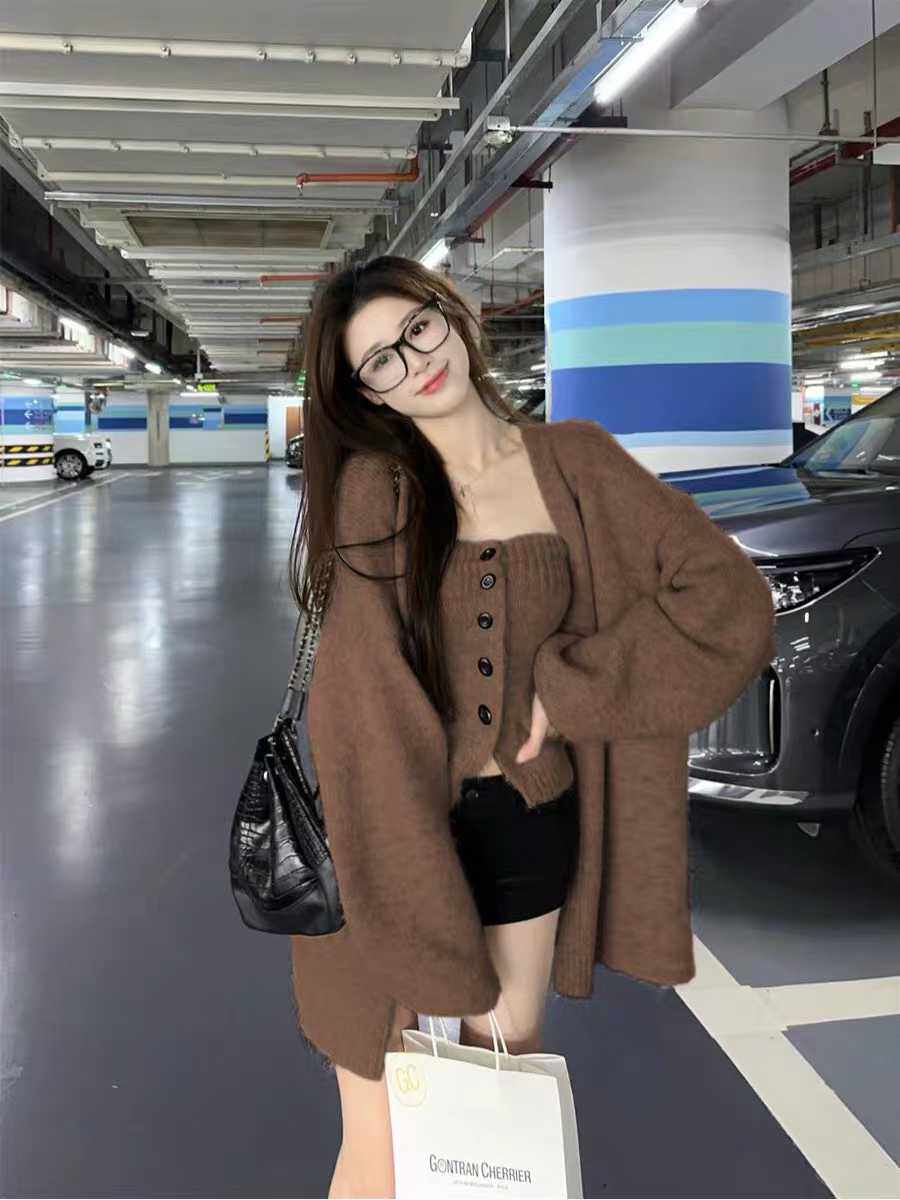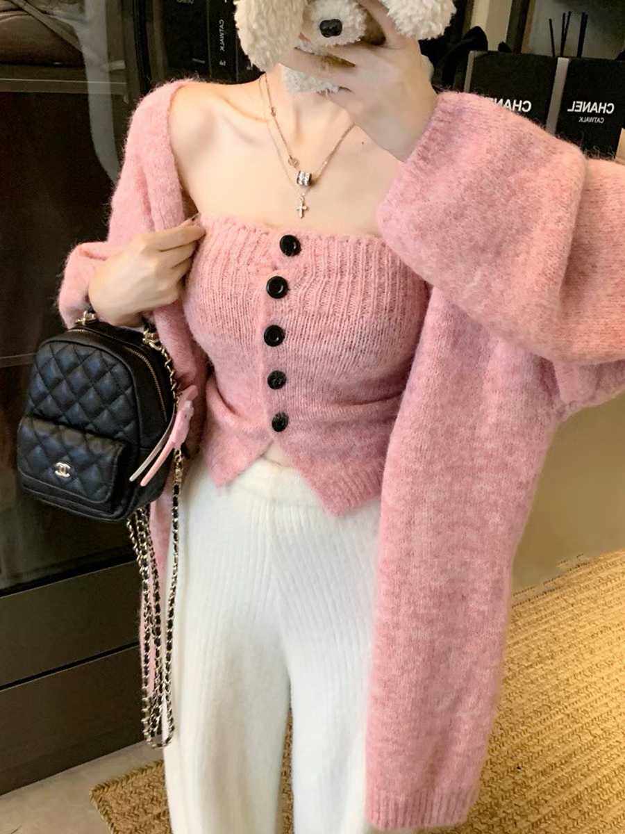 慵懶風中長款針織開衫抹胸背心兩件套酷辣毛衣外套吊帶套裝女秋冬