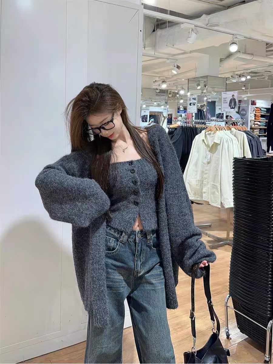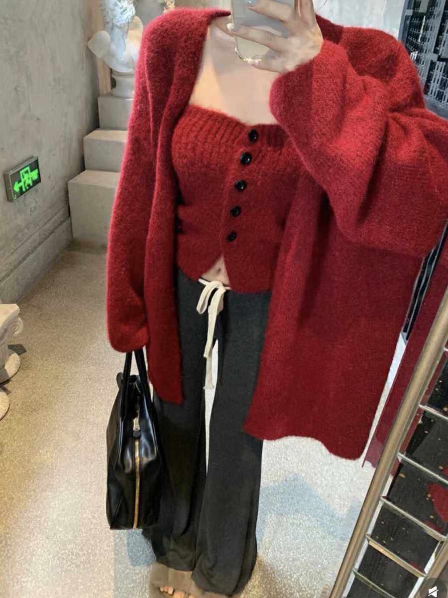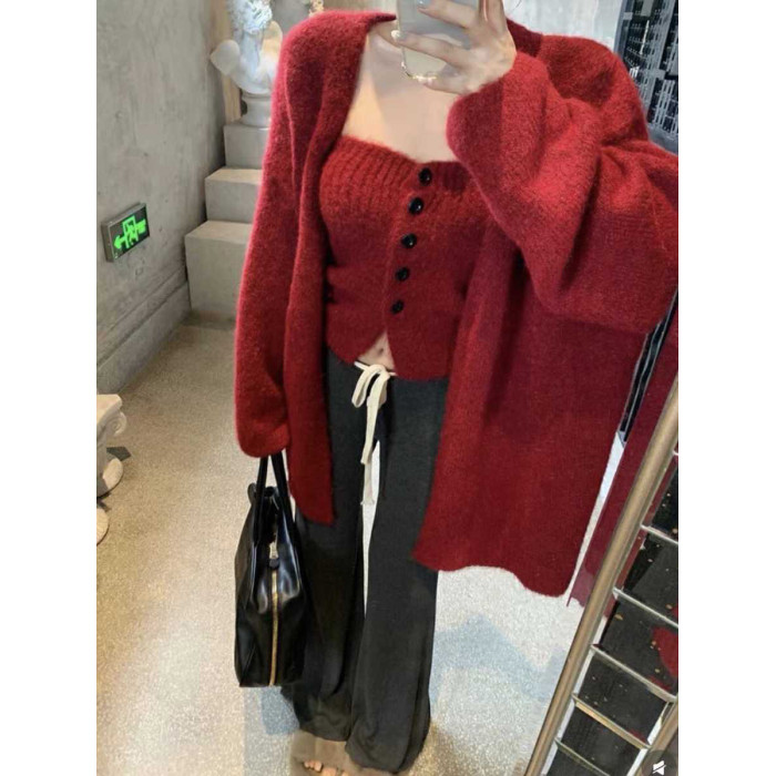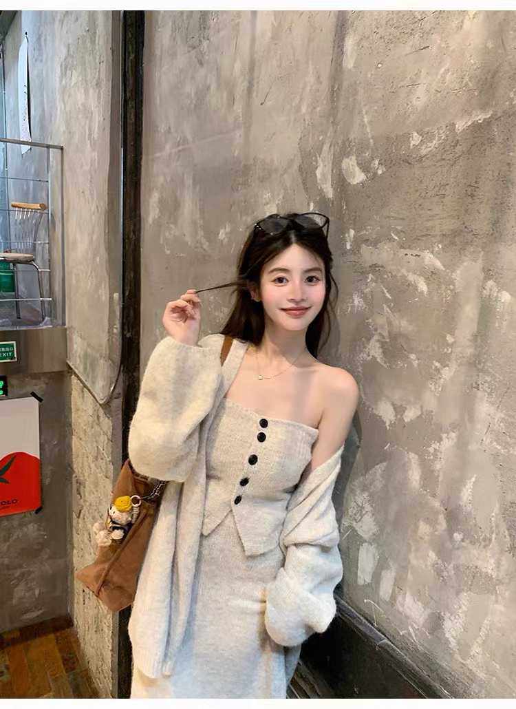 慵懶風中長款針織開衫抹胸背心兩件套酷辣毛衣外套吊帶套裝女秋冬