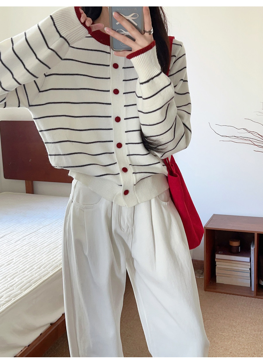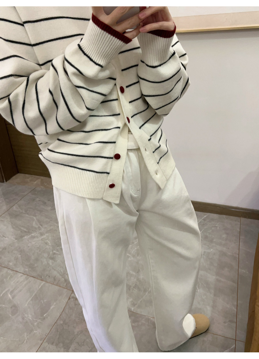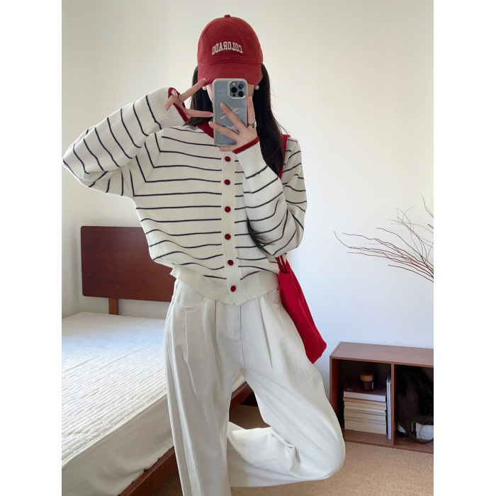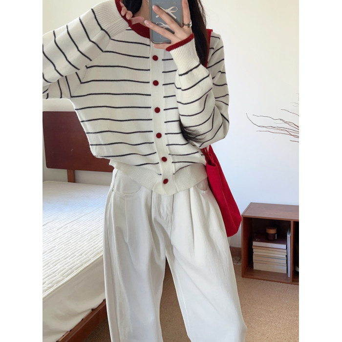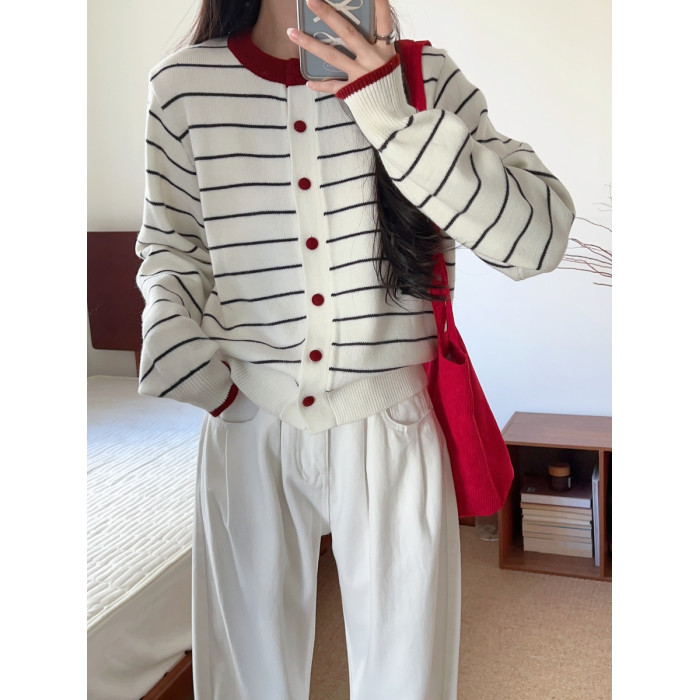 高級感小衆撞色條紋開衫上衣女春秋季紐釦圓領長袖百搭針織衫外套