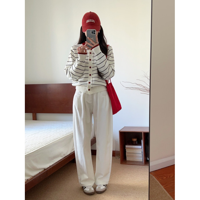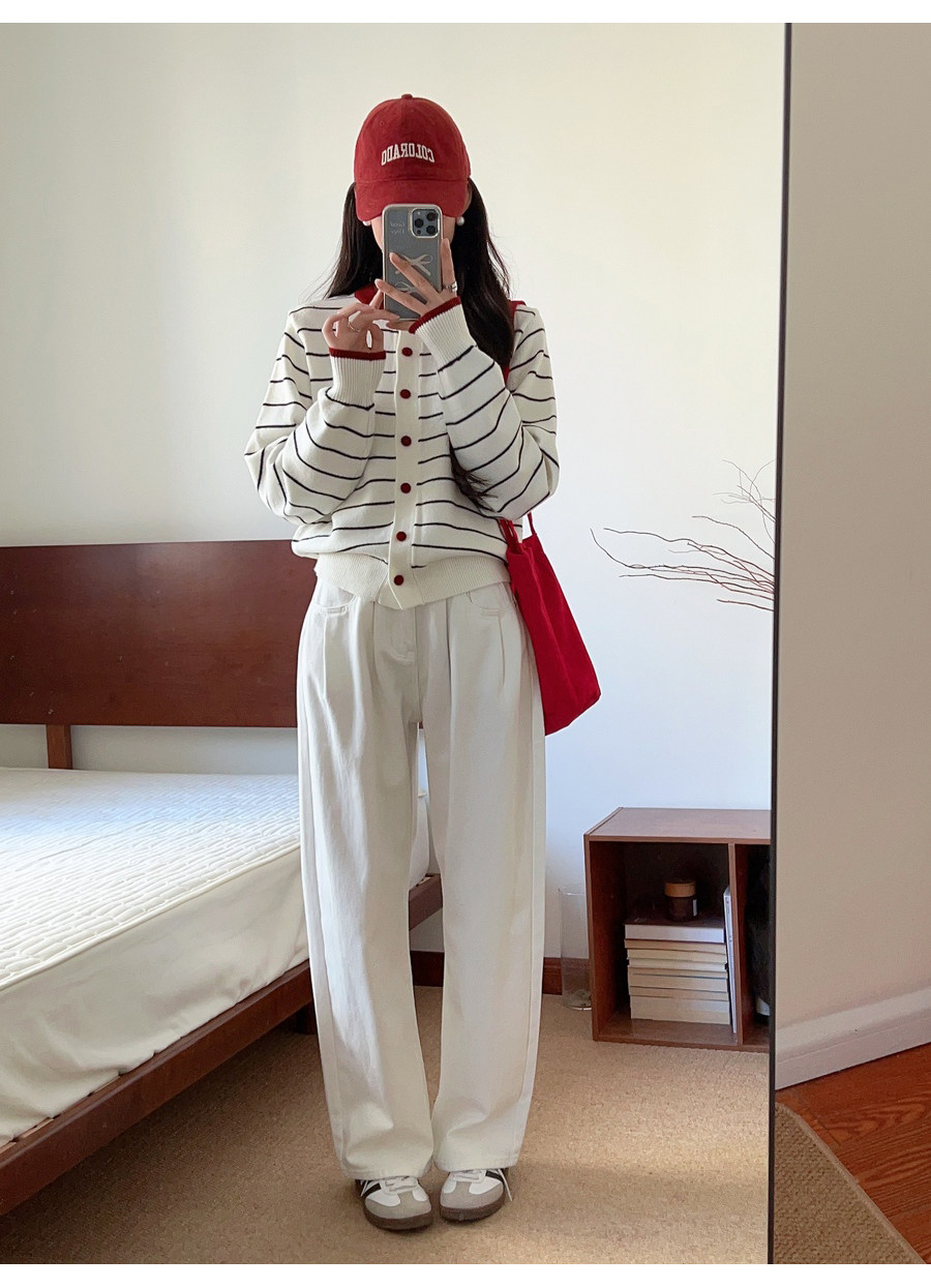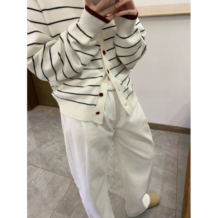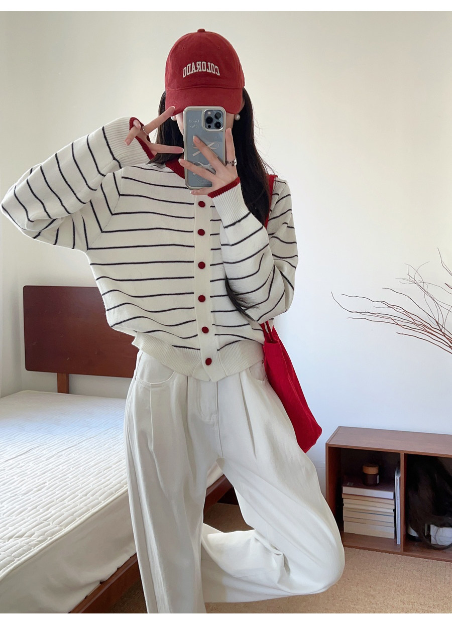 高級感小衆撞色條紋開衫上衣女春秋季紐釦圓領長袖百搭針織衫外套