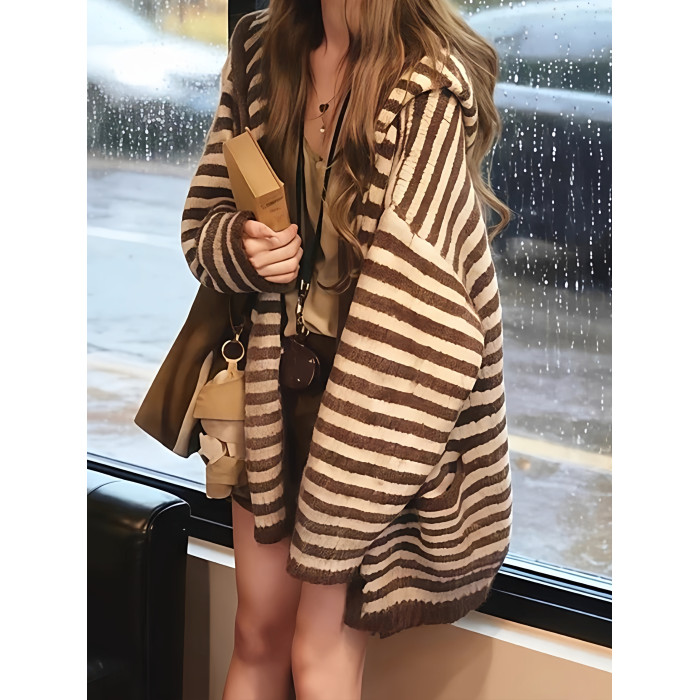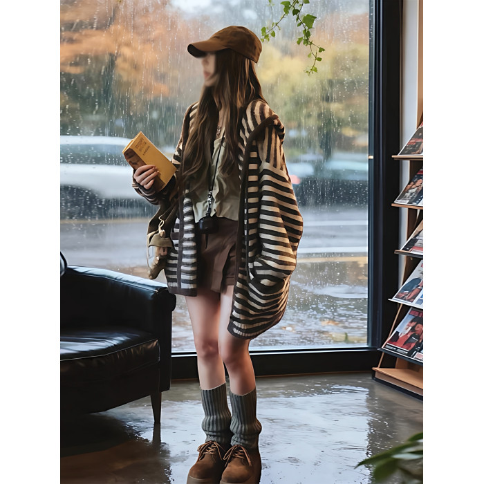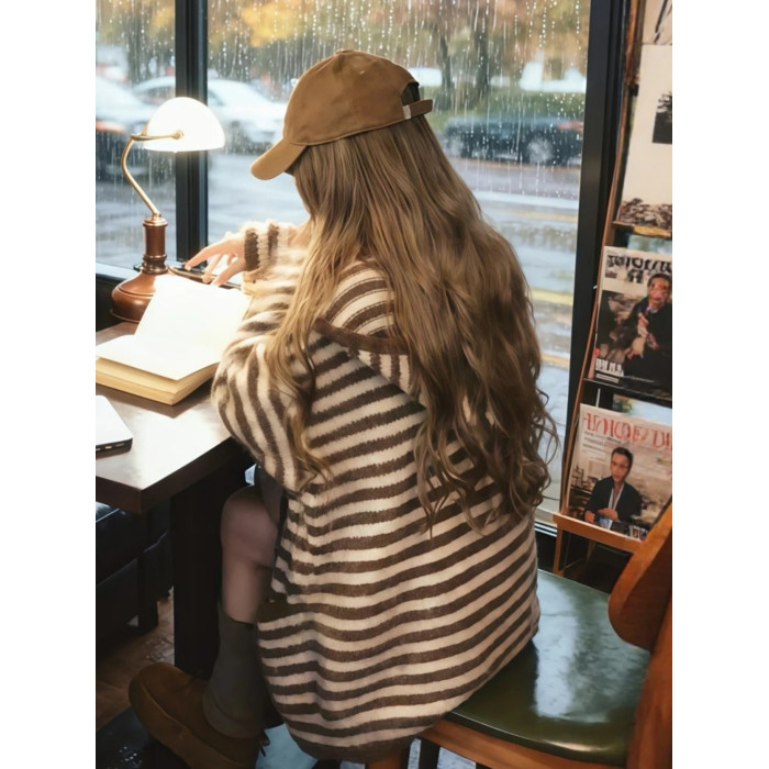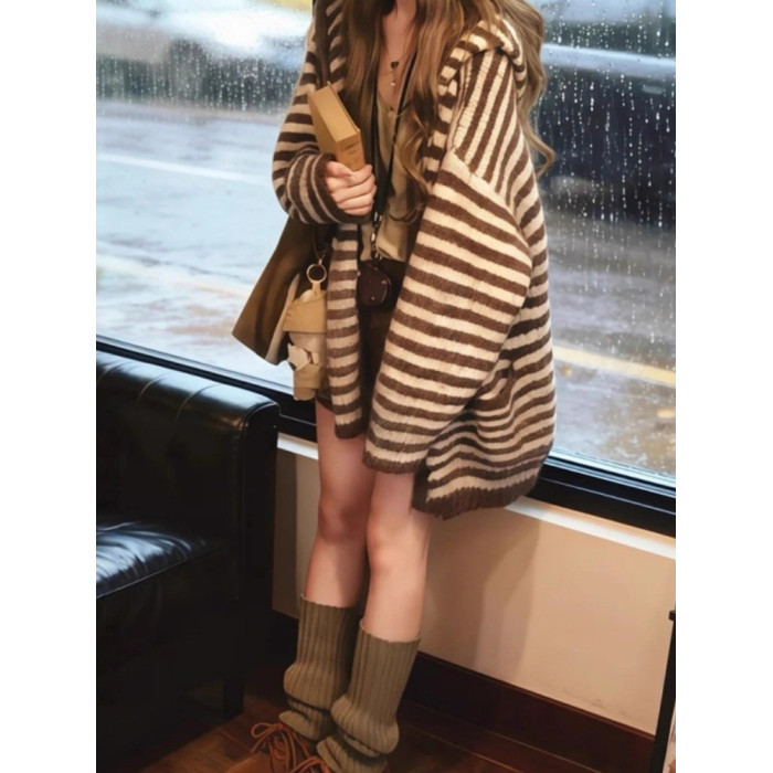 咖色中長款條紋長袖連帽開衫外套女2025早秋季韓系漂亮慵懶風上衣
