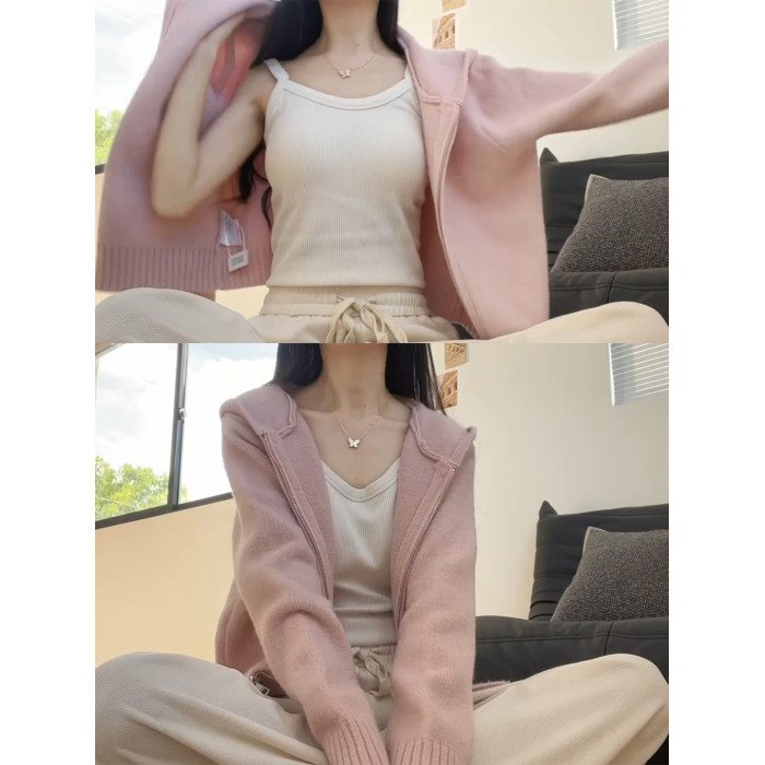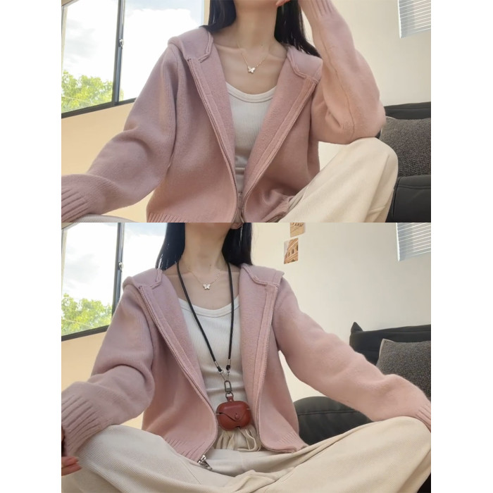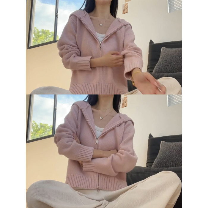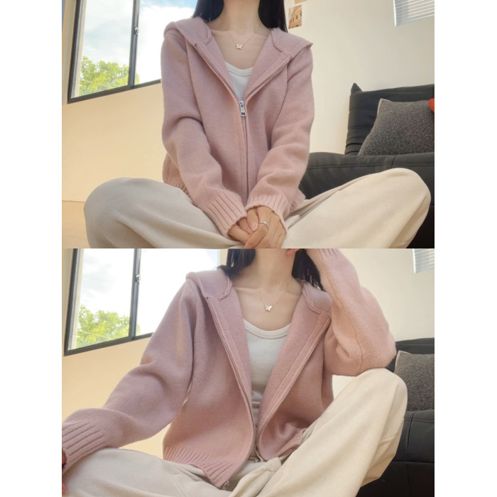 粉色連帽針織衫上衣女秋冬2025秋季拉鍊慵懶軟糯外搭毛衣開衫外套