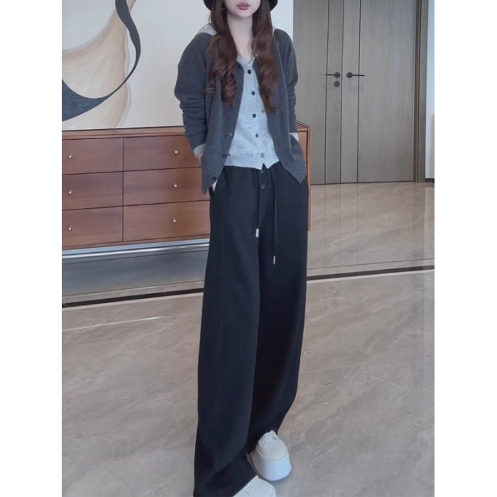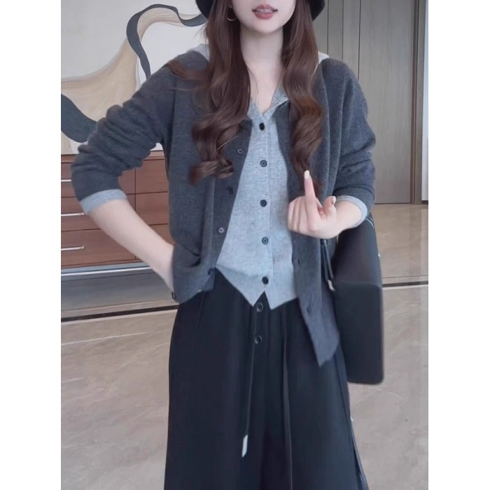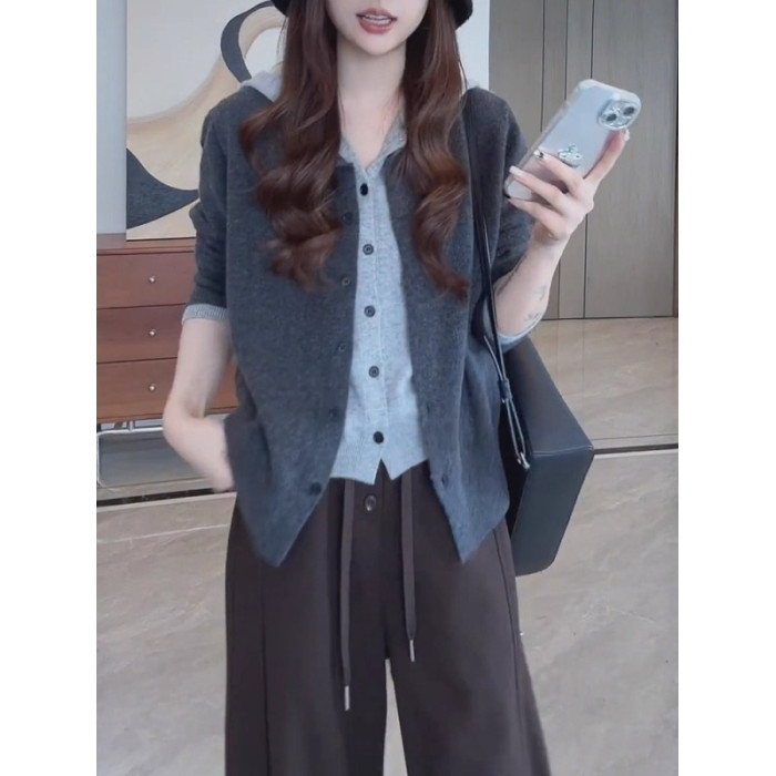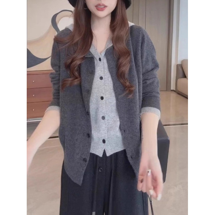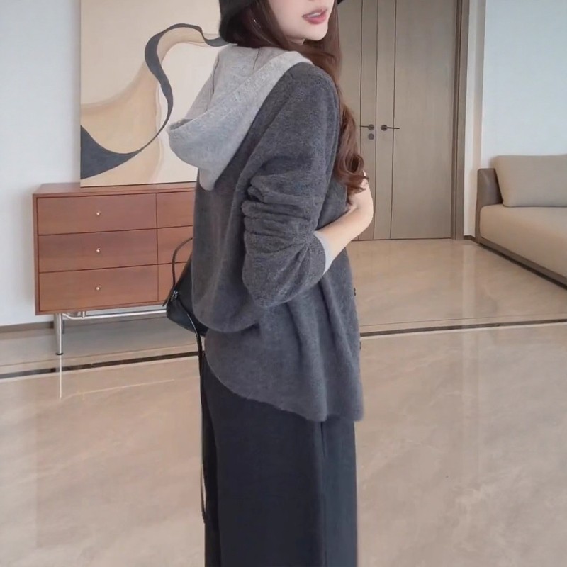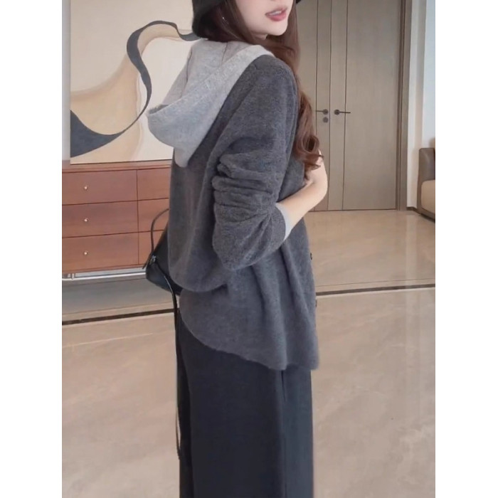 大碼連帽假兩件針織衫女春季胖MM顯瘦寬鬆慵嬾風長袖毛衣開衫上衣