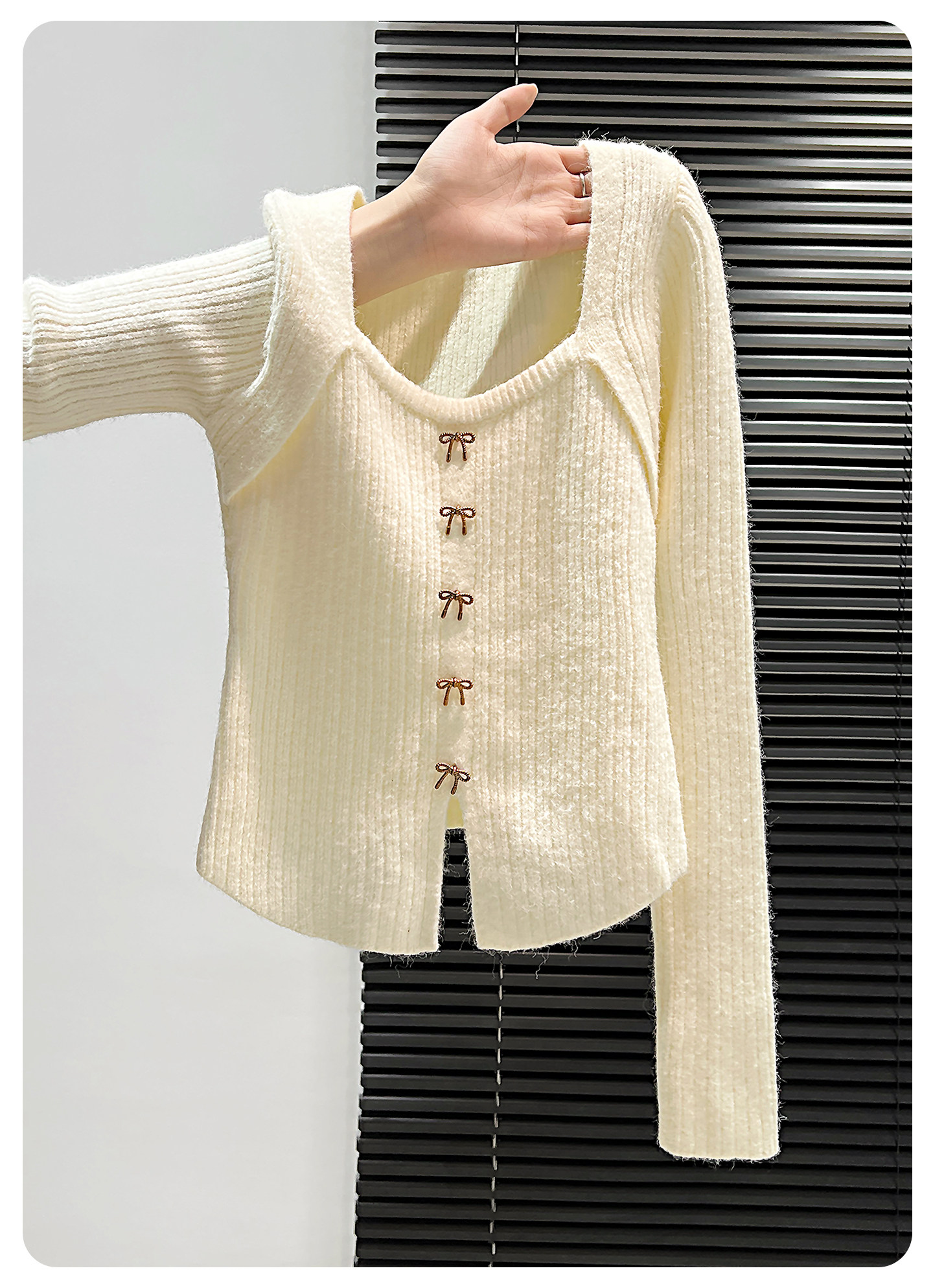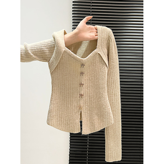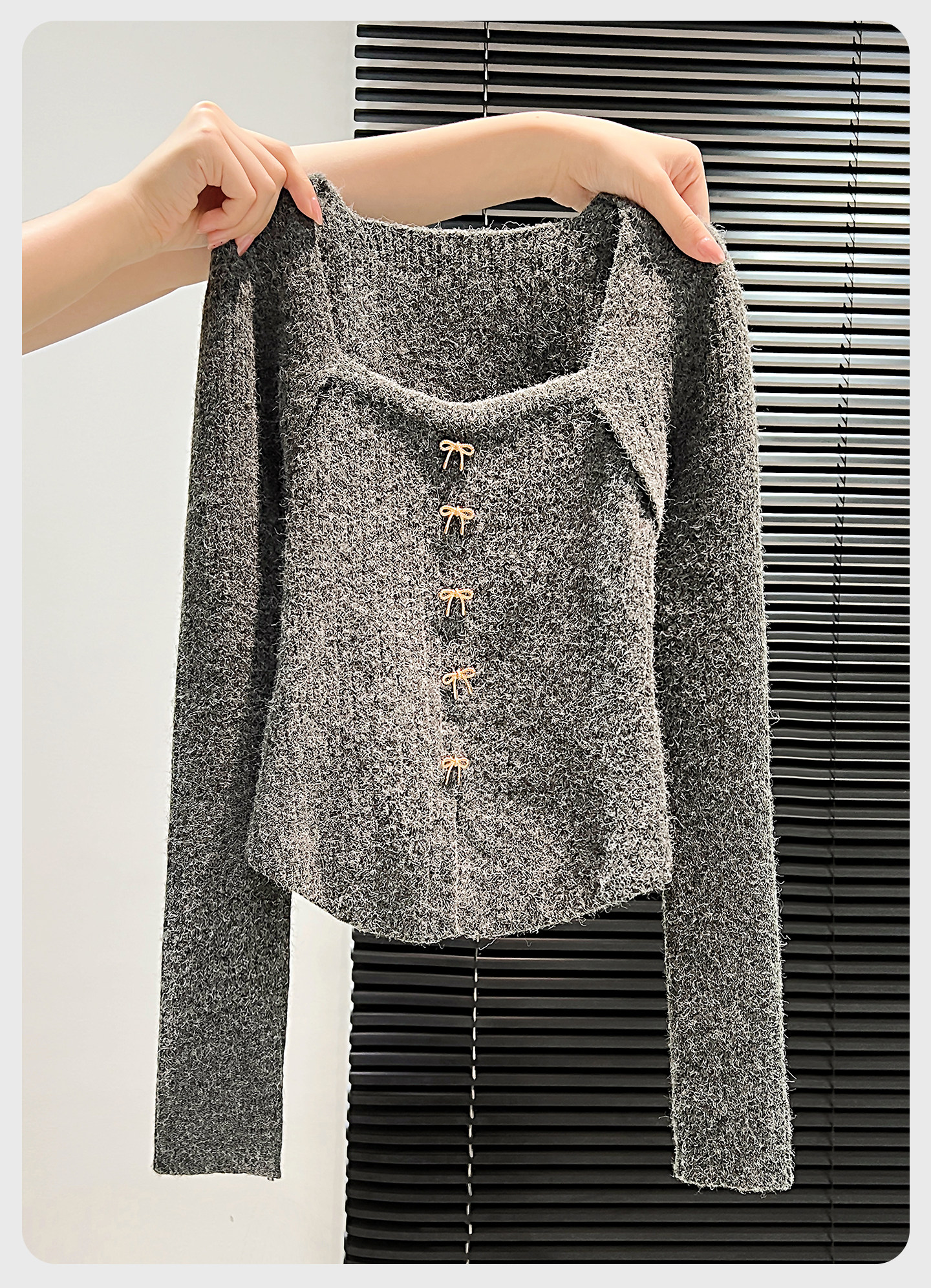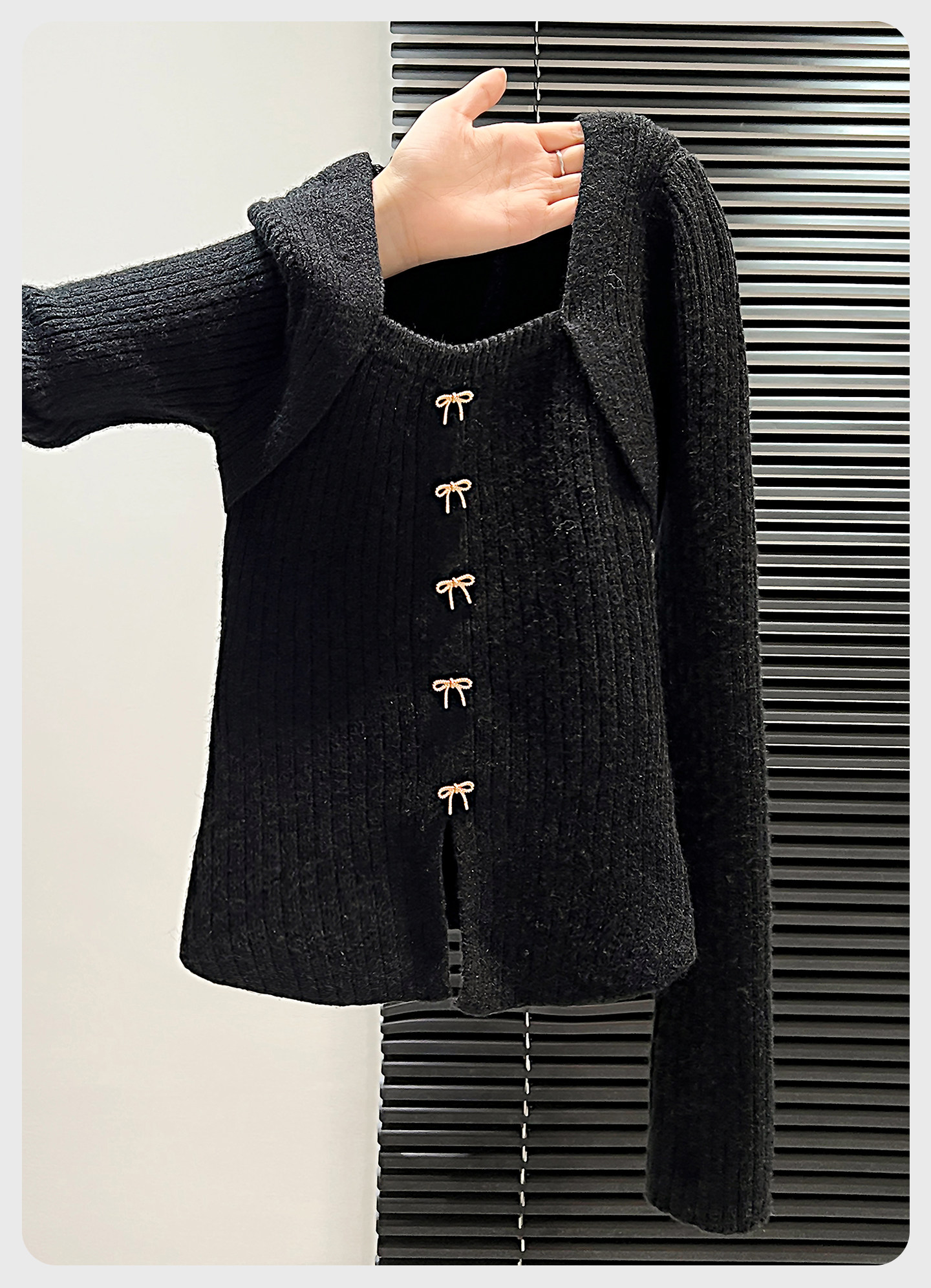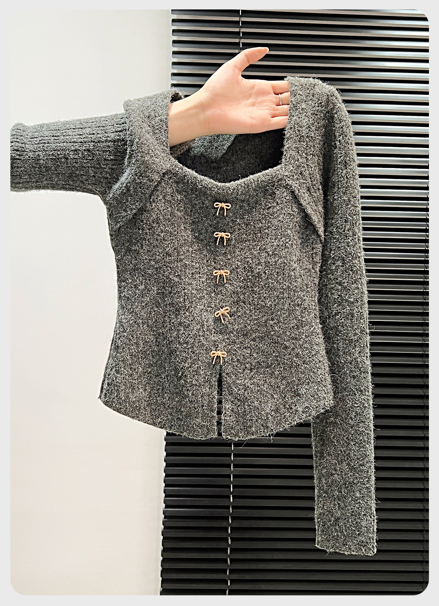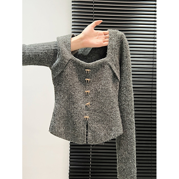 復古灰色蝴蝶結方領針織衫毛衣女秋冬季修身打底衫女內搭針織上衣
