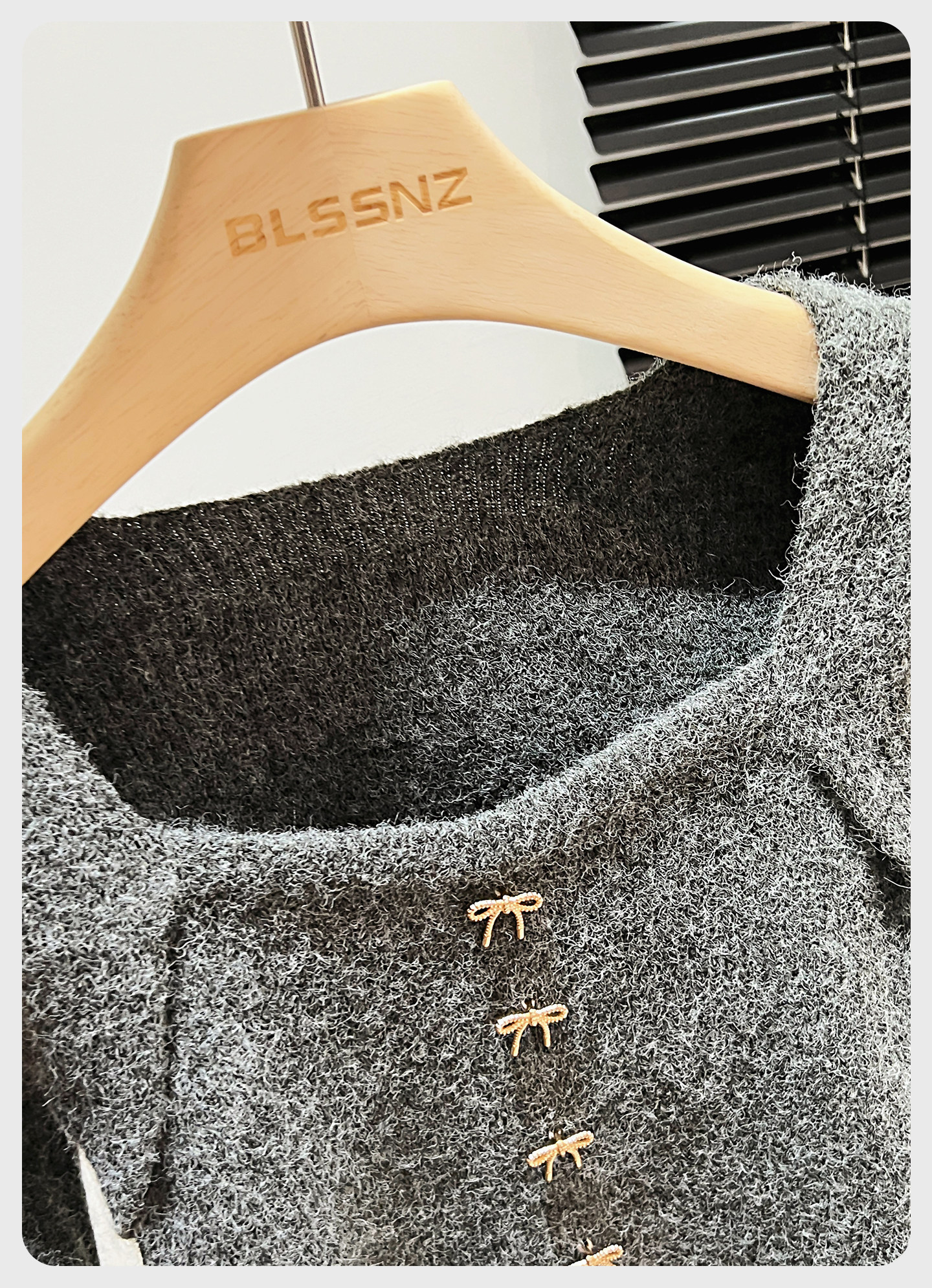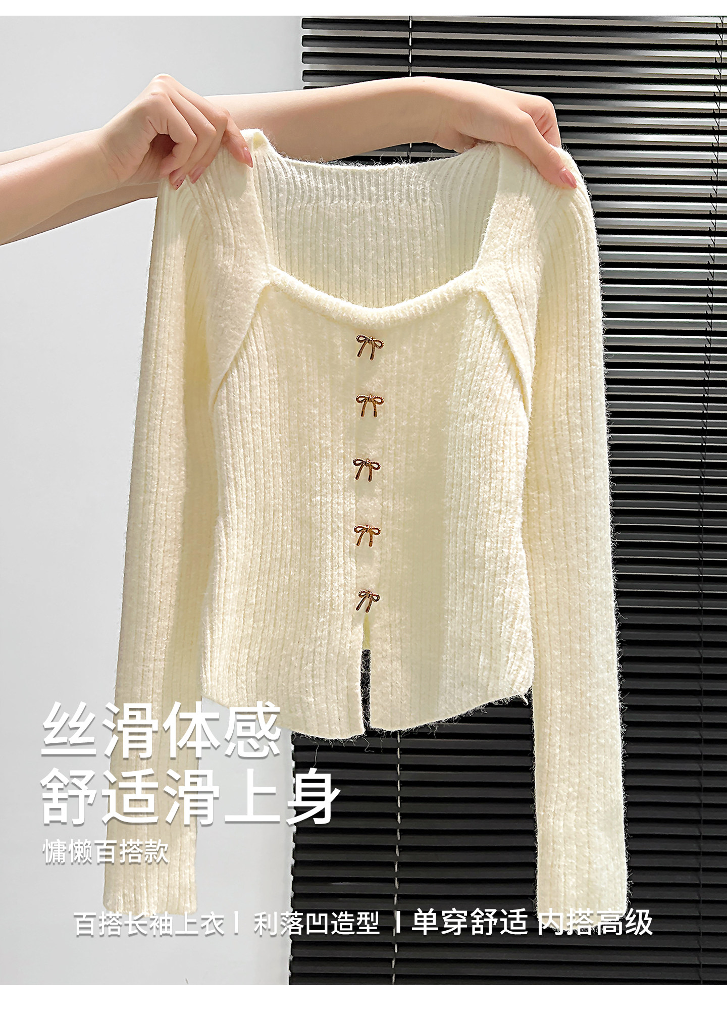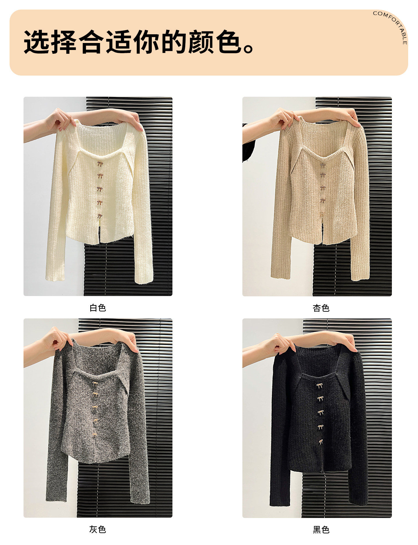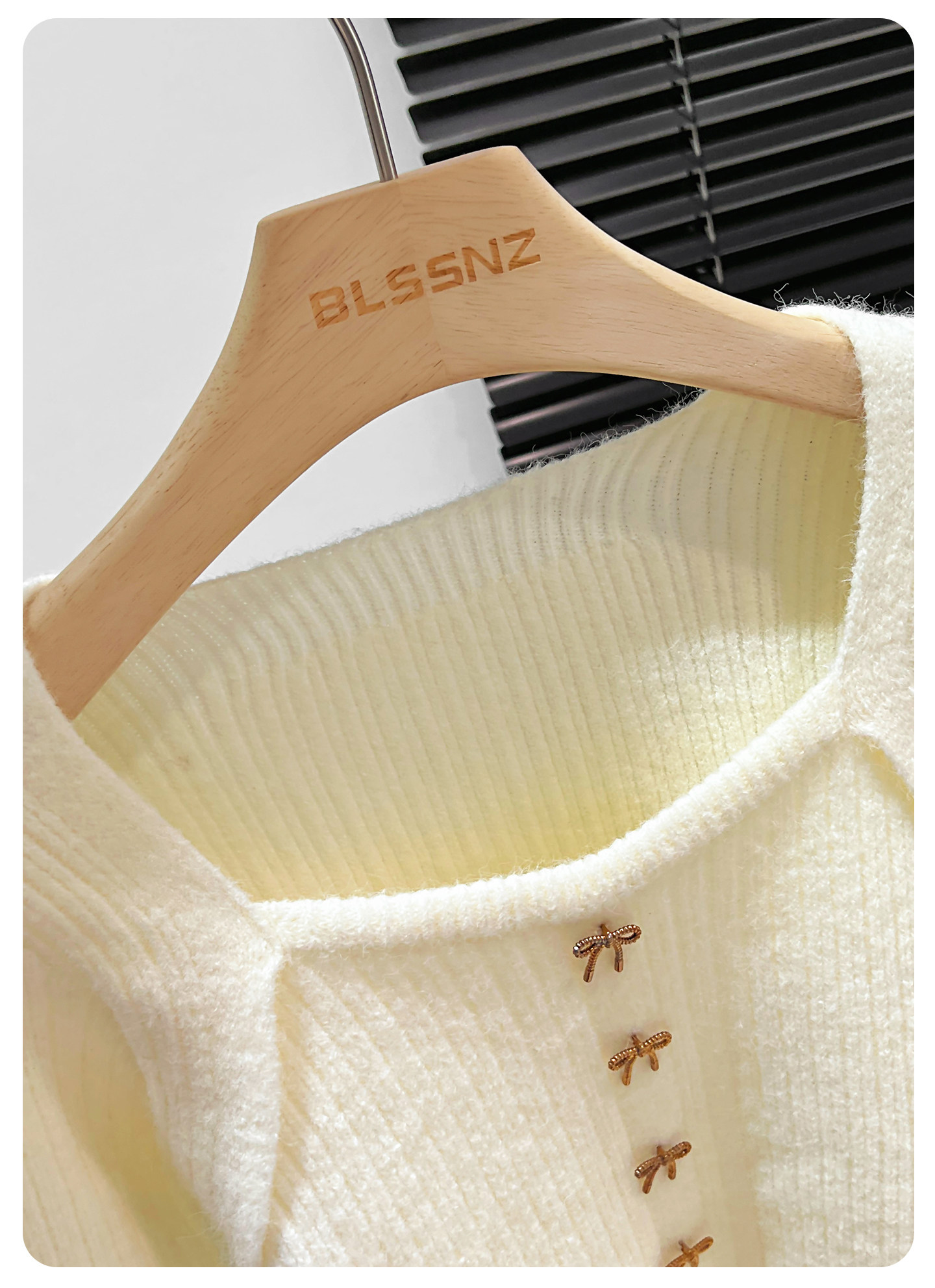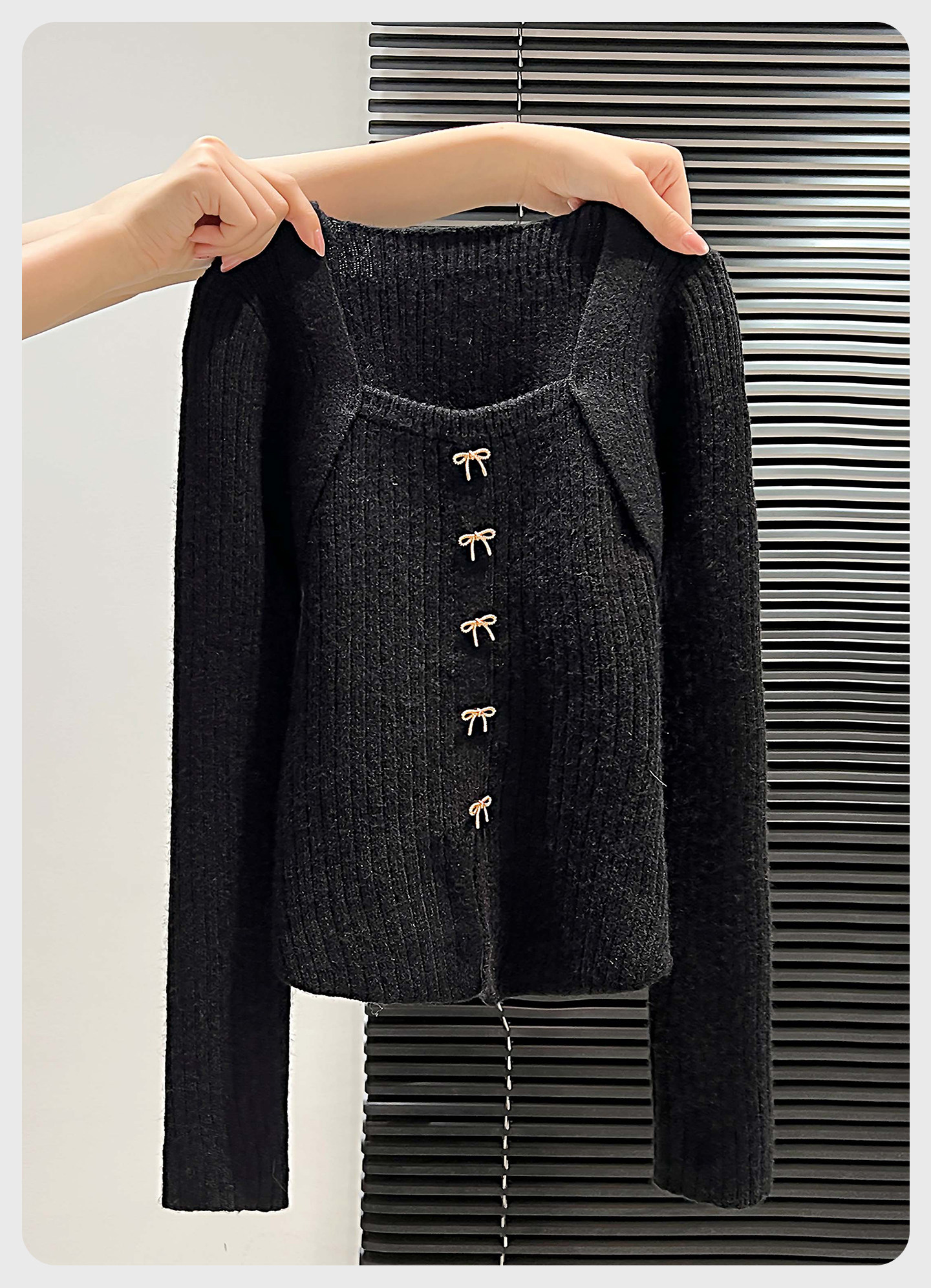 復古灰色蝴蝶結方領針織衫毛衣女秋冬季修身打底衫女內搭針織上衣