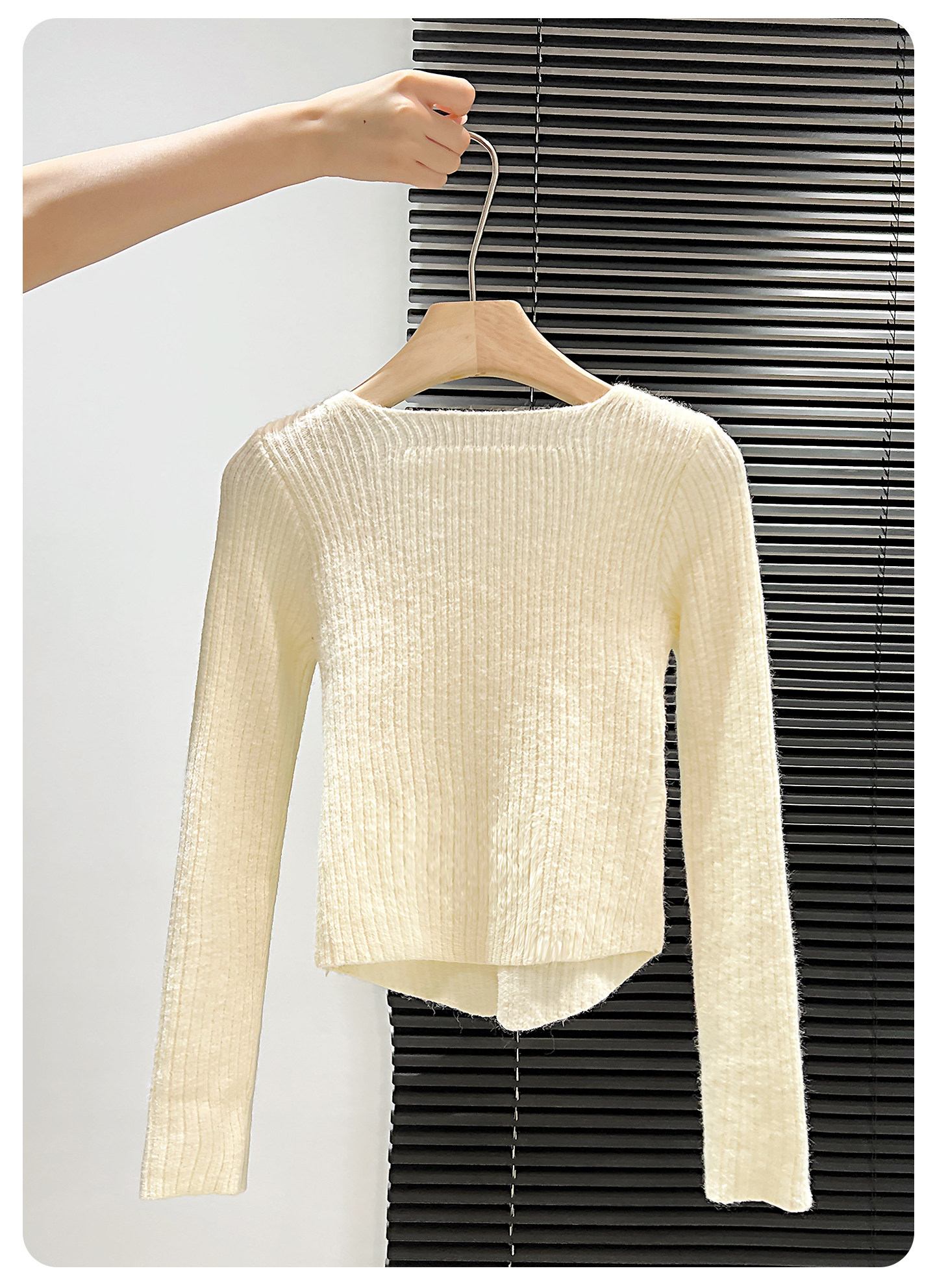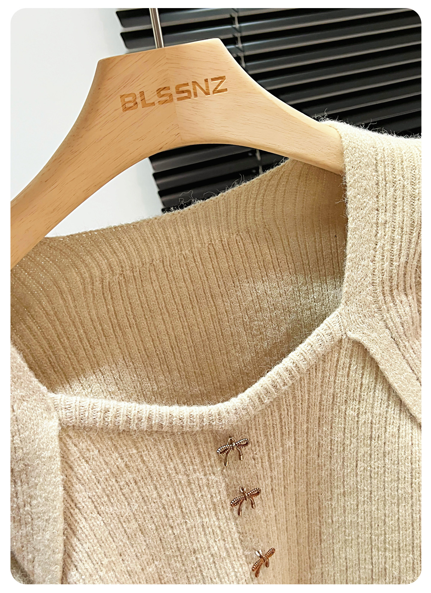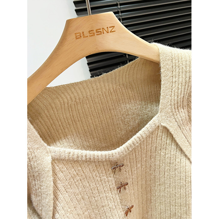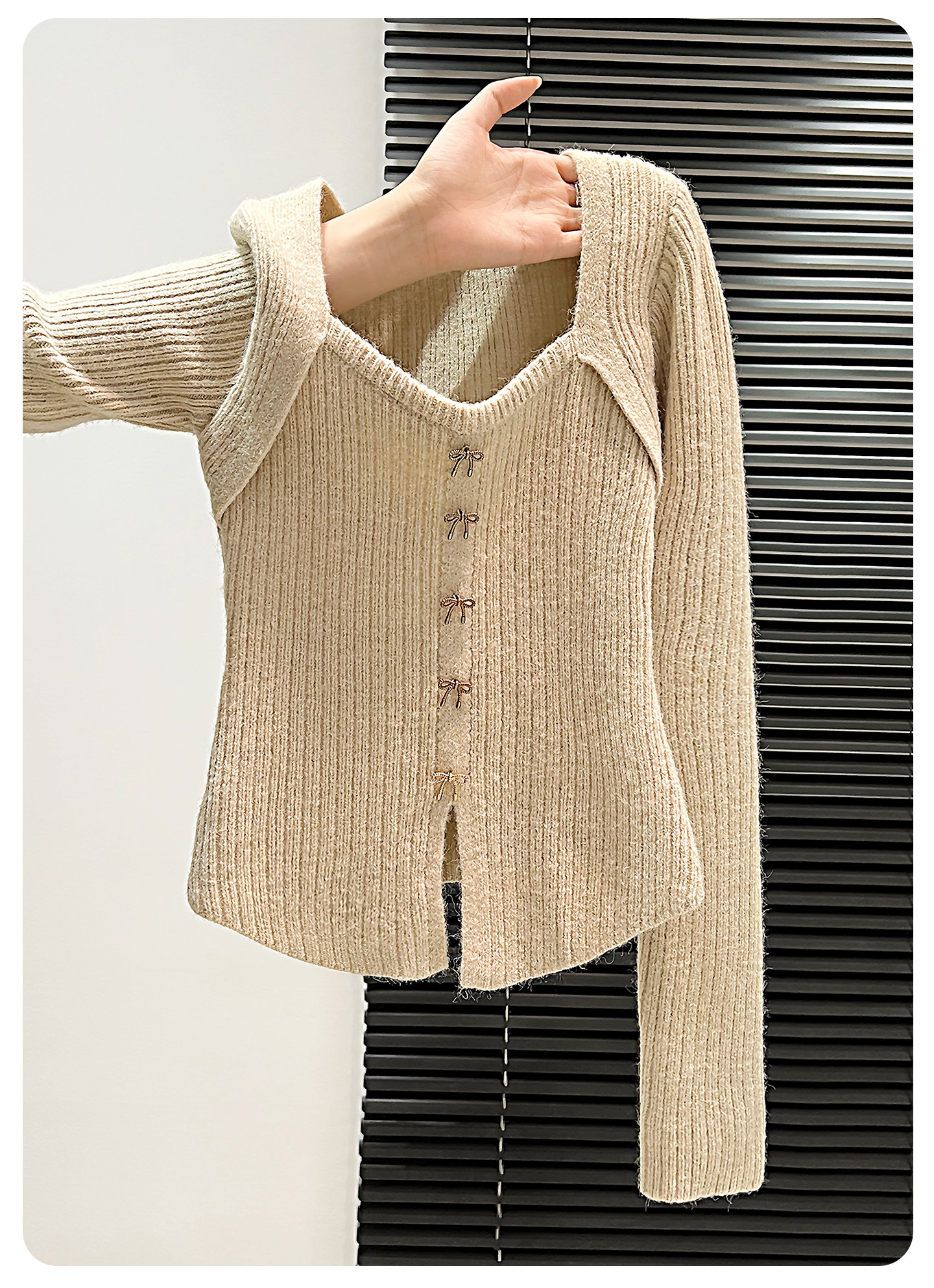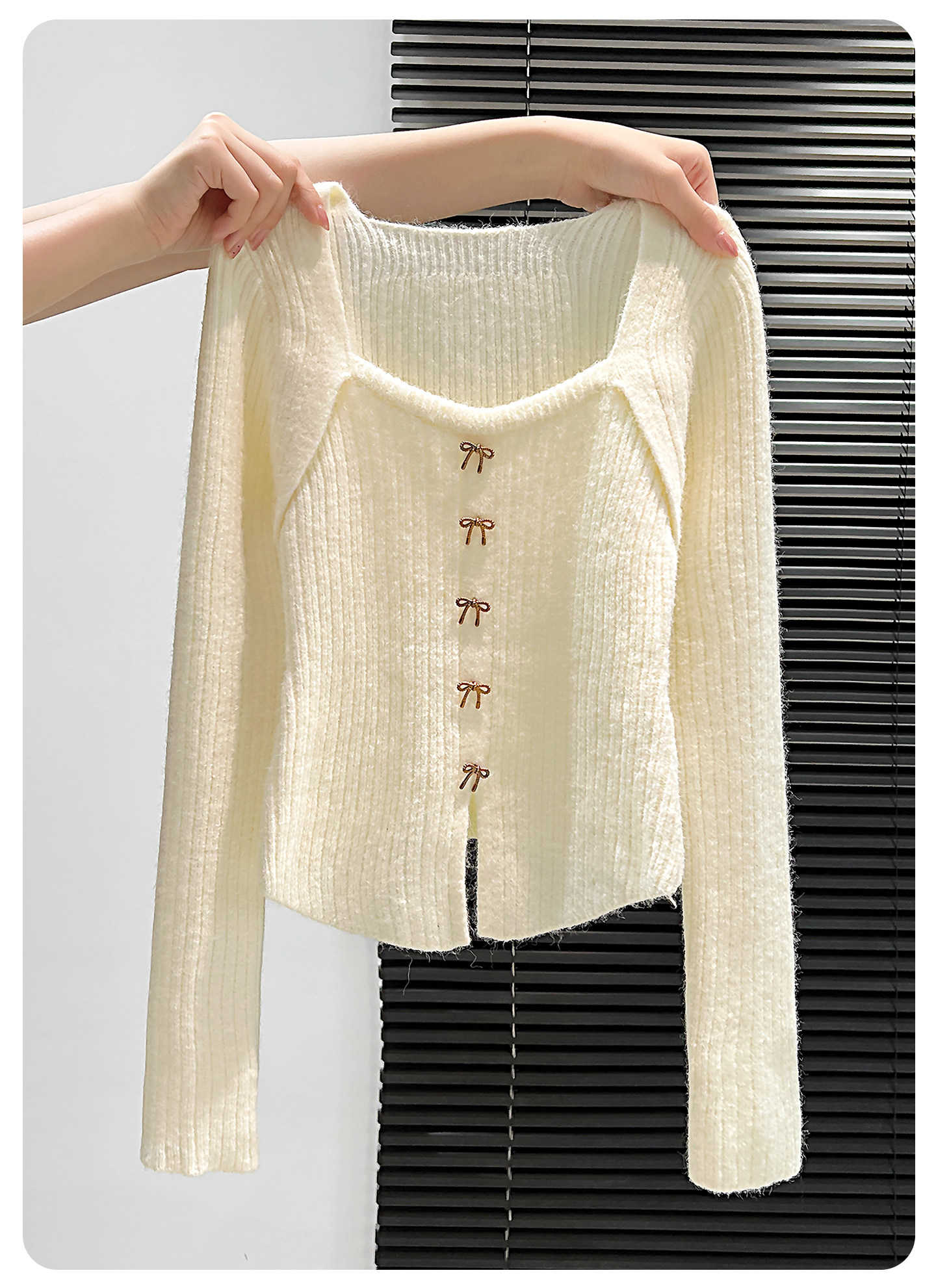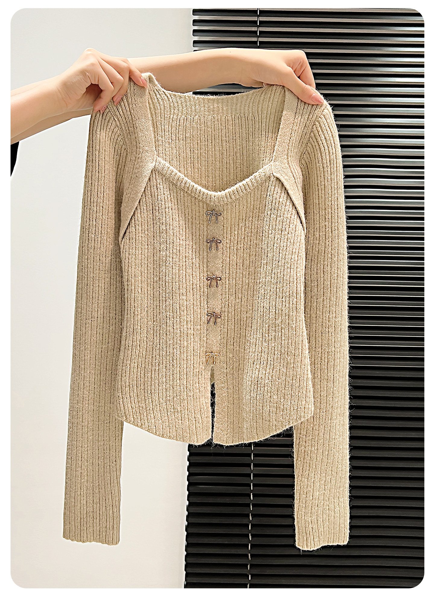 復古灰色蝴蝶結方領針織衫毛衣女秋冬季修身打底衫女內搭針織上衣