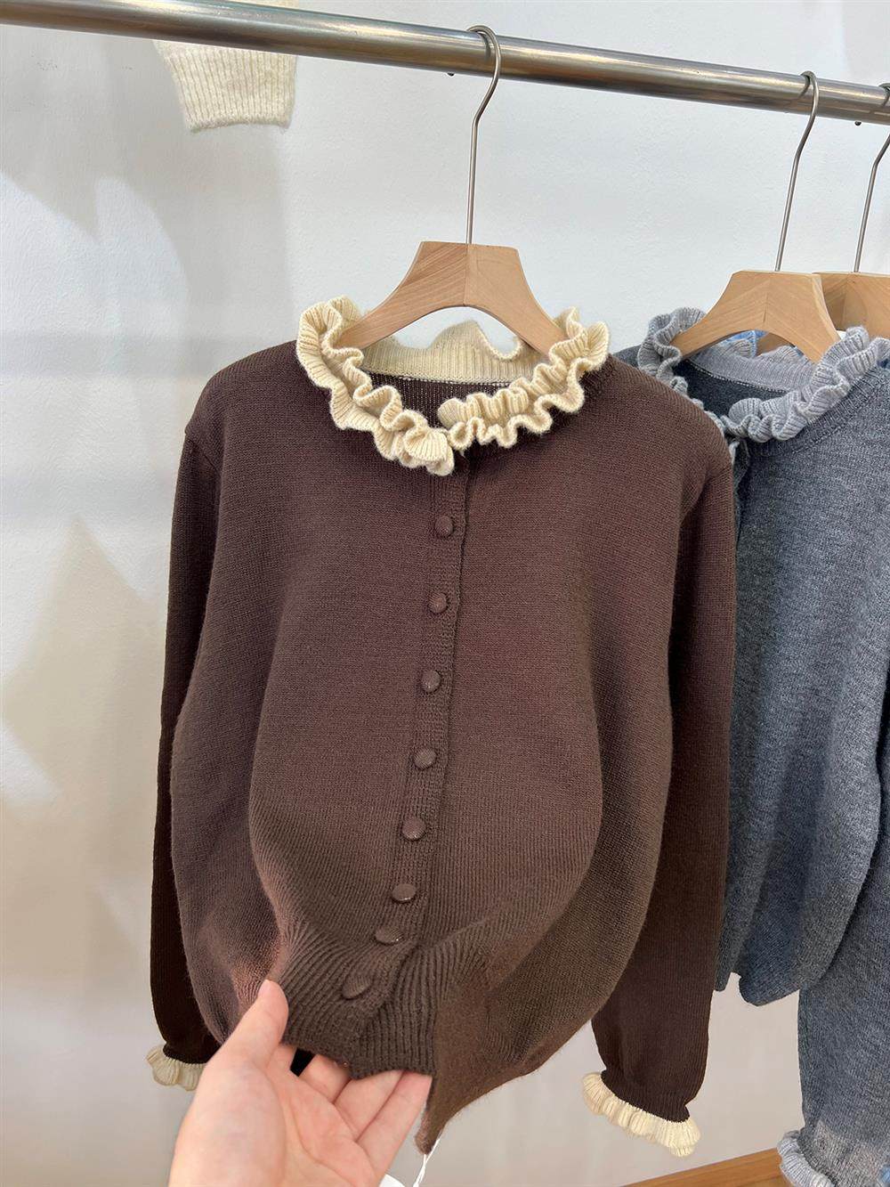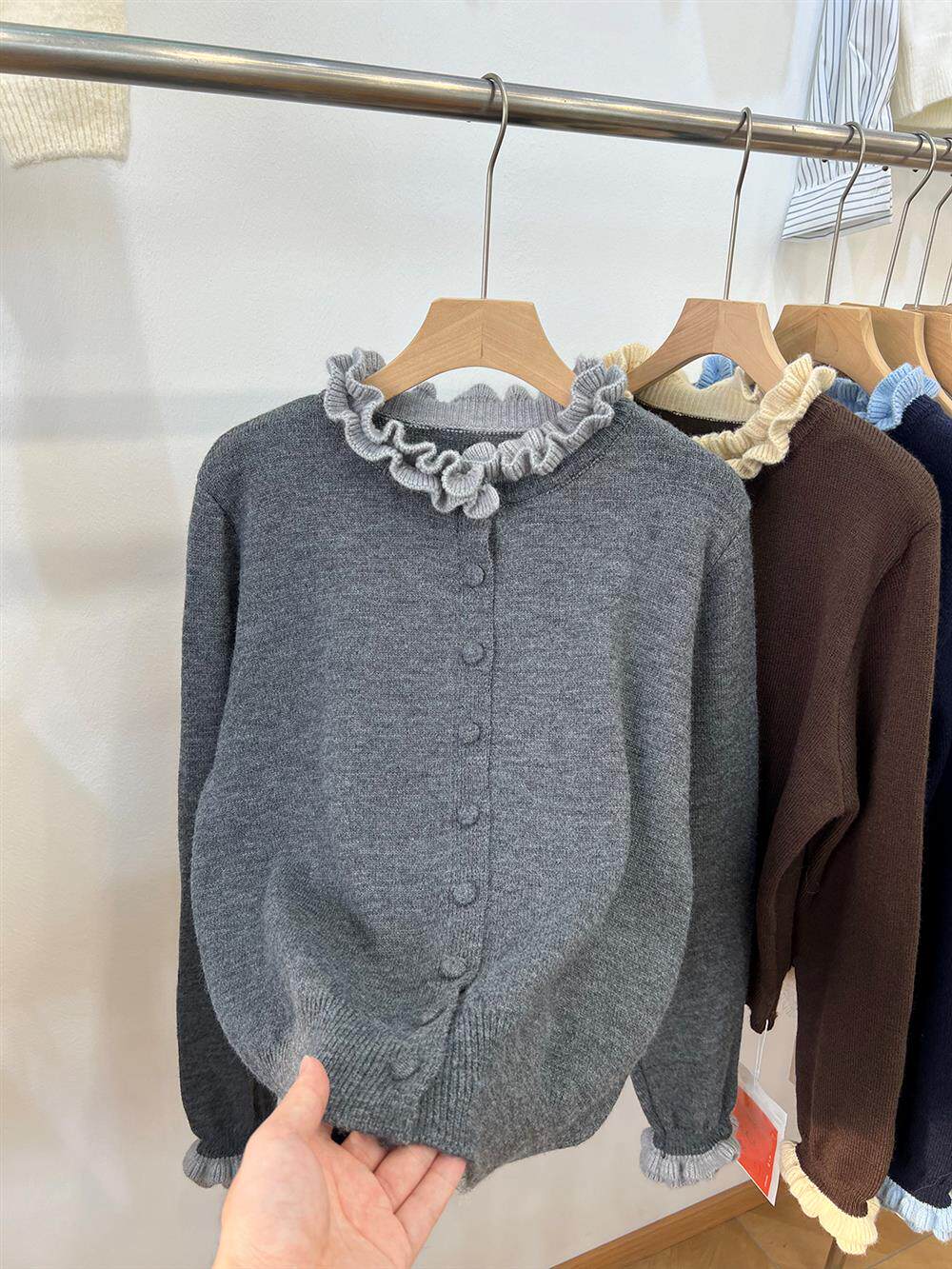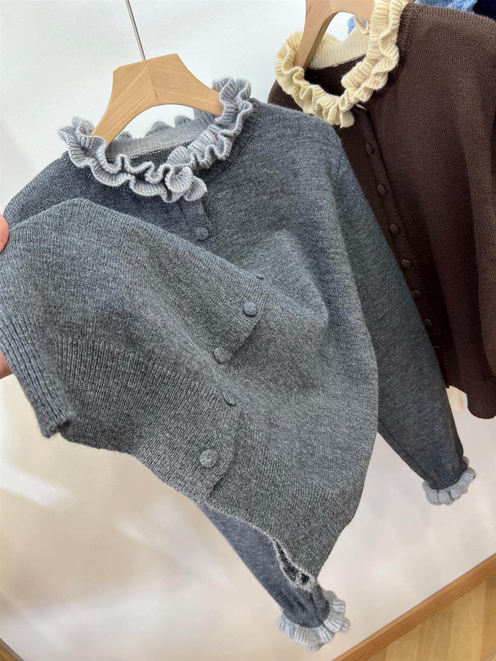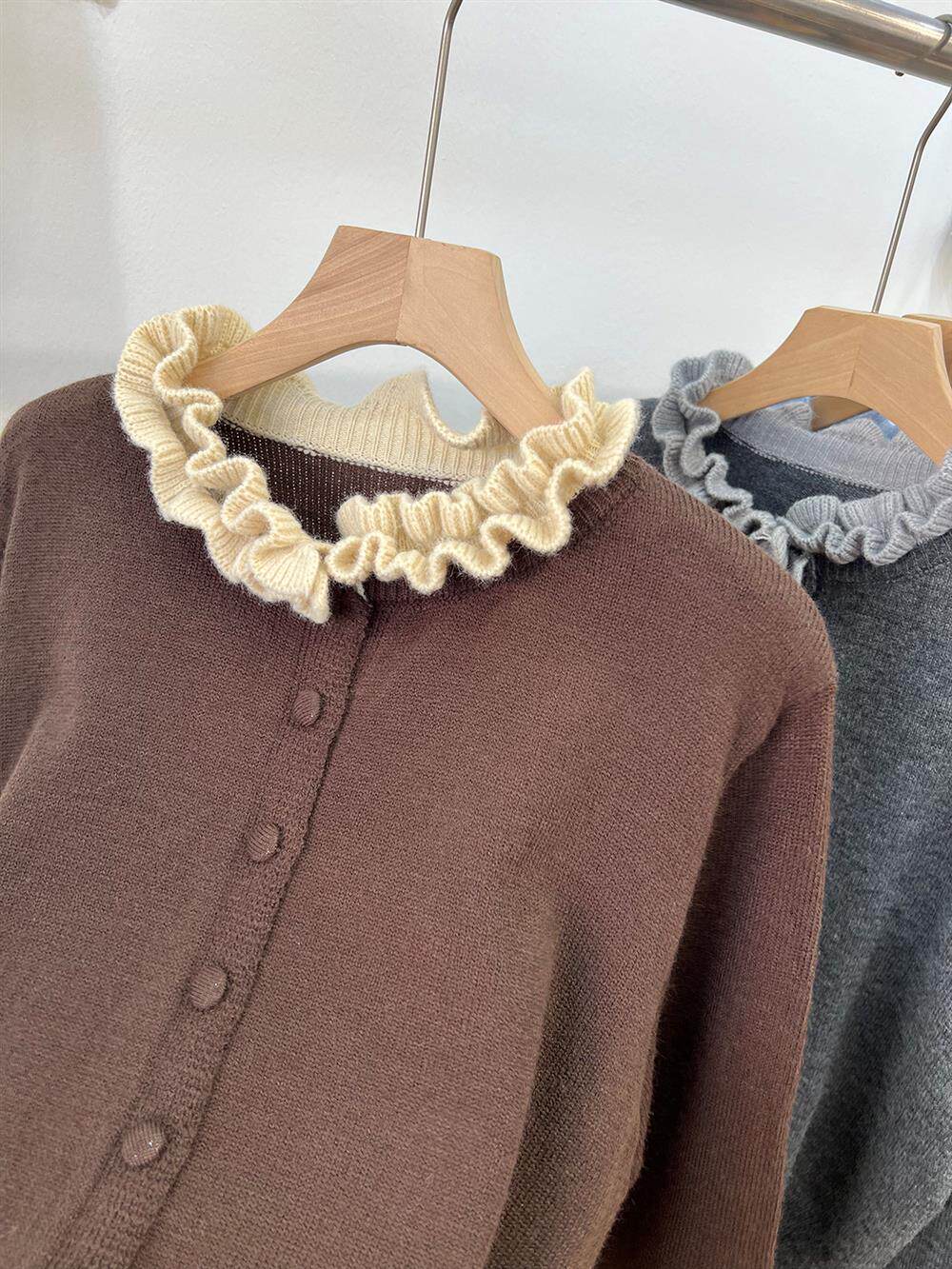 小個子木耳花邊拼接軟糯毛衣開衫女秋冬新款顯瘦針織外套打底上衣