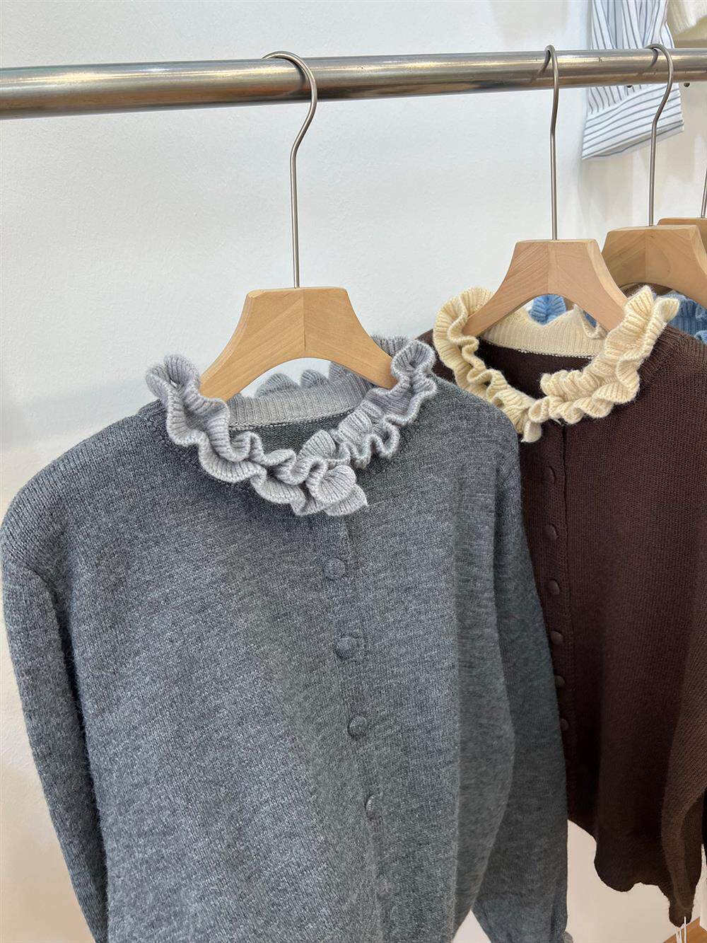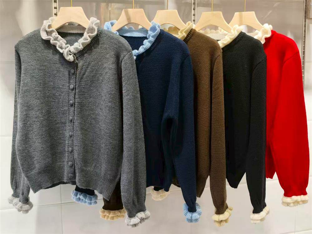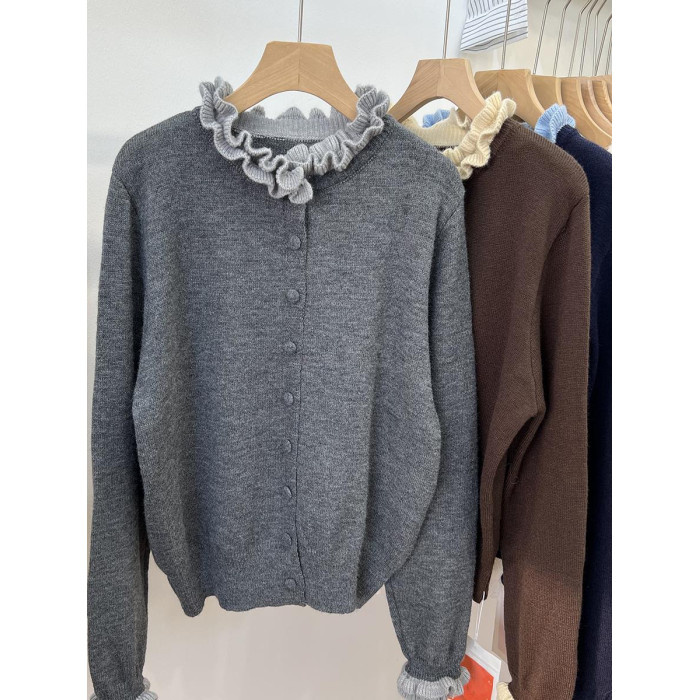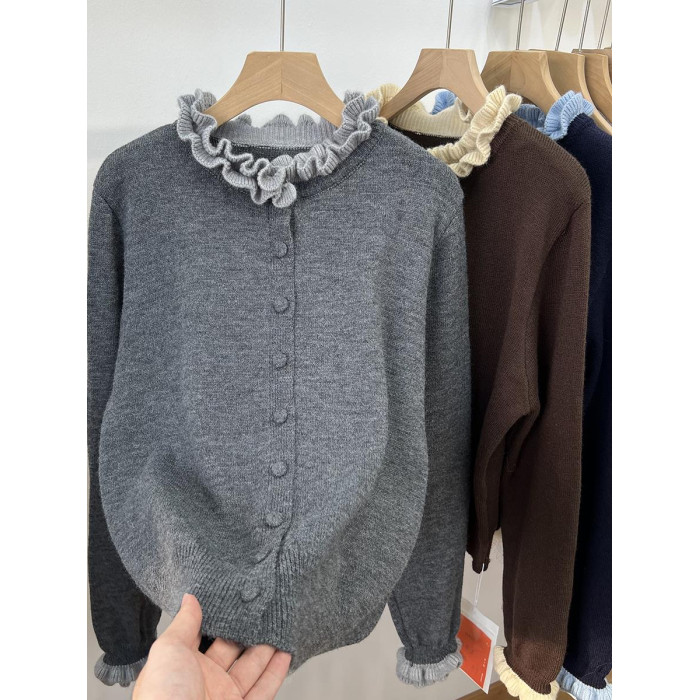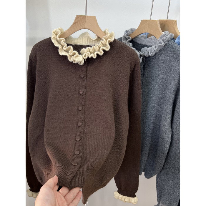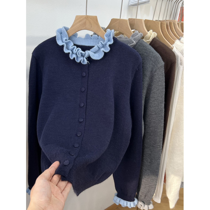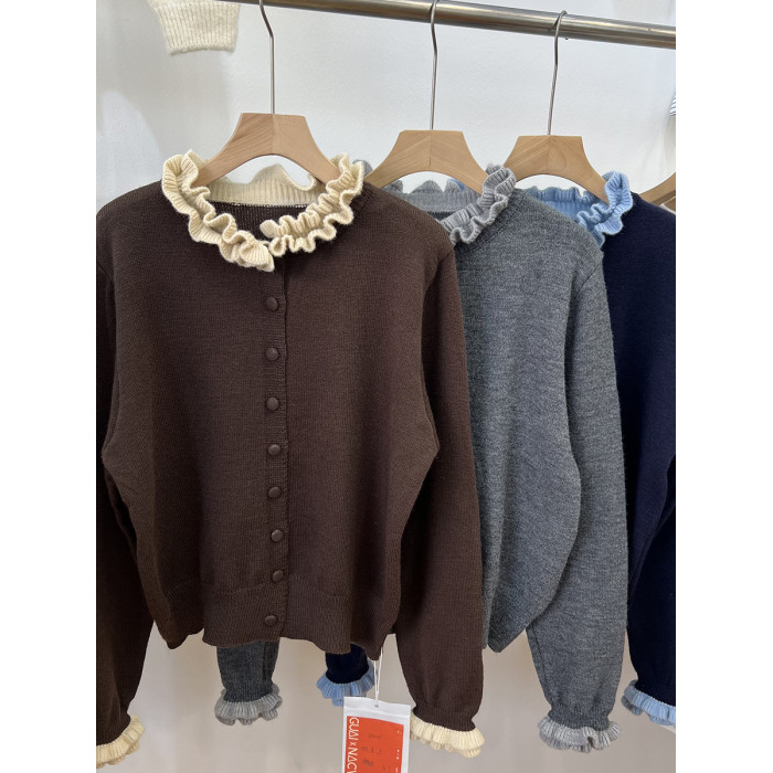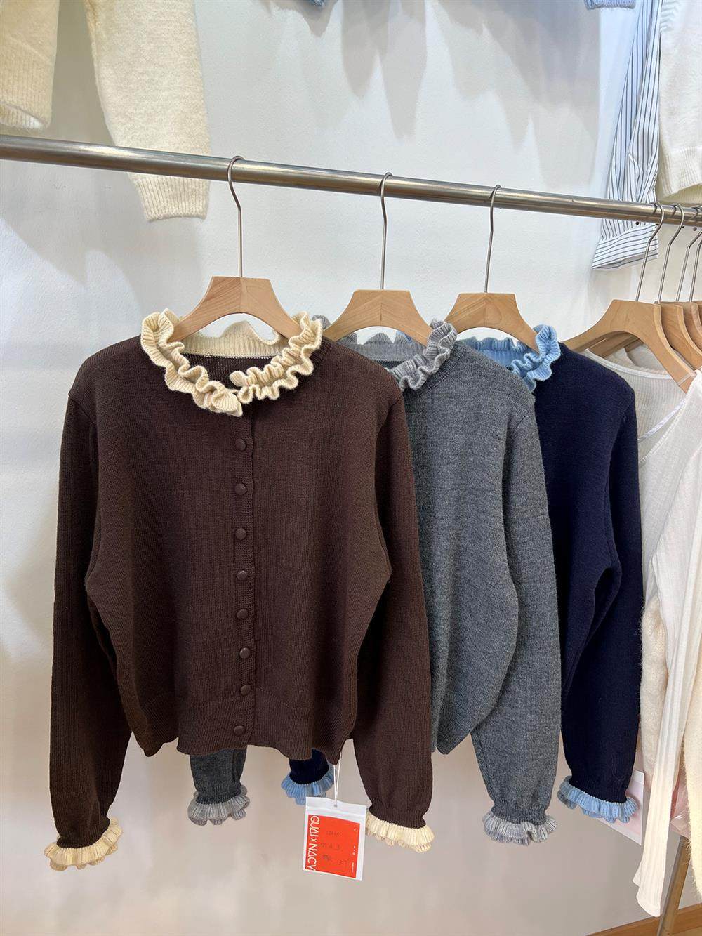小個子木耳花邊拼接軟糯毛衣開衫女秋冬新款顯瘦針織外套打底上衣