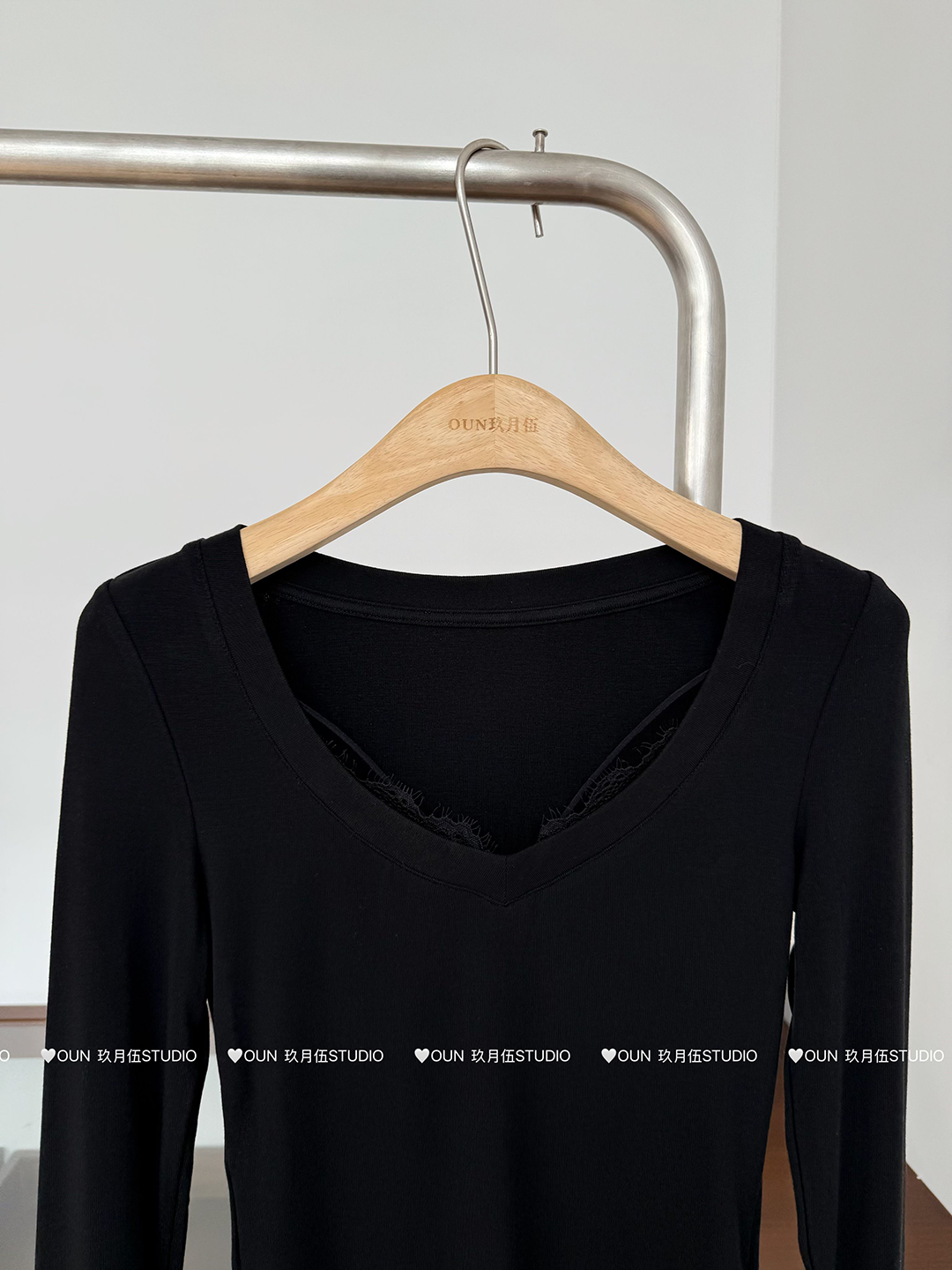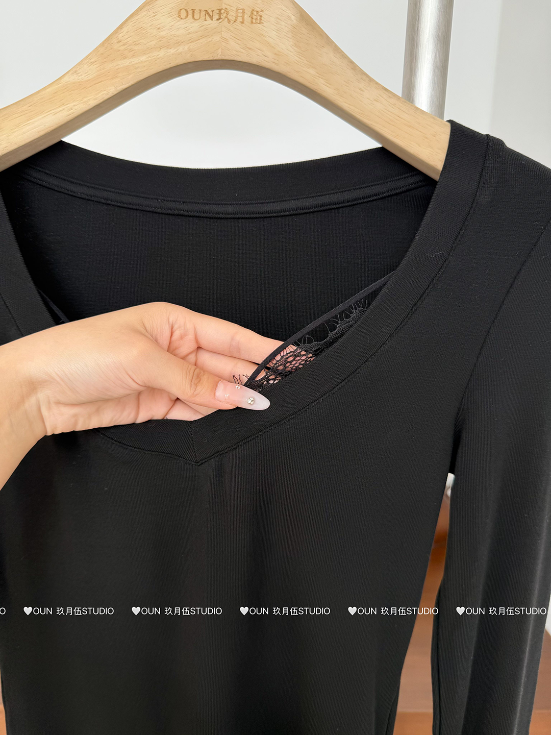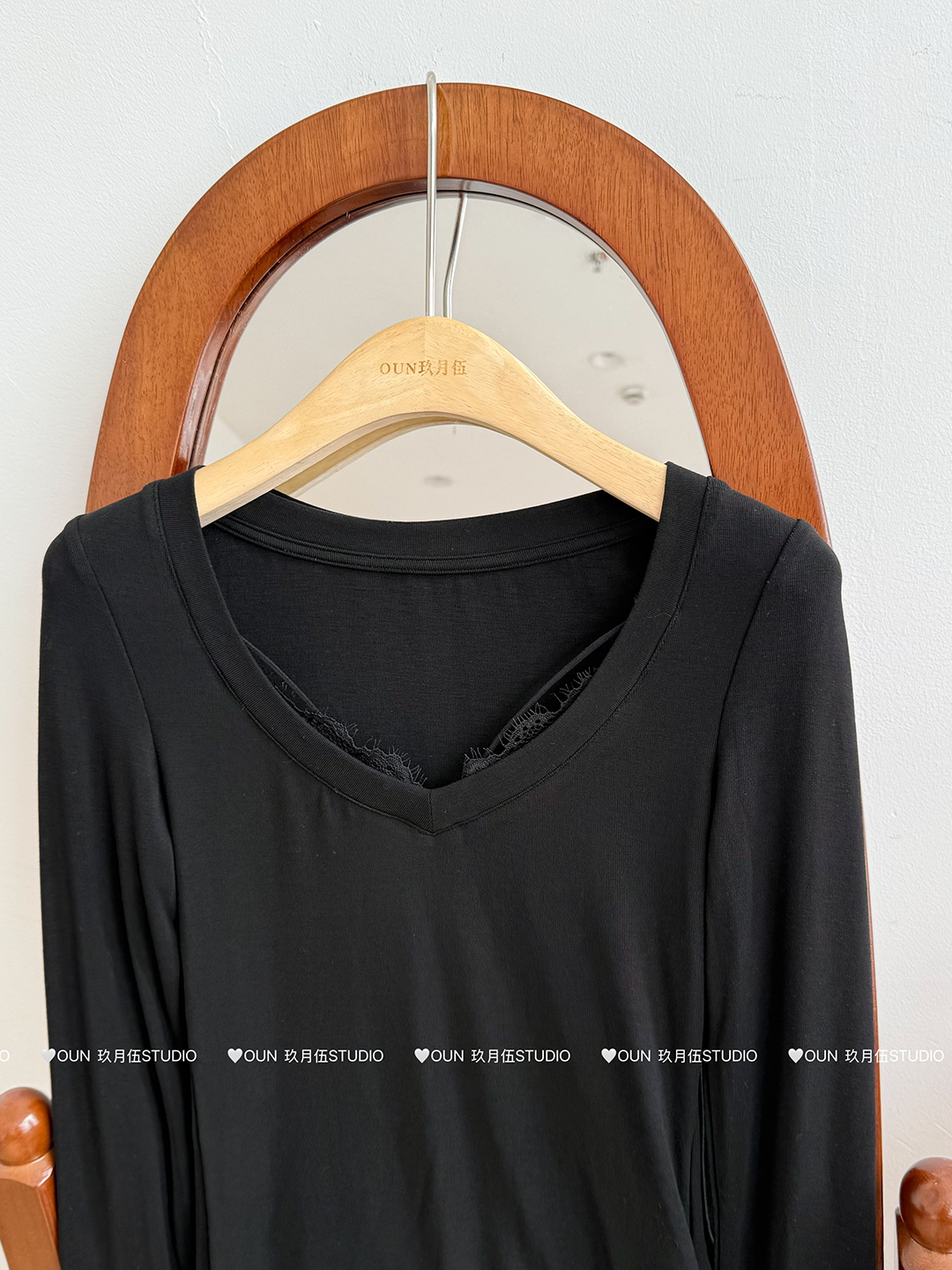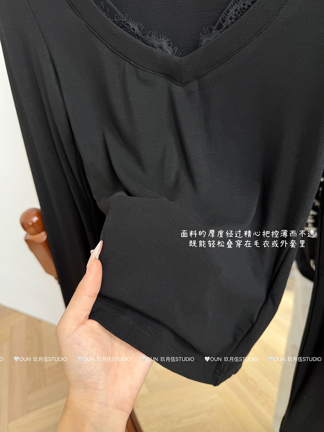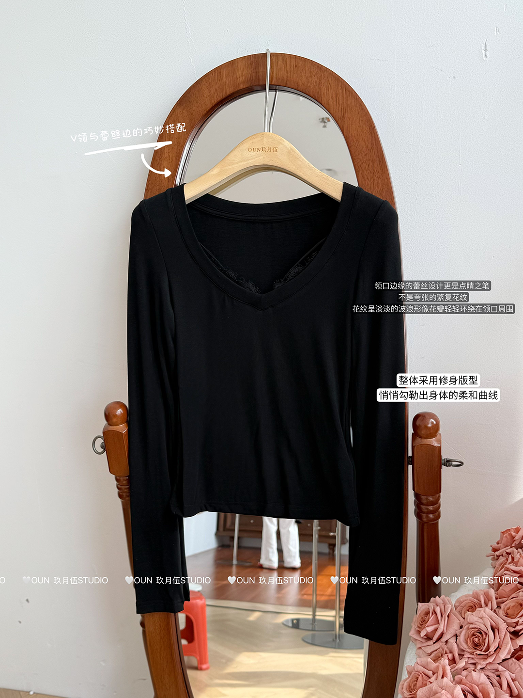 玖月伍 萊賽爾V領蕾絲花邊長袖修身打底衫百搭簡約外穿針織衫上衣