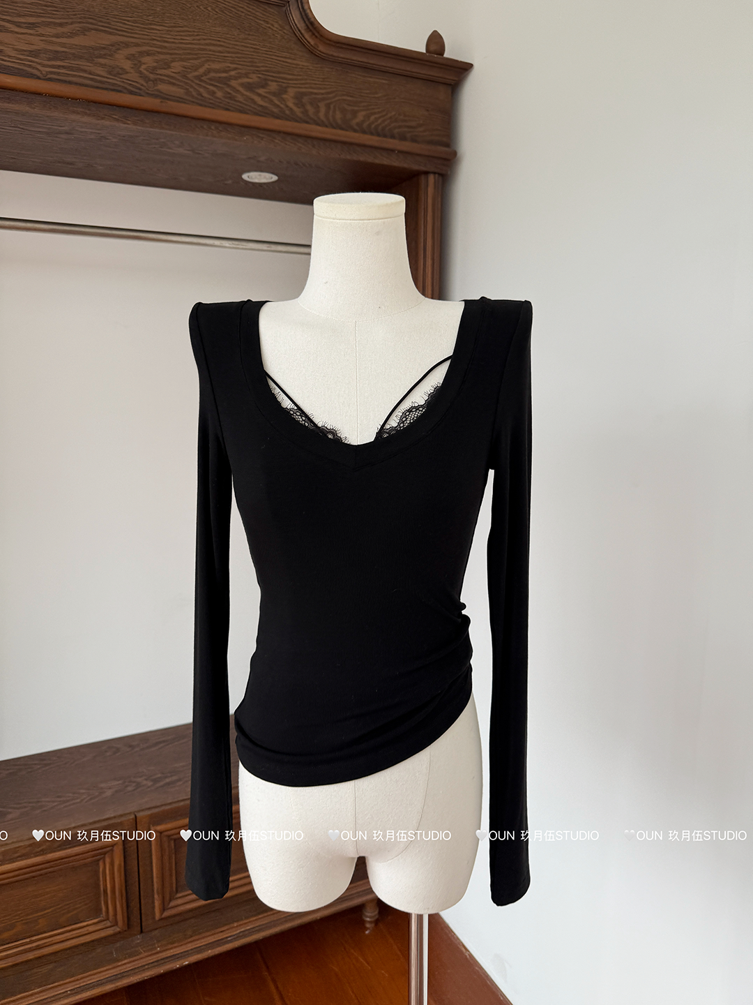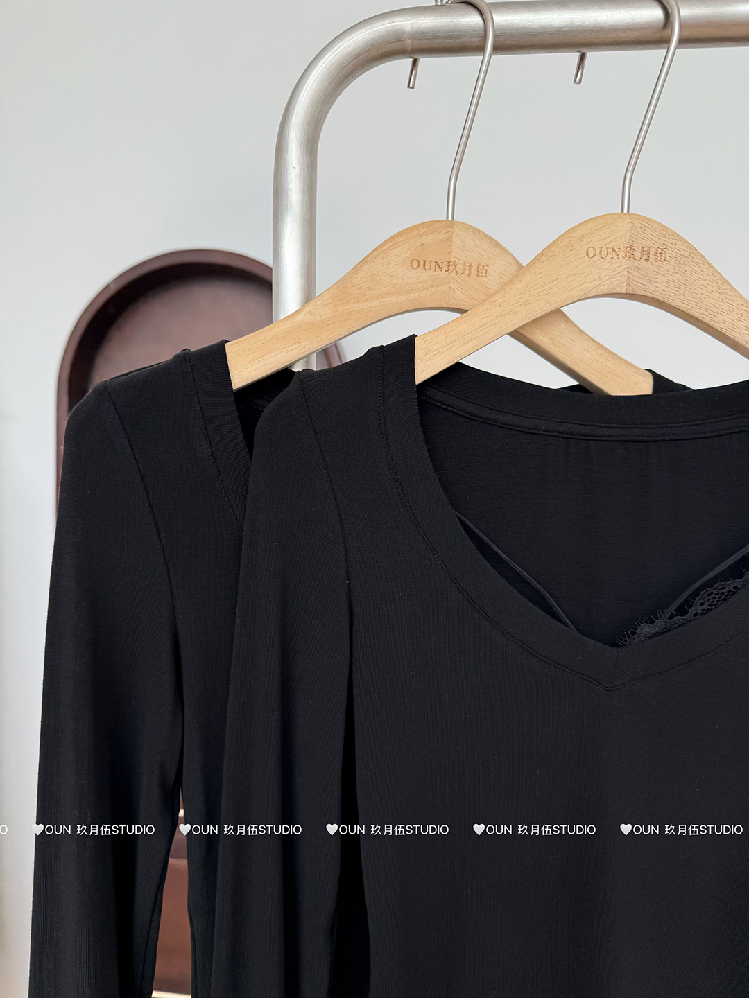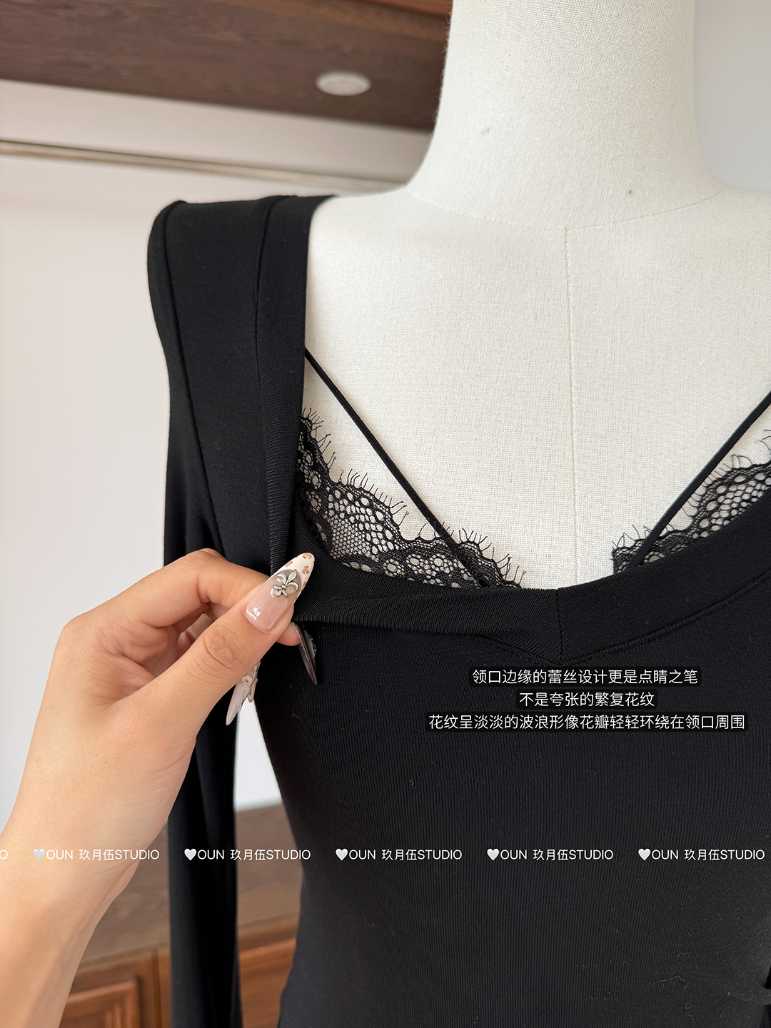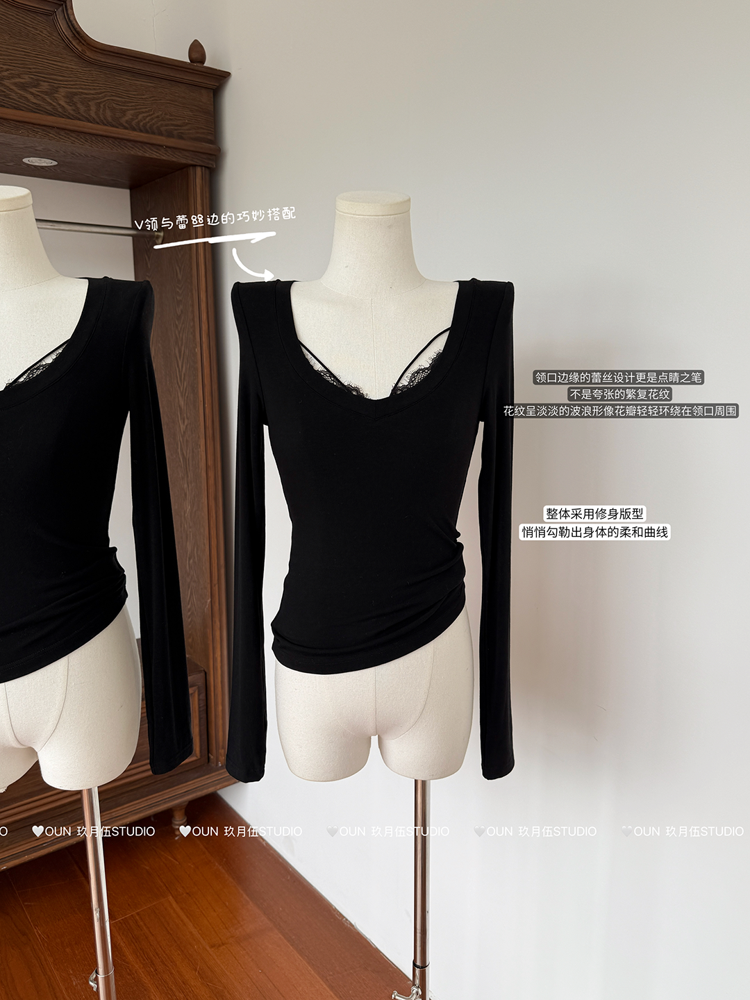 玖月伍 萊賽爾V領蕾絲花邊長袖修身打底衫百搭簡約外穿針織衫上衣