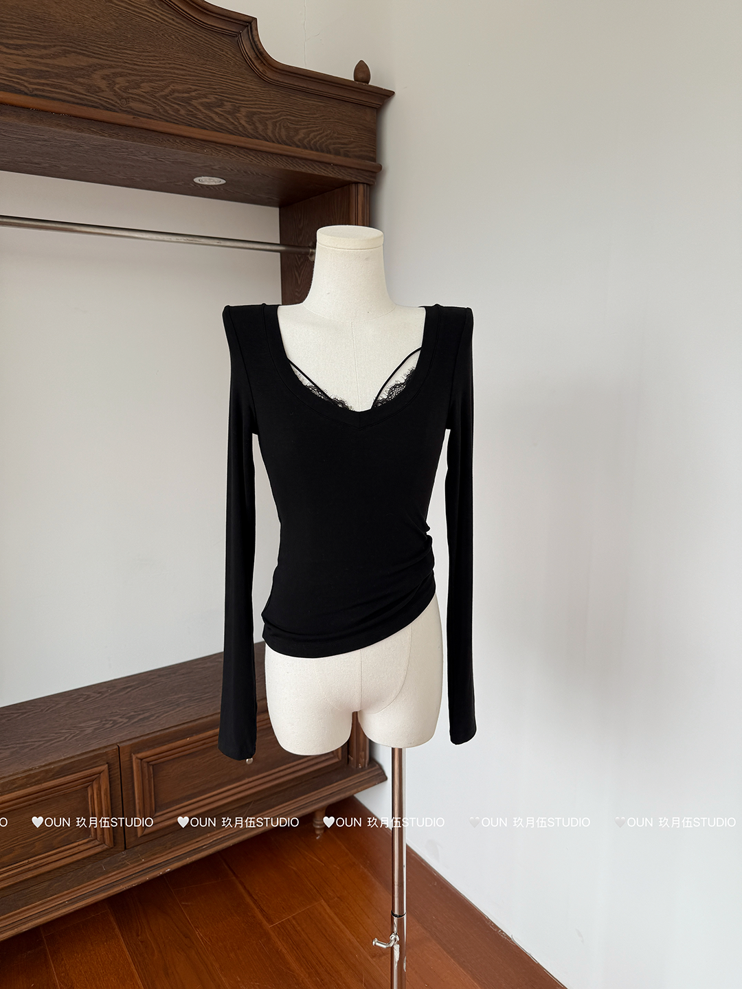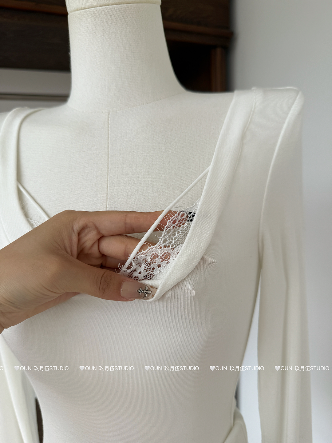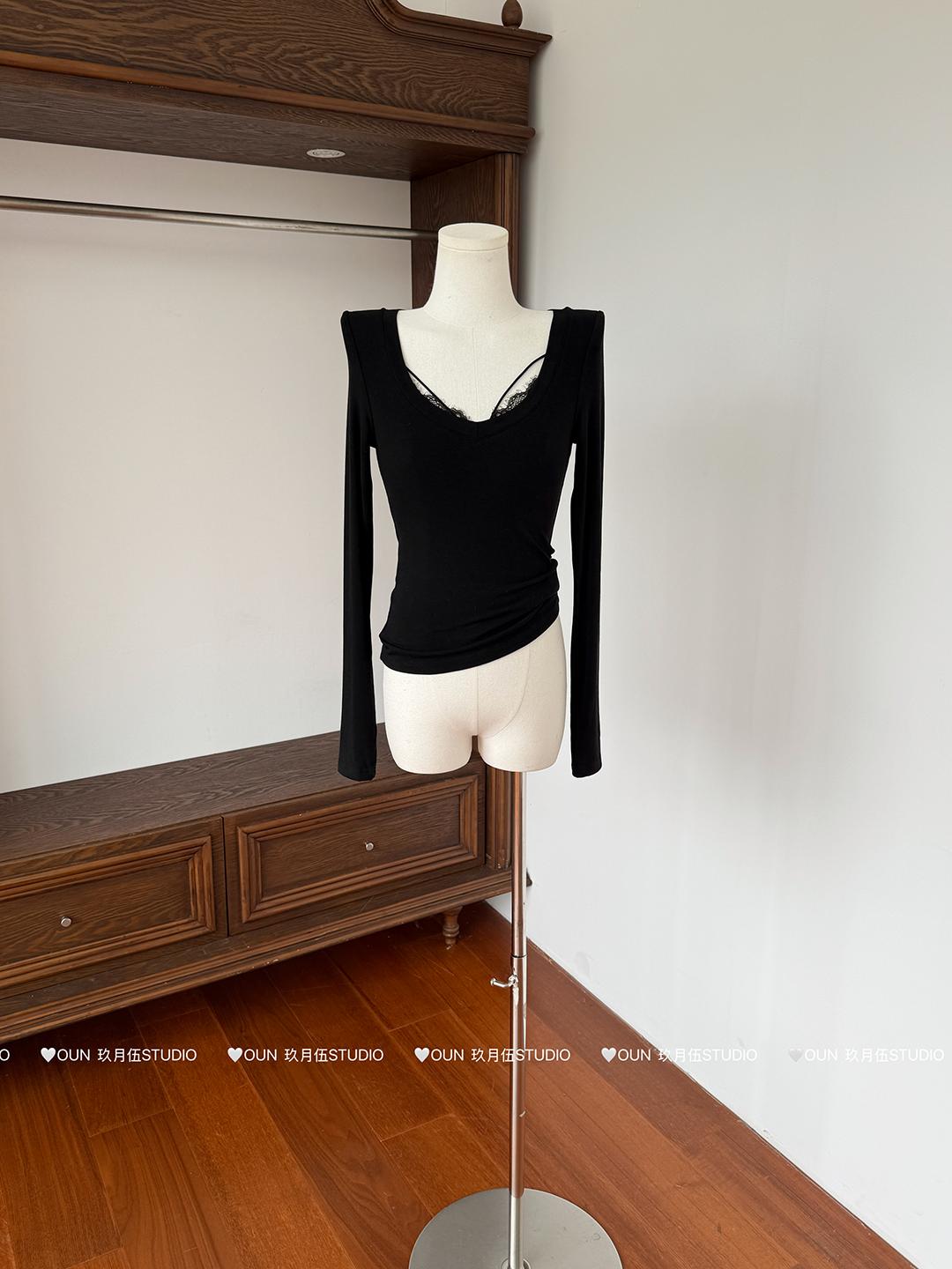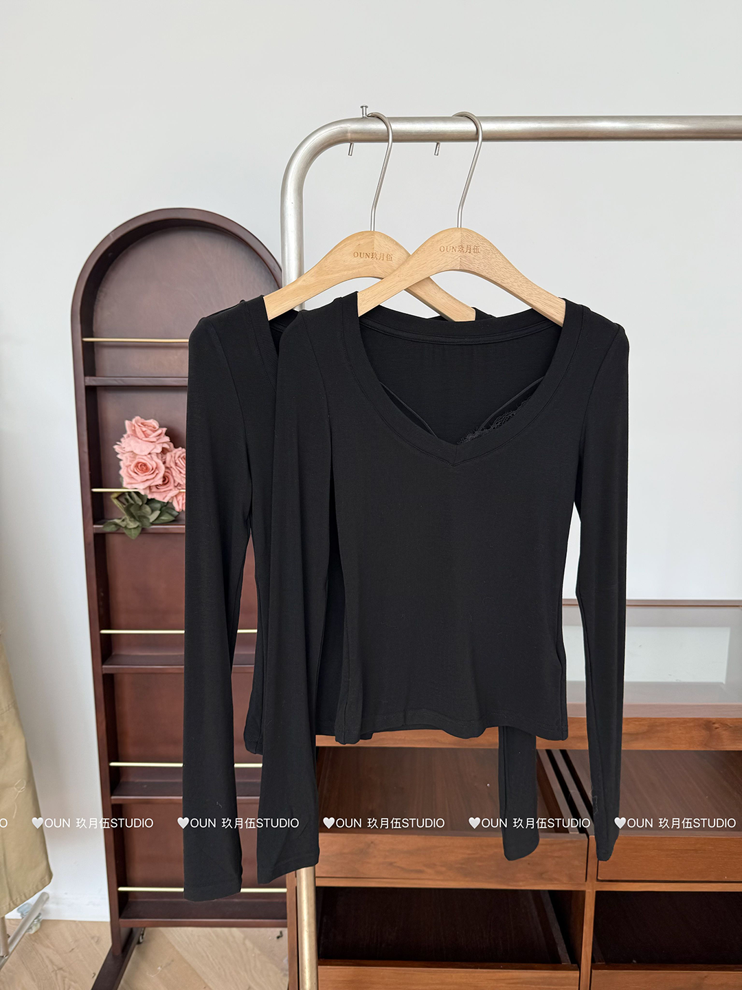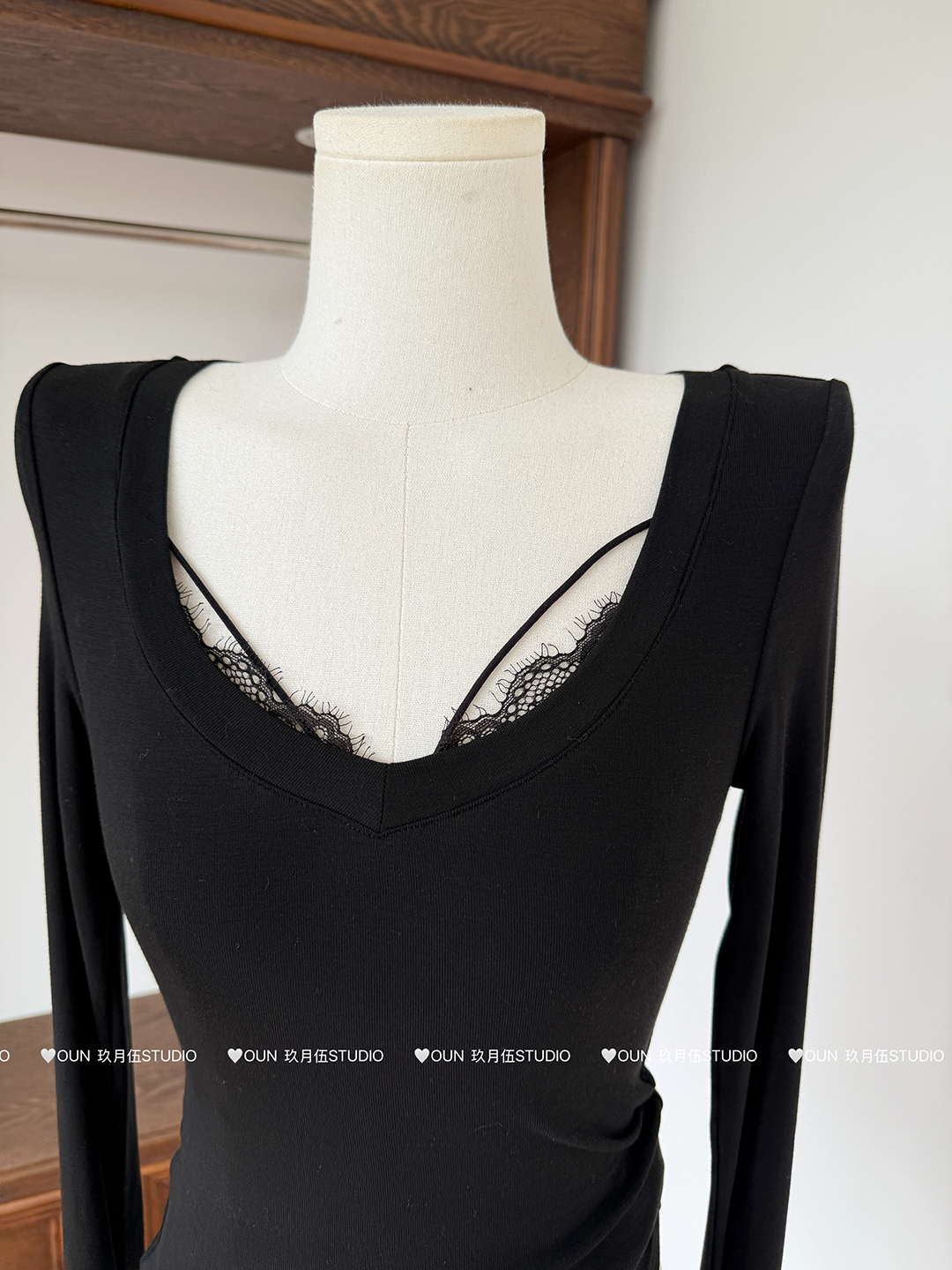 玖月伍 萊賽爾V領蕾絲花邊長袖修身打底衫百搭簡約外穿針織衫上衣