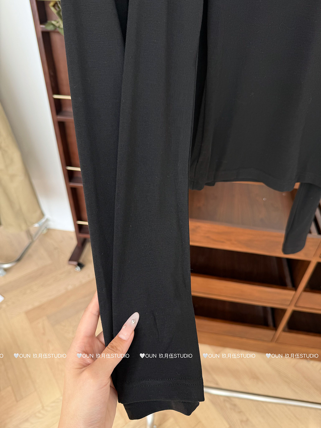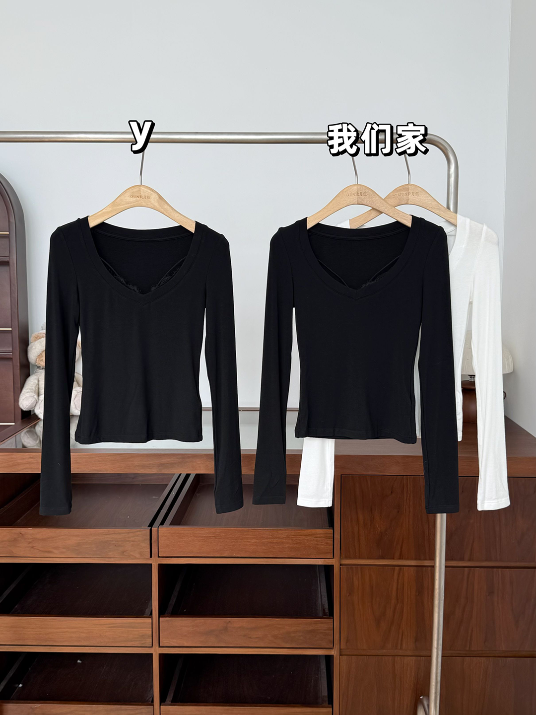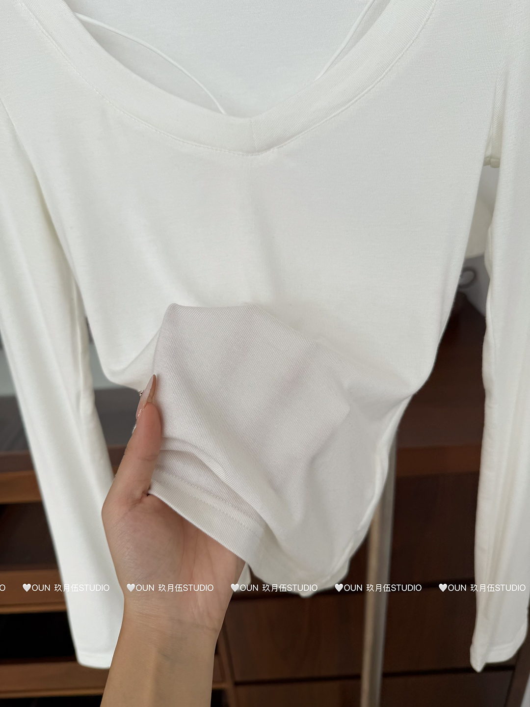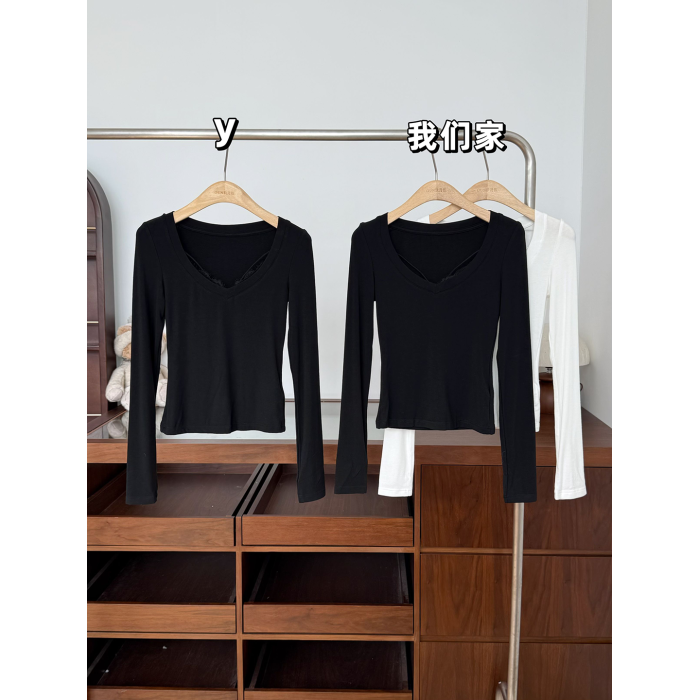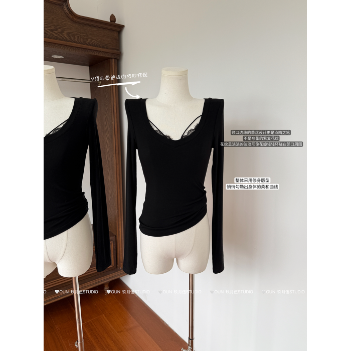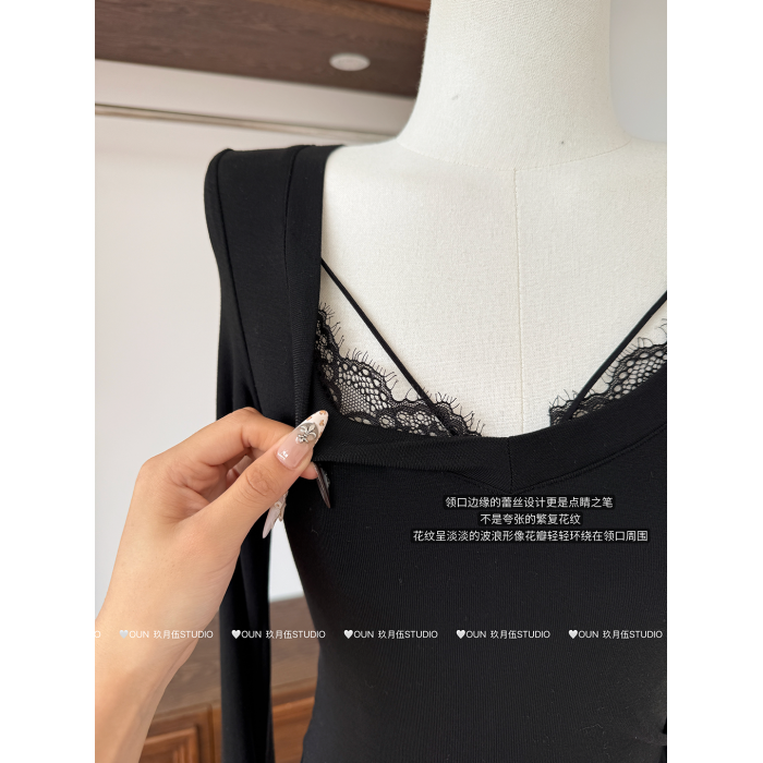 玖月伍 萊賽爾V領蕾絲花邊長袖修身打底衫百搭簡約外穿針織衫上衣