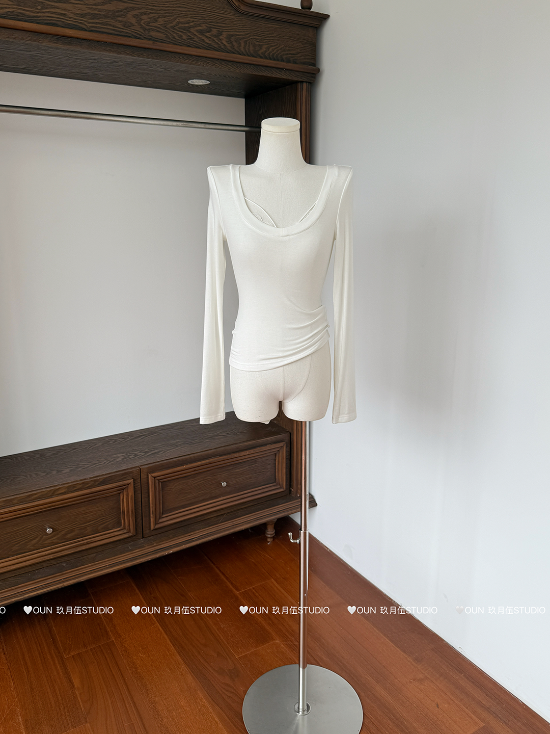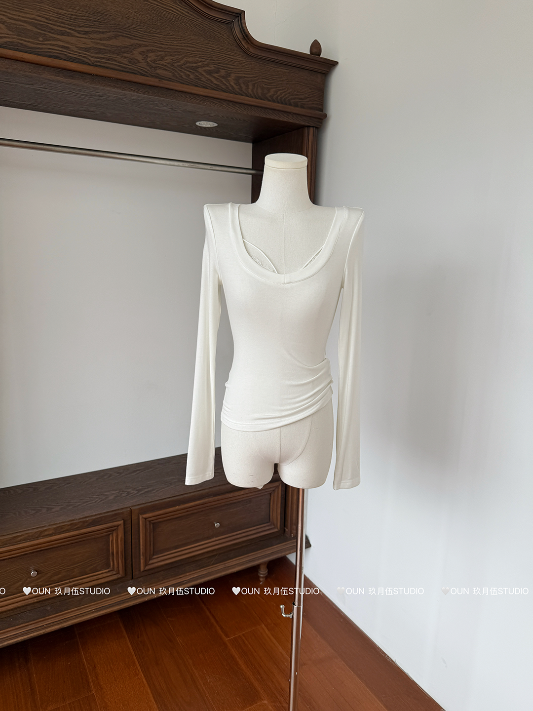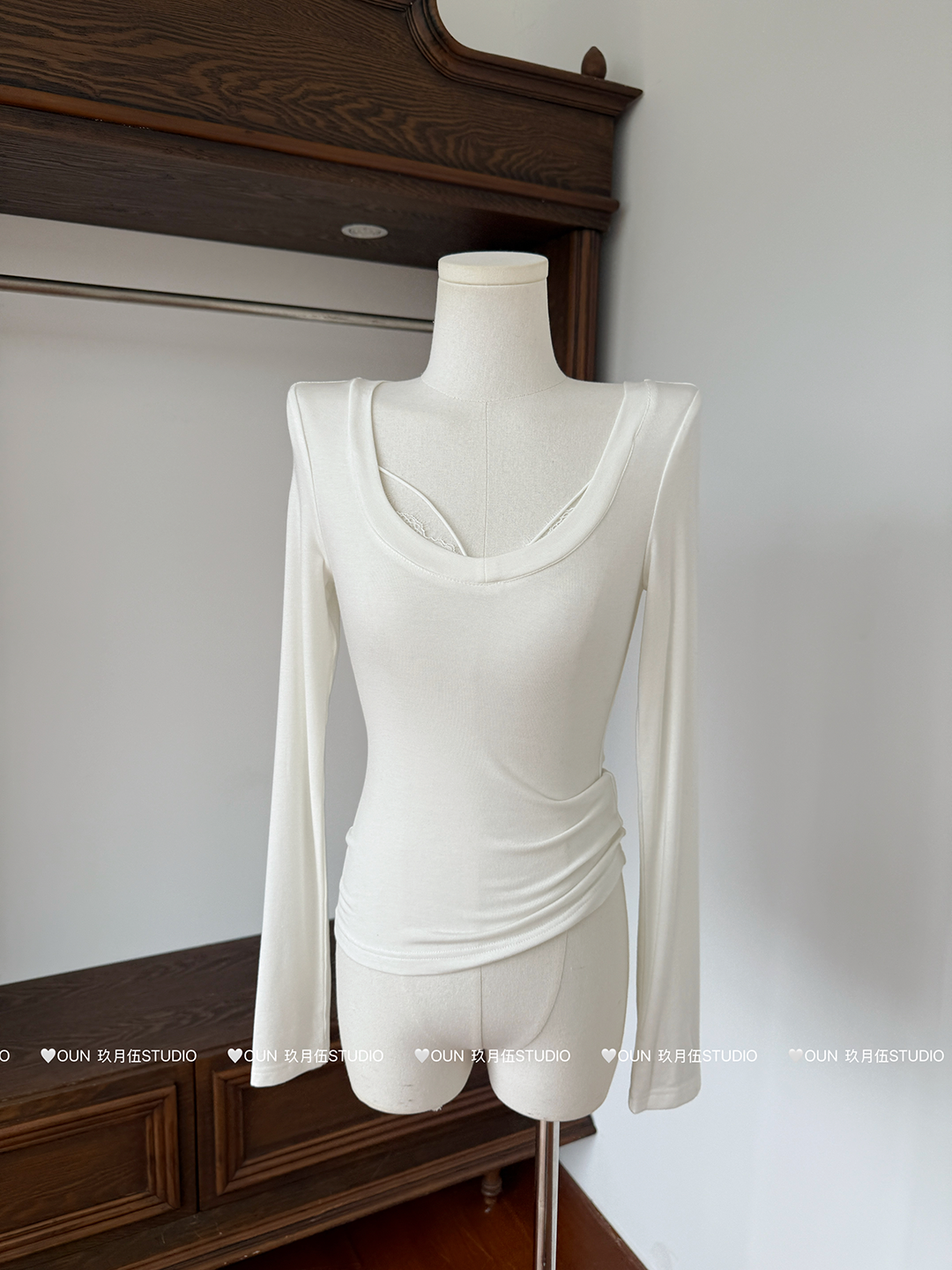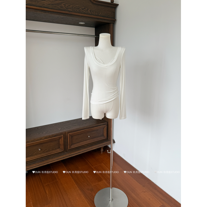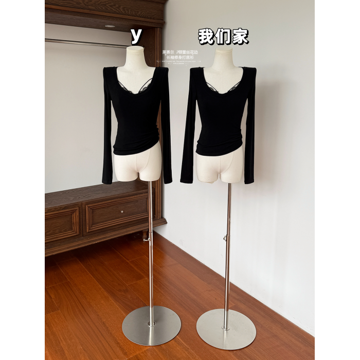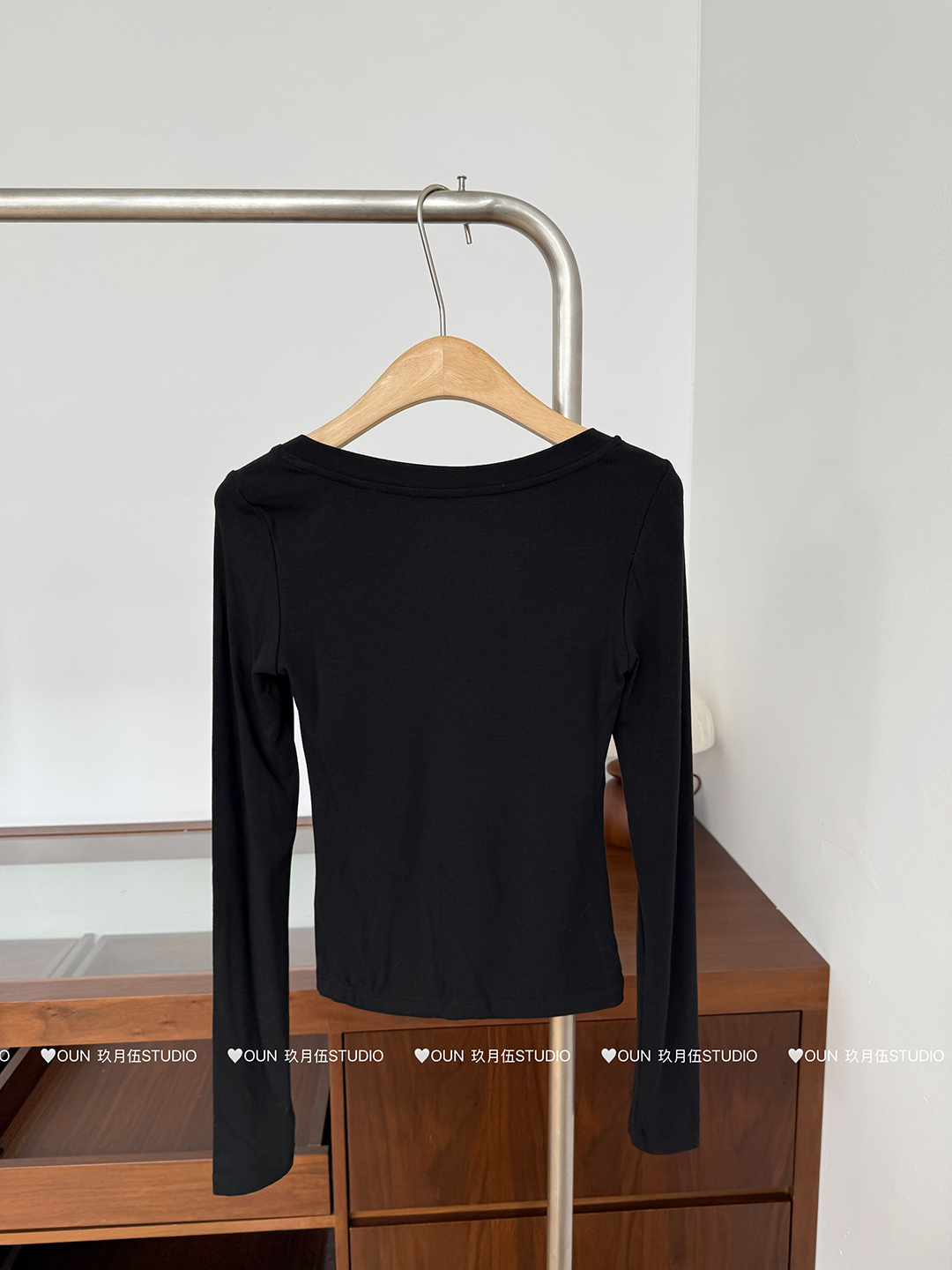 玖月伍 萊賽爾V領蕾絲花邊長袖修身打底衫百搭簡約外穿針織衫上衣