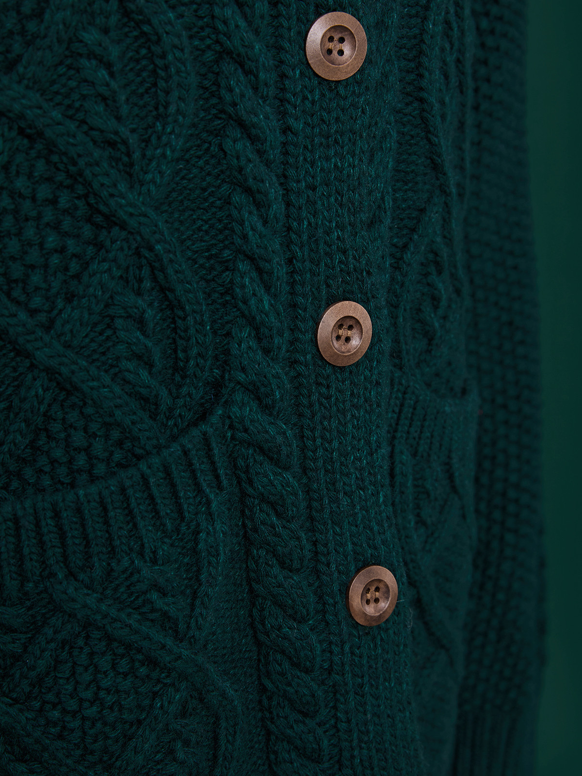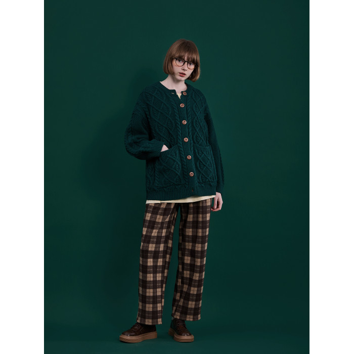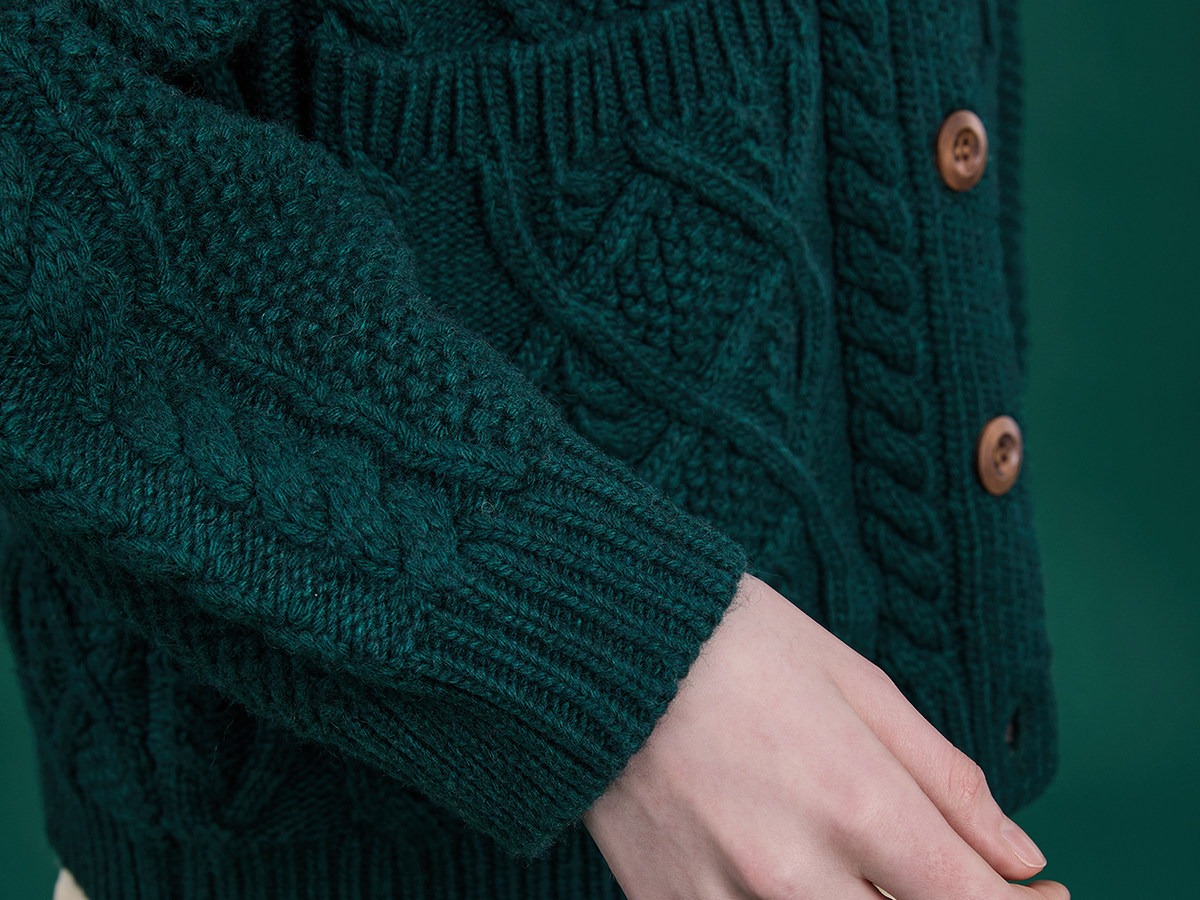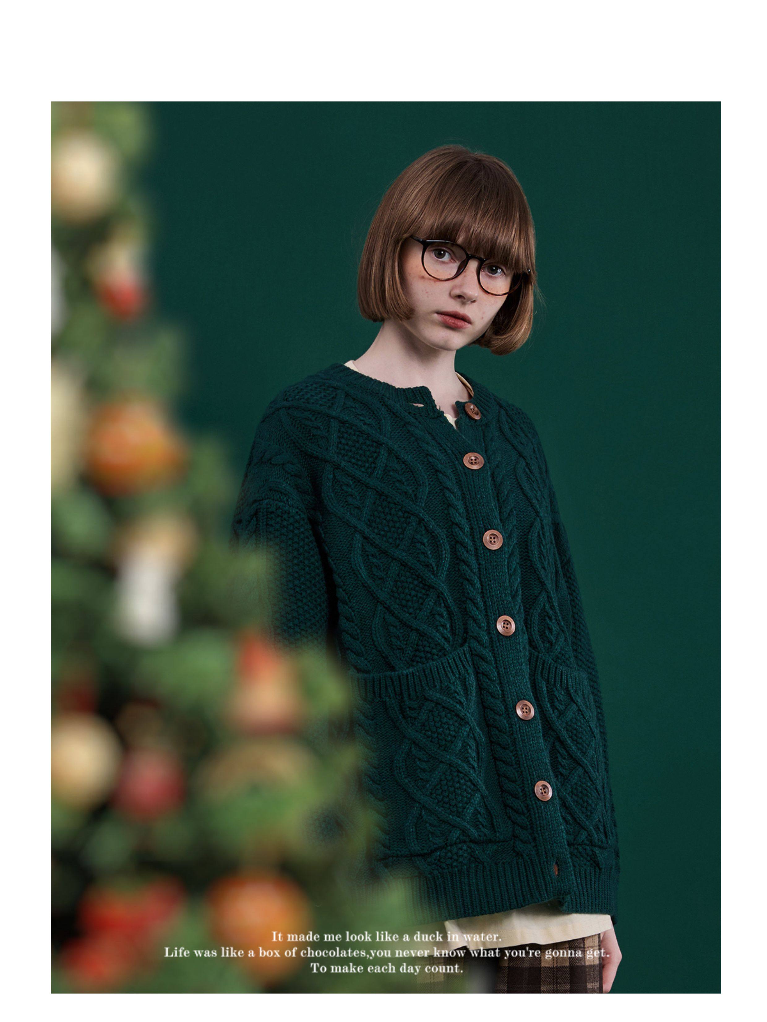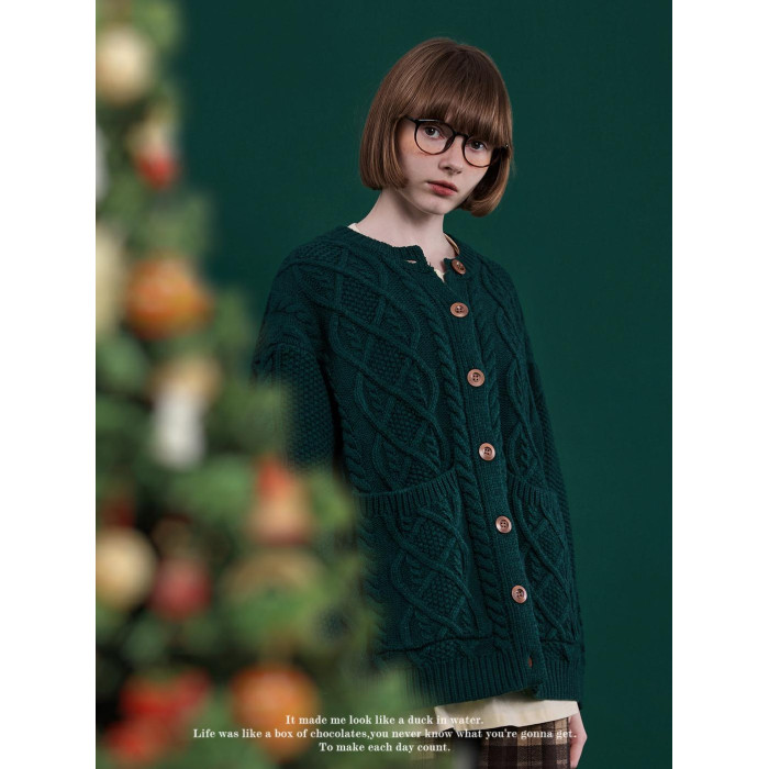 柒年原創羊毛英倫聖誕綠木釦開衫棒針費爾島毛衣祖母風絞花紋毛衣