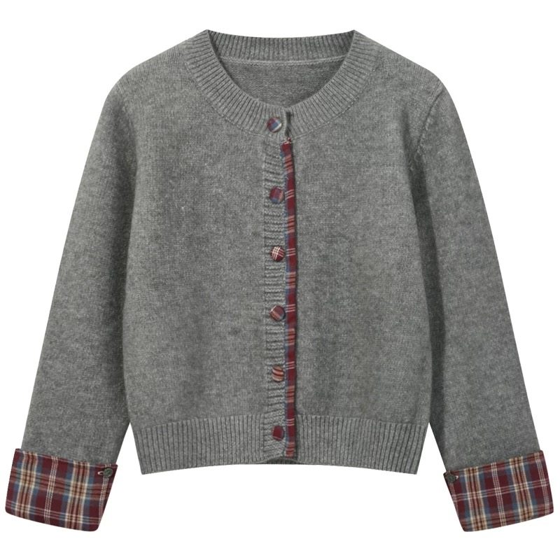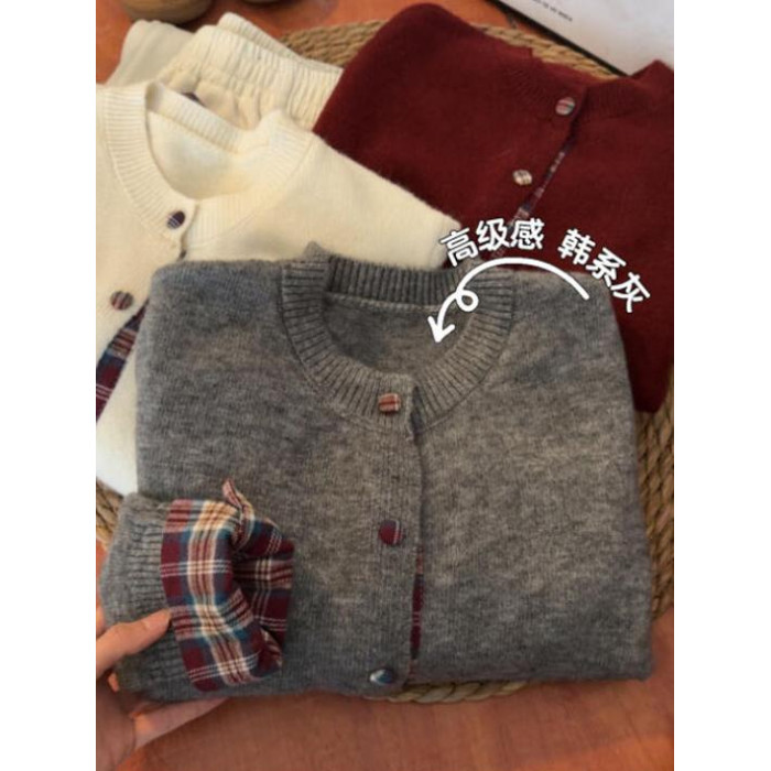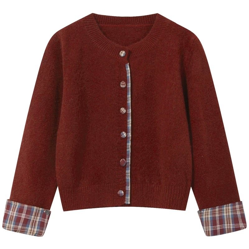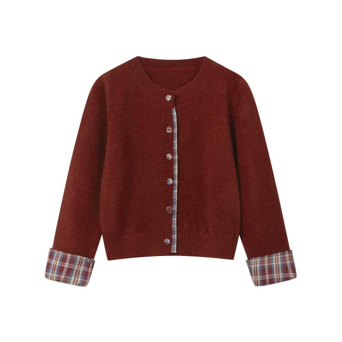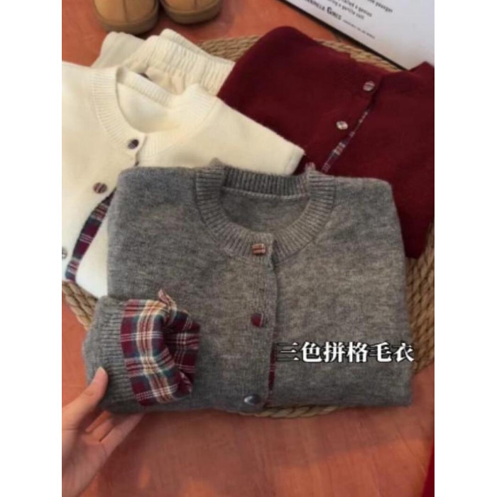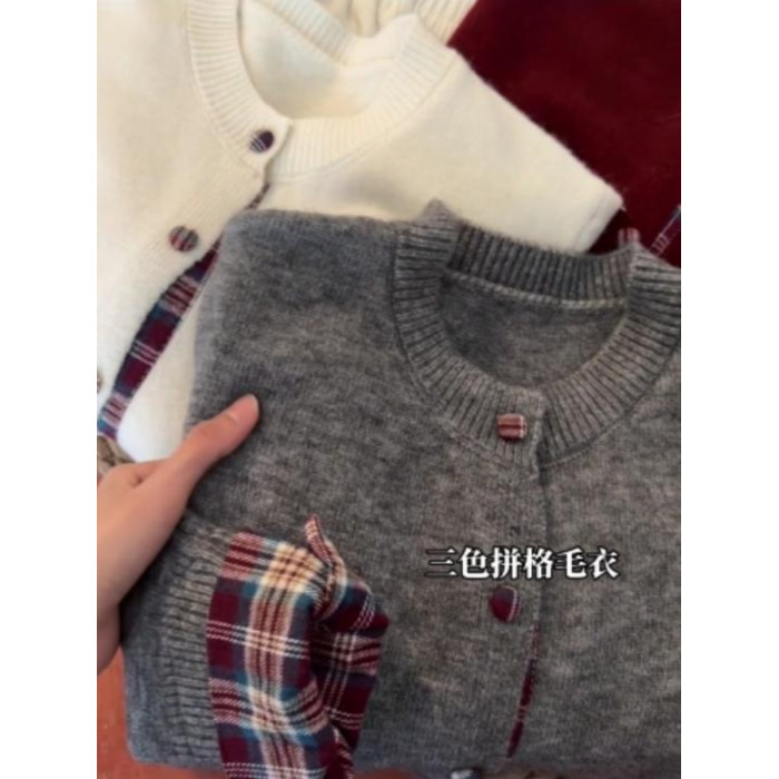 韓系圓領格子拼接假兩件針織衫毛衣女外套秋冬聖誕紅寬松休閒開衫
