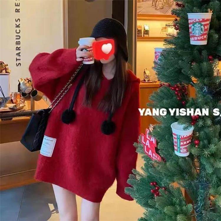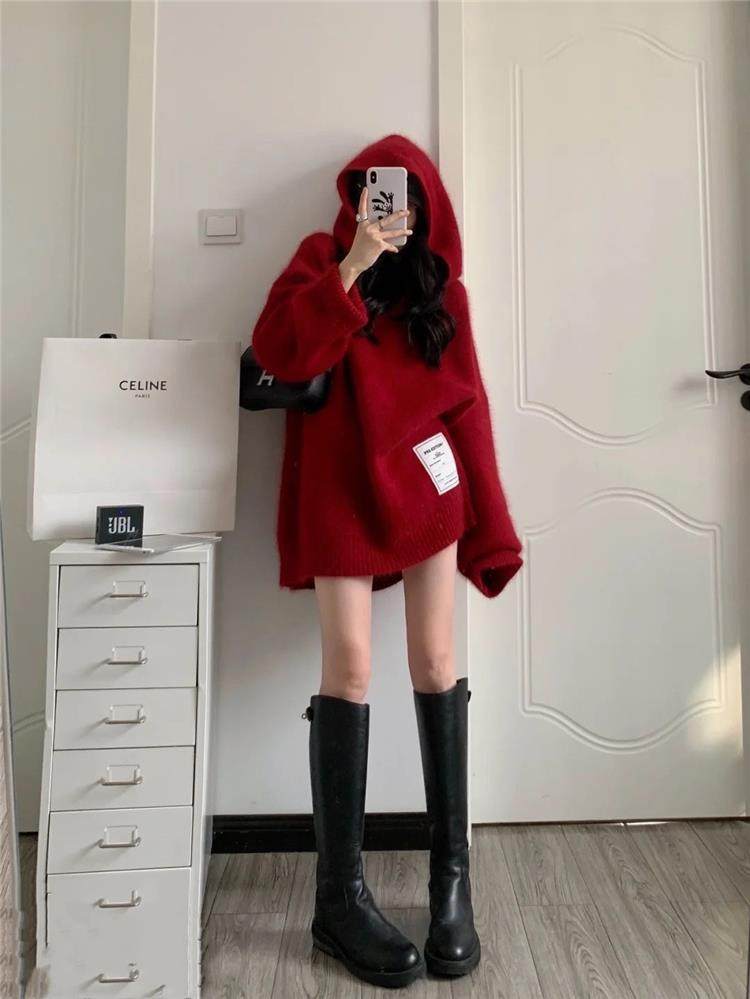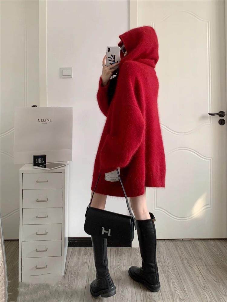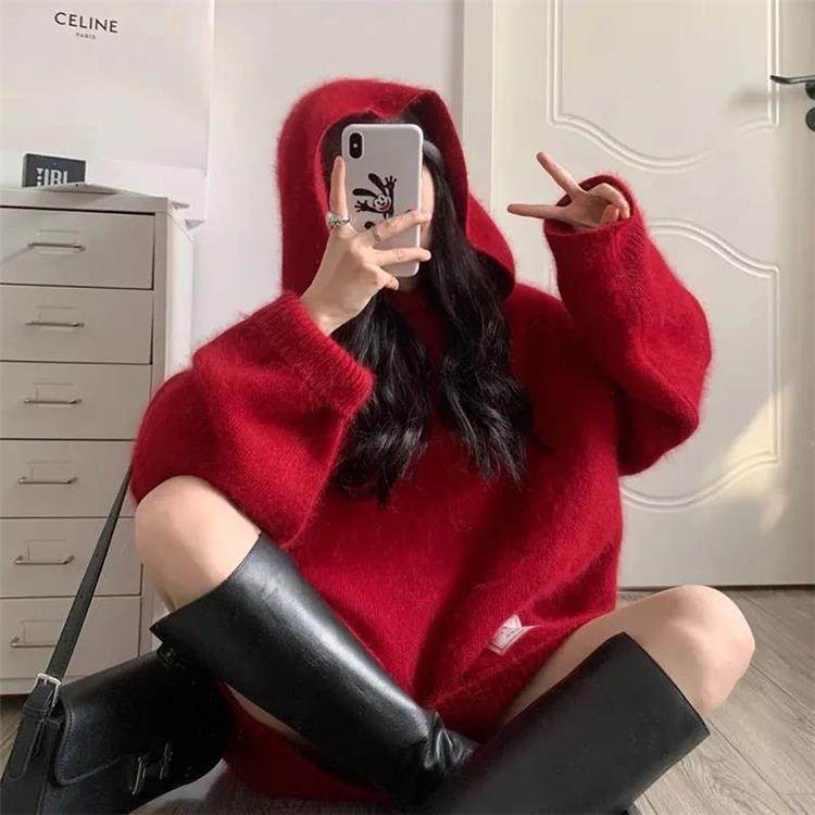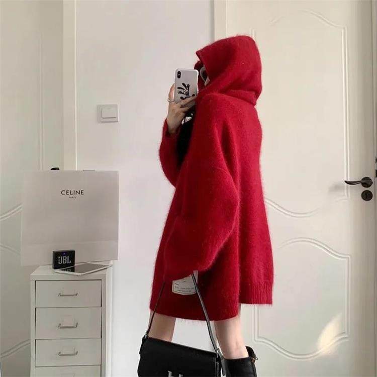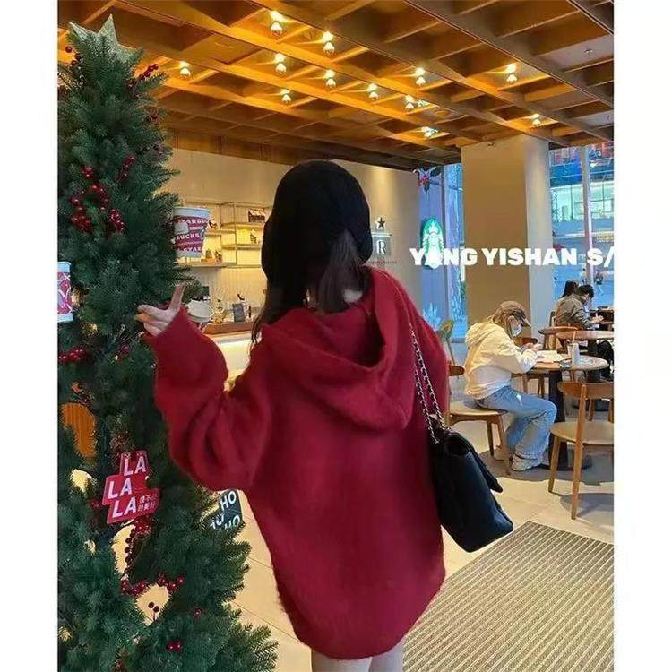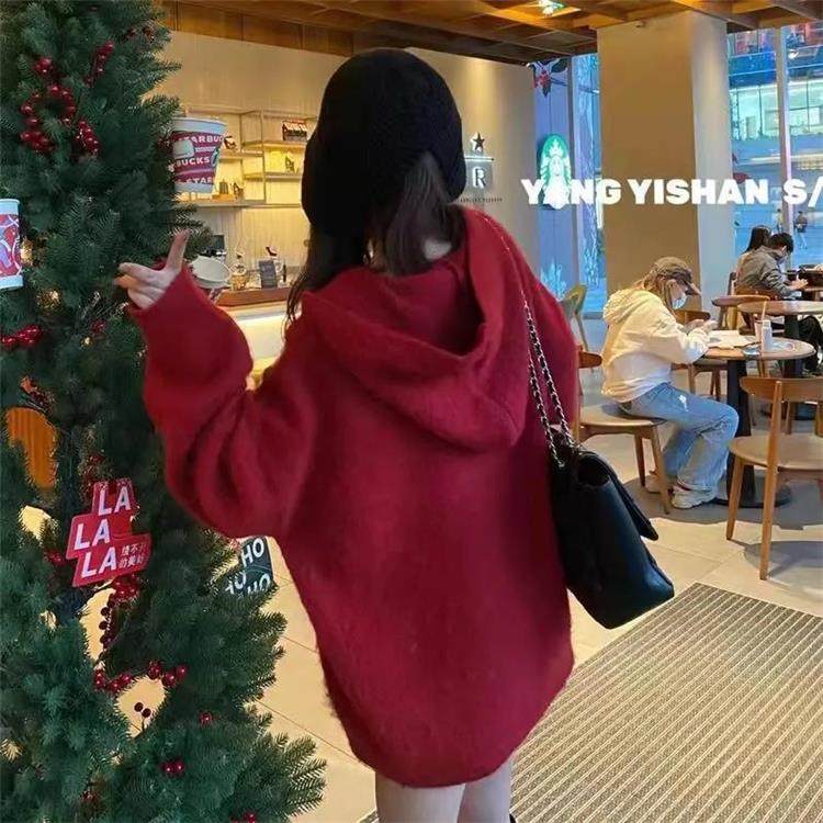 【非常厚】75-300斤加大碼2023秋冬季新款連帽外套聖誕紅色毛衣女